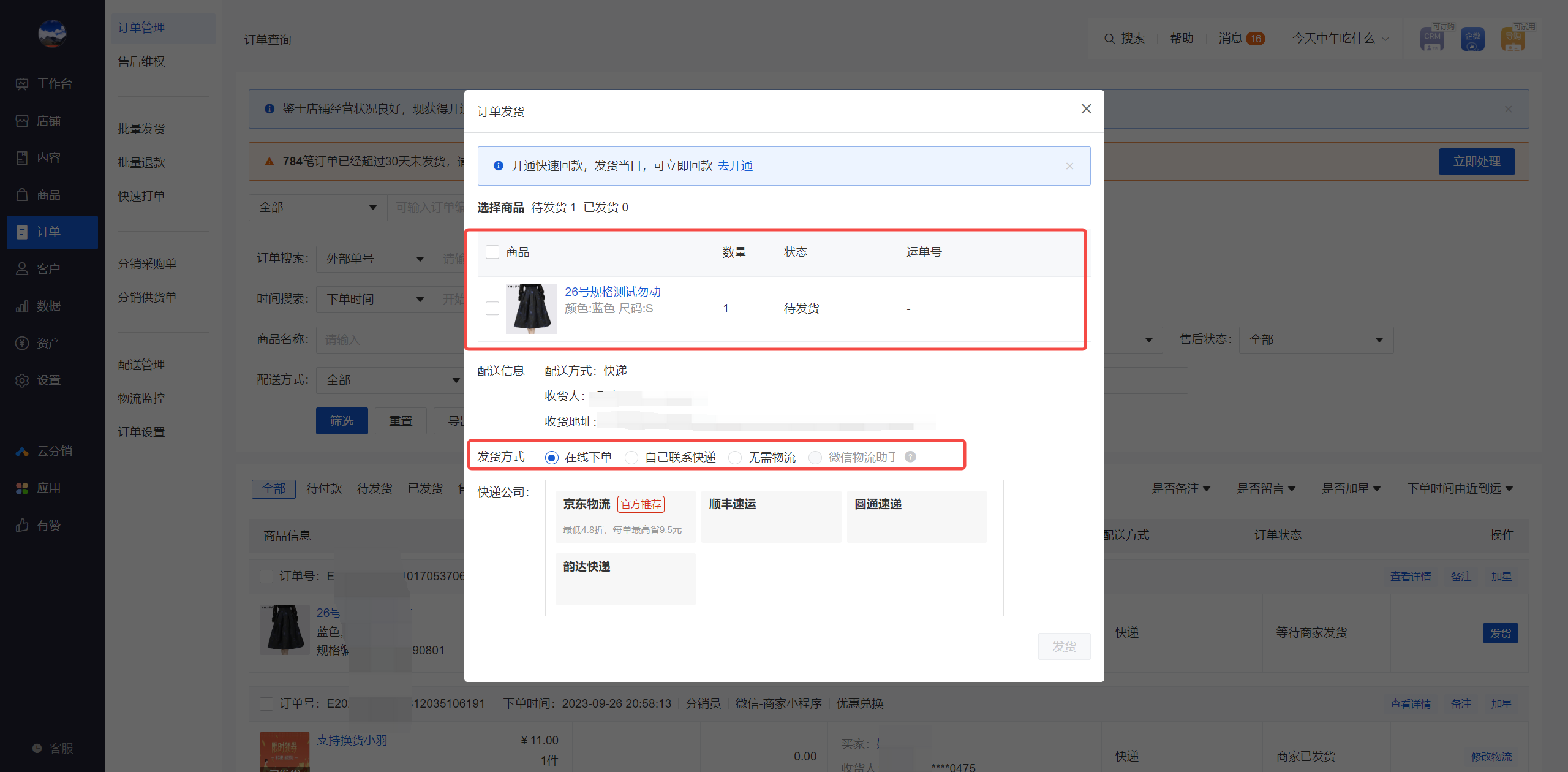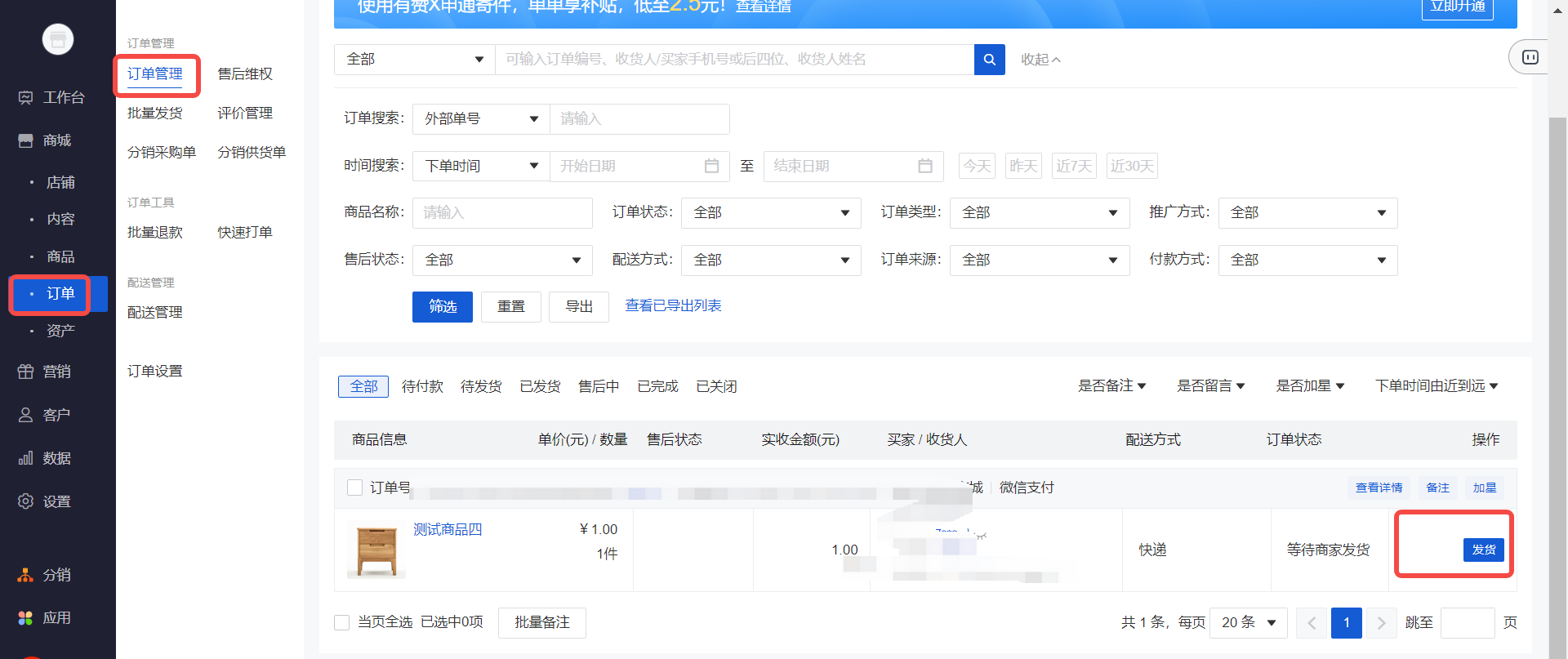 操作路径:商城电脑端后台-订单管理,找到待发货的订单并点击发货