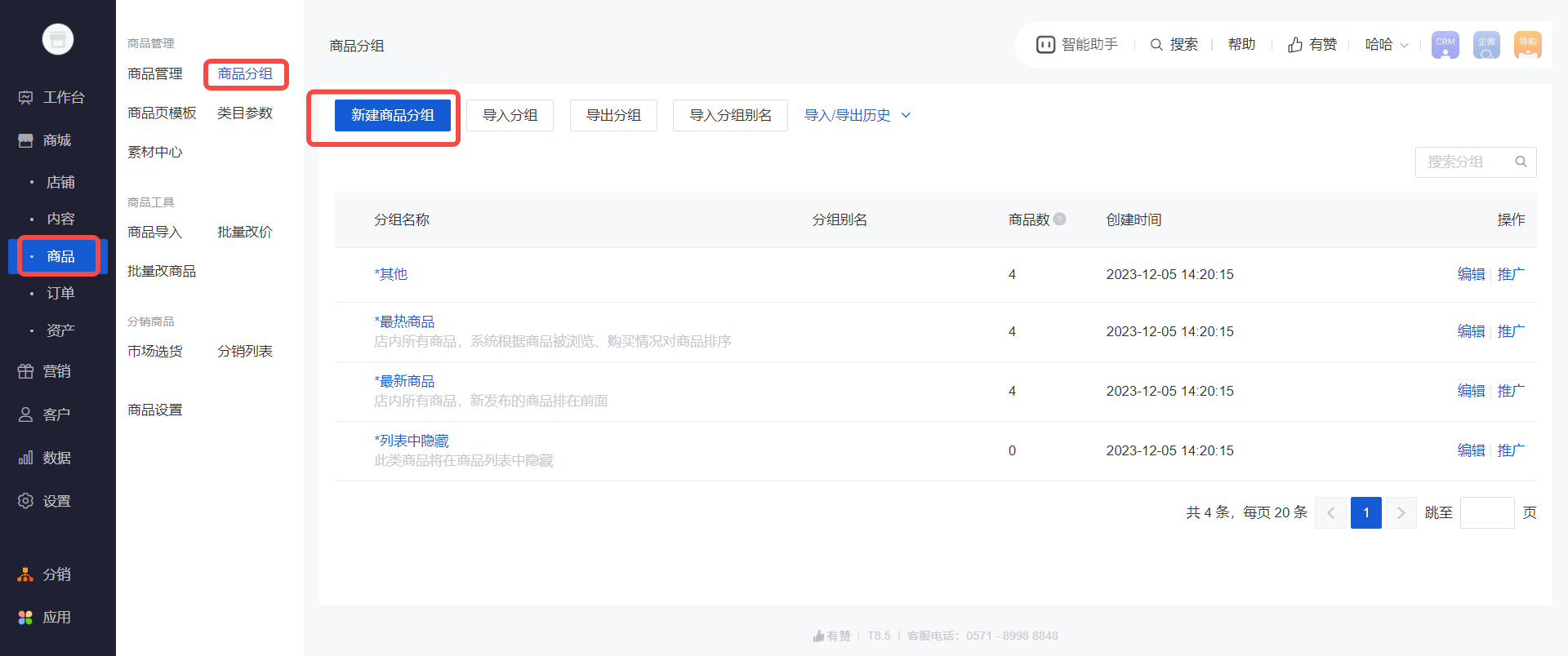 操作路径:商城电脑端后台-商品-商品分组-新建商品分组,进行新建\编辑。