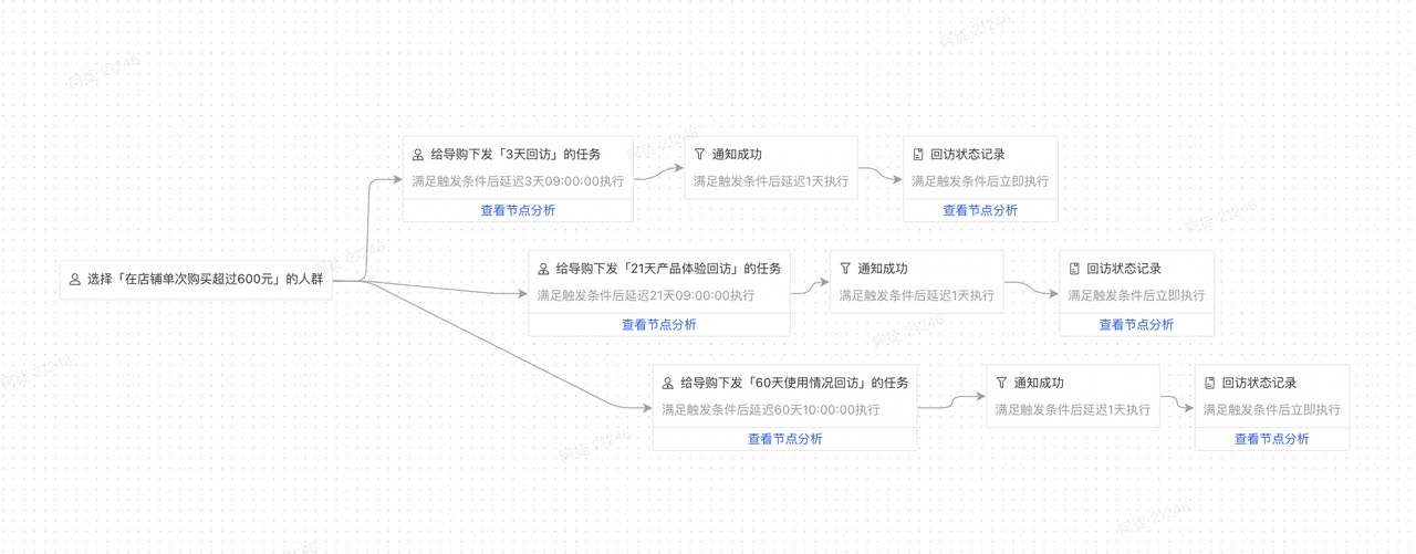 品牌配置导购售后服务关怀链路,针对在店铺单次购买超过6010元的人群,在第3天、第21天、第60天做使用感受回访,并记录三次回访的回访状态,为后链路运营做基础。