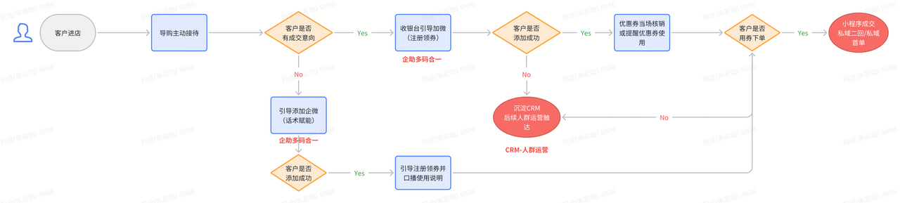 导购是接待用户、引导添加企业微信的主要角色,通过渠道活码进行私域沉淀需要会员部和门店事业部的相互配合。因为门店客流量较大,导购日常店务繁忙,所以执行侧希望尽可能简化沉淀链路,节省导购和消费者的时间。最终确认流程顺序为"加企业微信好友-注册会员"。具体链路如下: