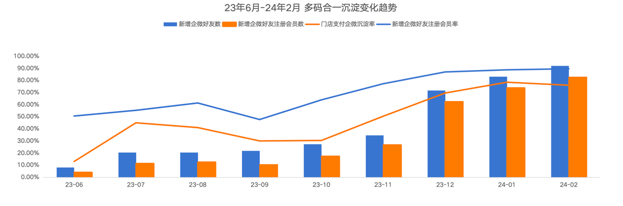 1.利用「多码合一」功能,提升公转私沉淀效率,门店成交客户企全微沉淀率从13.1%提升至78.5%