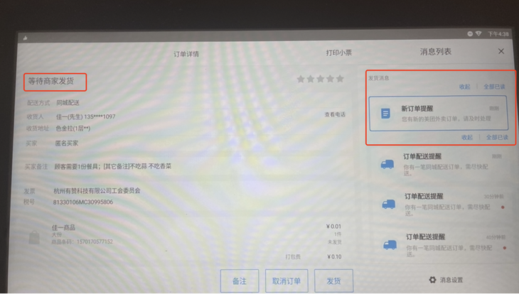 b. 实现多个渠道订单打印、备货、发货、开发票;支持 POS/APP/PC等多终端处理订单发货、退款申请以及催单信息等操作