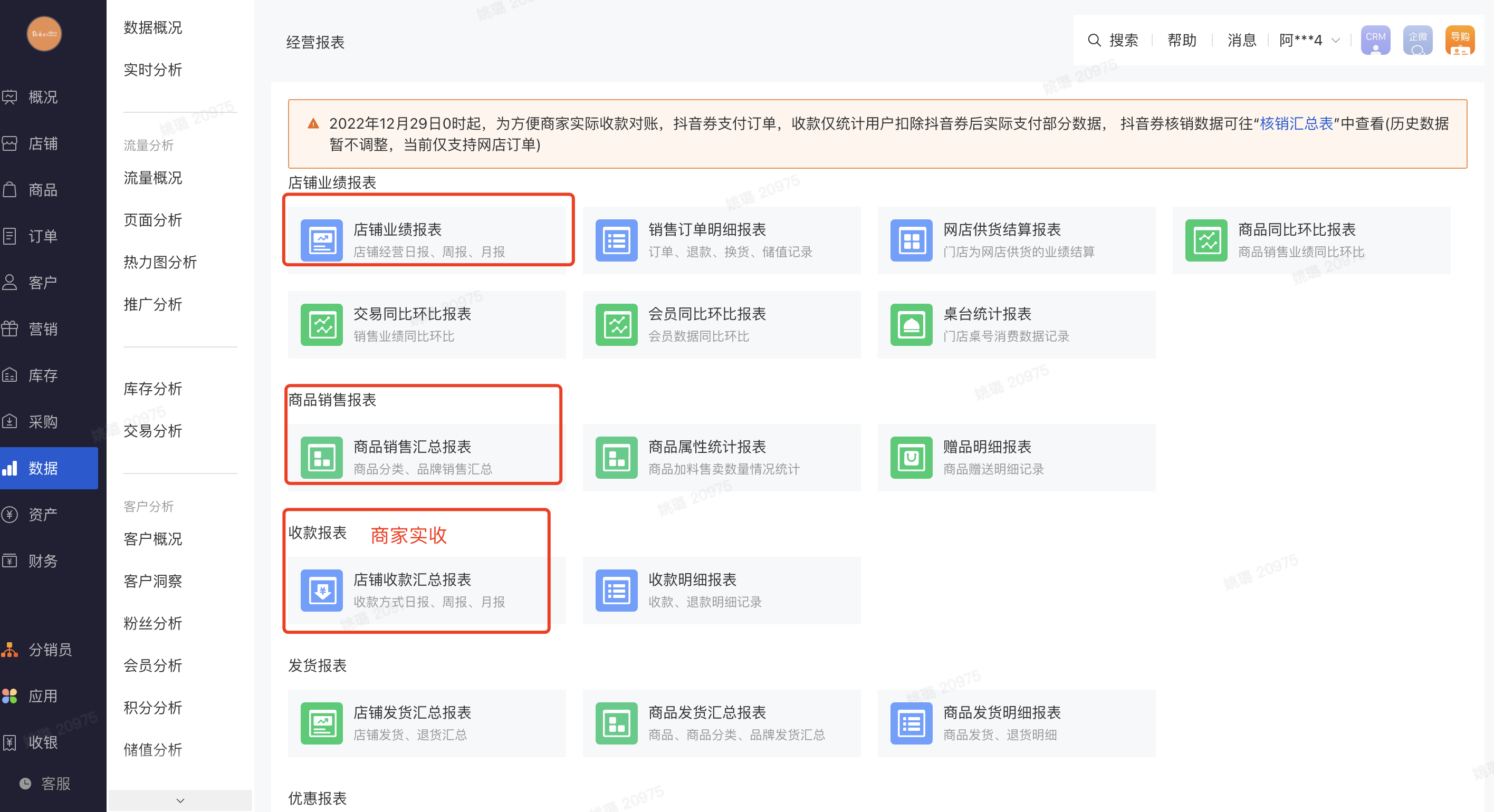 1. 营业额和营业收入:常用店铺业绩报表、商品销售汇总报表、店铺收款汇总报表