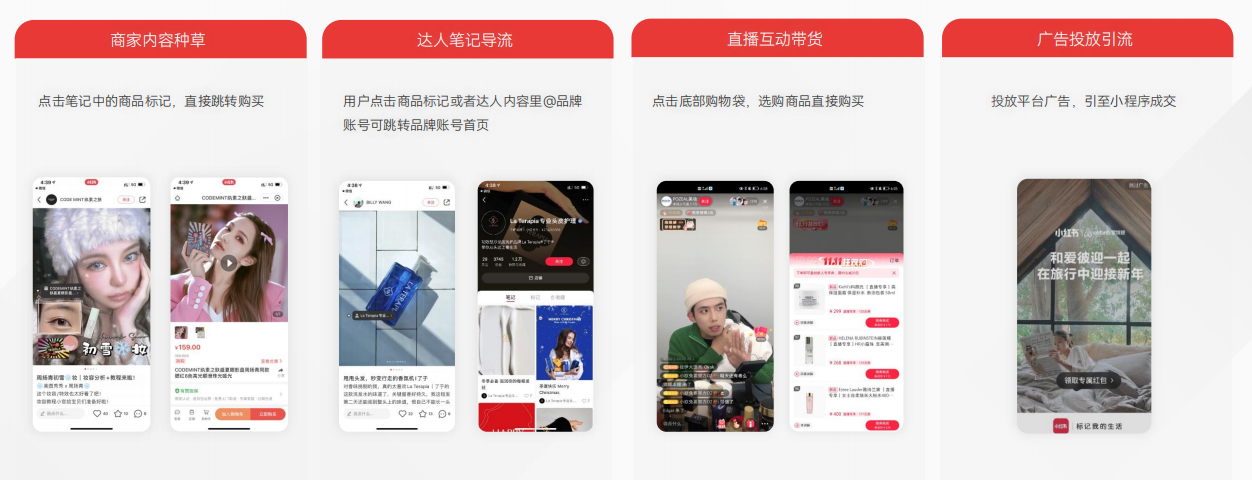 小红书内容种草、达人笔记导流、直播互动带货和广告投放引流,用户点击笔记中的商品标记即可直接购买,在1亿月活用户的种草基地,从种草到下单只需15秒。