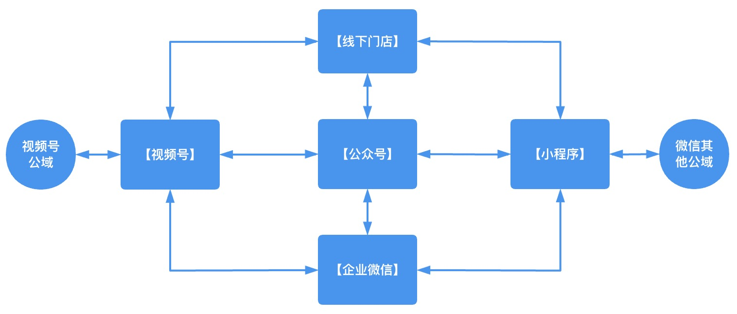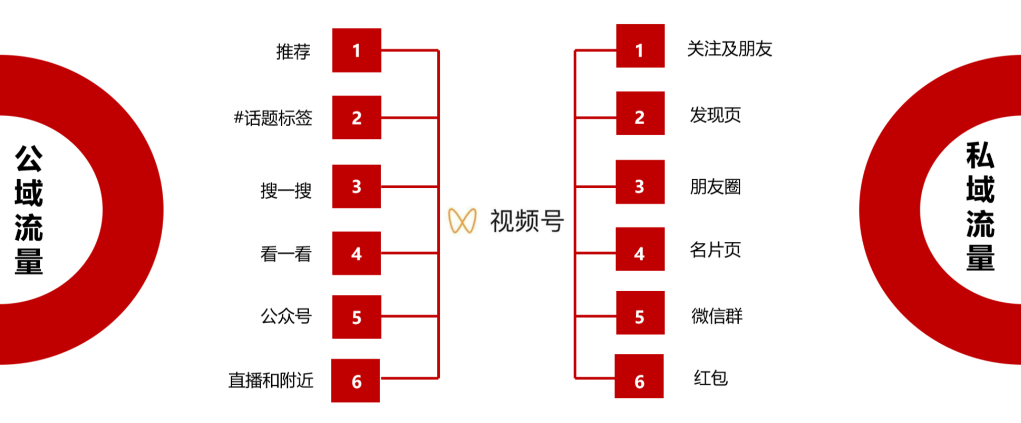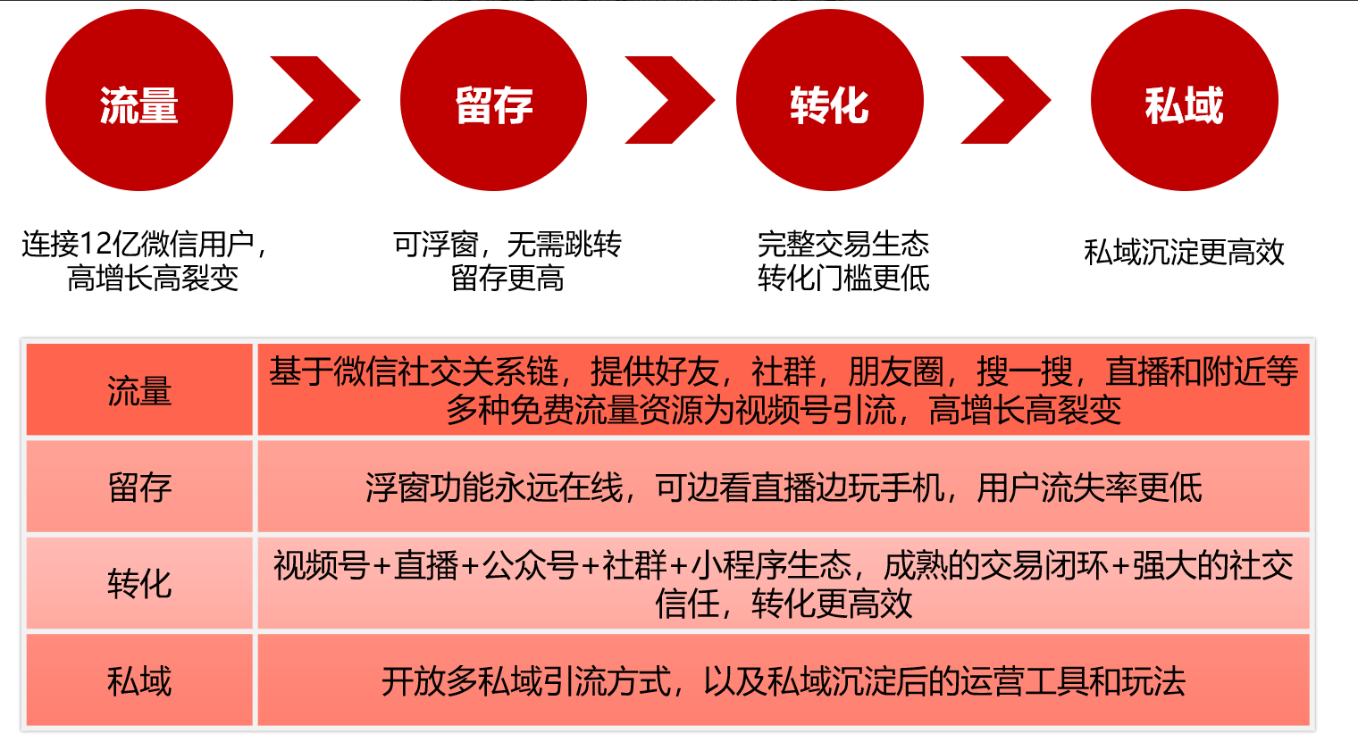 视频号打通微信公私域,原有私域可0成本启动,借助直播载体提升销量,私域可以撬动公域流量,由公域引入的粉丝又可以沉淀到私域,持续运营复购。