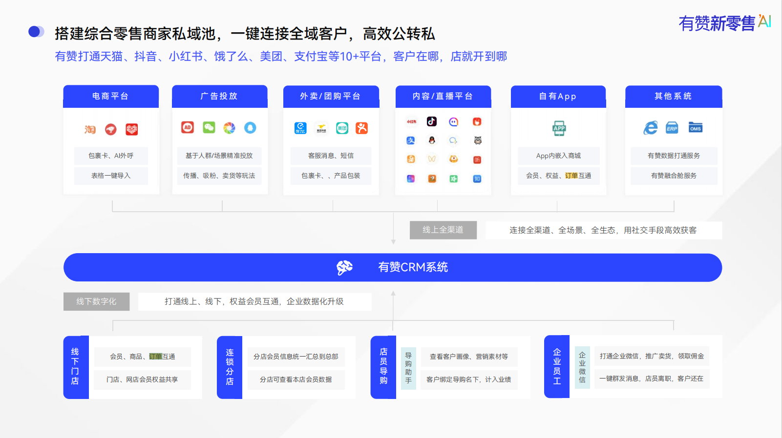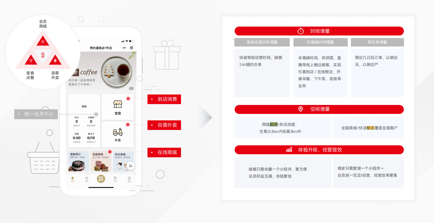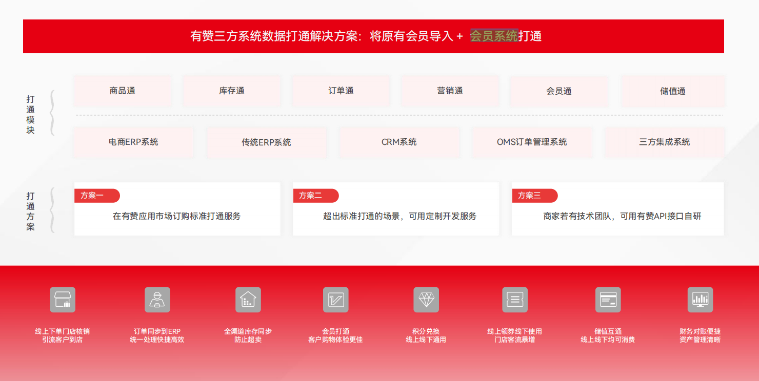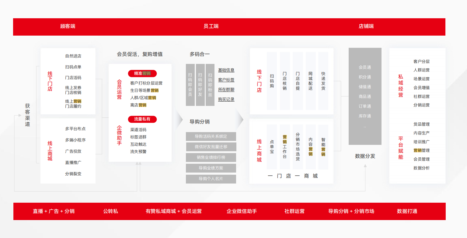 会员管理与营销 • 统一会员管理:线上线下会员体系打通,实现会员权益的统一管理。 • 积分、储值、优惠券互通:会员积分、储值和优惠券可在线上线下通用,提升客户粘性。 • 精准营销:通过会员数据分析,进行精准营销,提高客户忠诚度。 私域流量运营 • 私域商城与社群运营:通过微信小程序、企业微信助手等工具,沉淀私域流量,进行精细化运营。 • 多平台引流:整合微信、支付宝、小红书等推广渠道,将客户引流至私域商城。 |