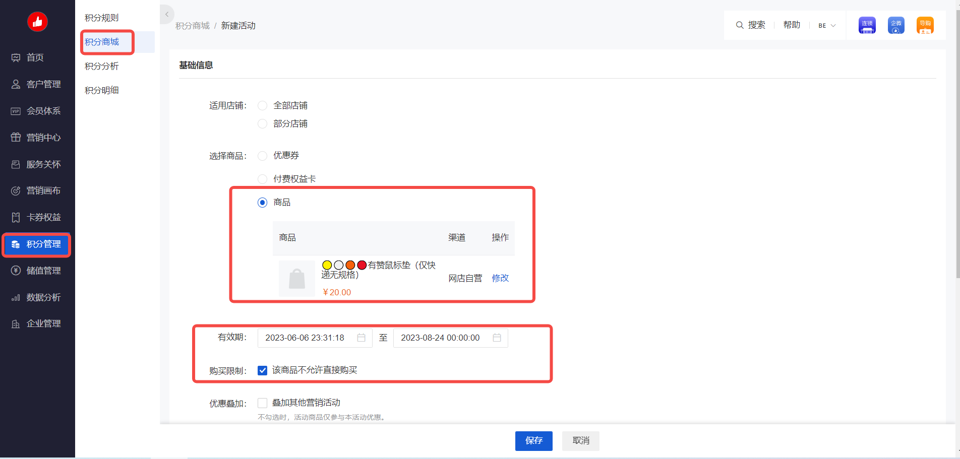 | step1:CRM-积分管理-积分商城-新建活动 兑换类型(优惠券/付费权益卡/商品)