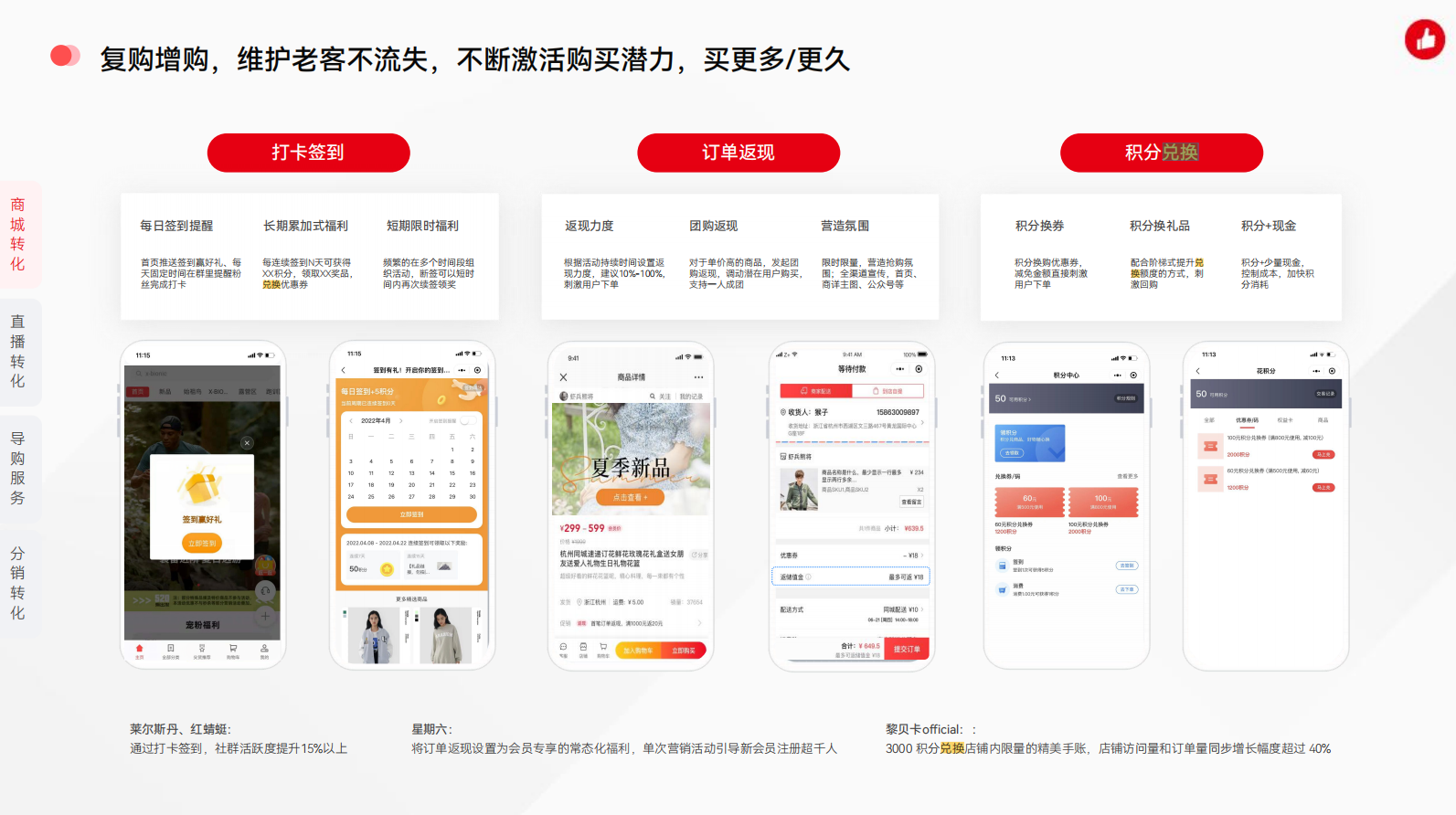 积分最大的好处就是成本可控,客户感知性强。通过各类互动玩法,引导客户参与其中获取积分;搭配一系列兑换变现规则, 让客户充分感受积分价值,从而持续活跃。积分消耗率建议20-30%左右。