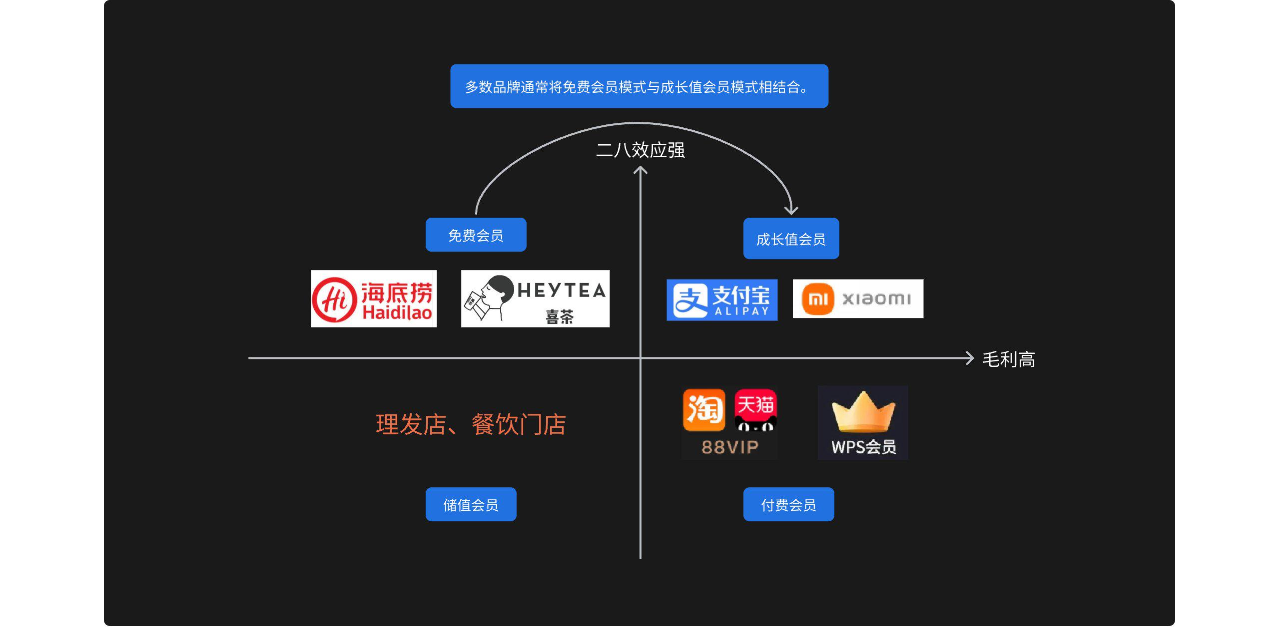 4. 储值会员模式:用户预先在商家储值一定金额,储值金额可用于消费,储值会员可能享有额外的优惠、返现或积分奖励,常见品牌:绝大多数理发店,餐饮店。