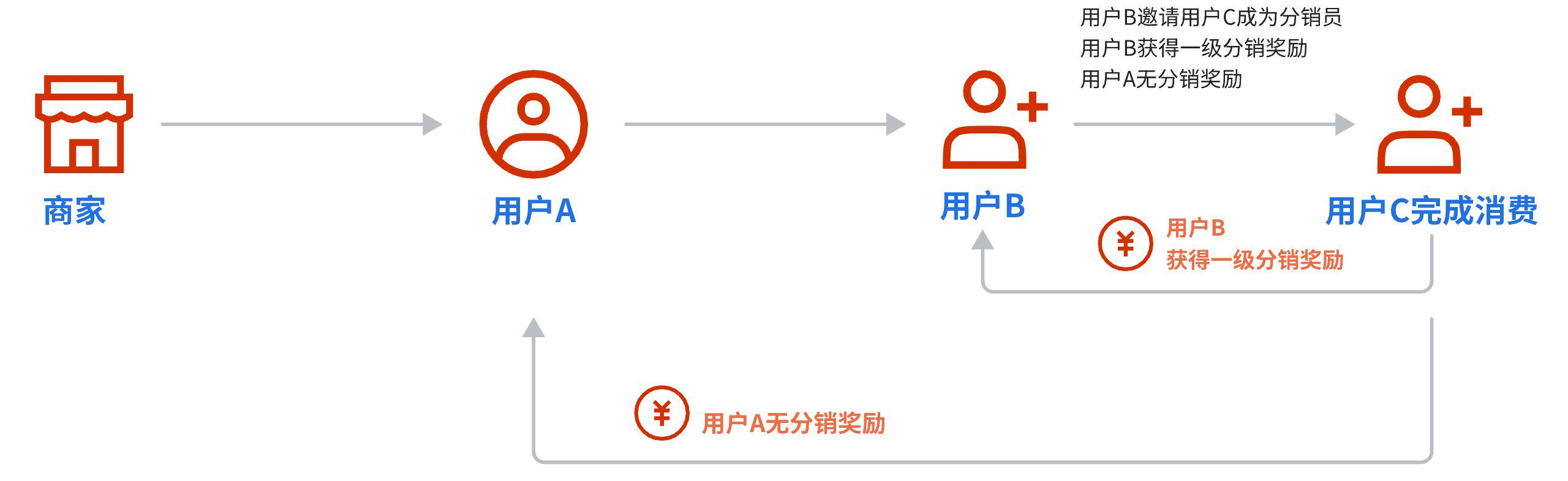 一级分销是指分销商用户A通过推广发展了新用户B。当B产生消费时,A会获得一级分销奖励。注意,这个奖励是与B的消费直接挂钩的。