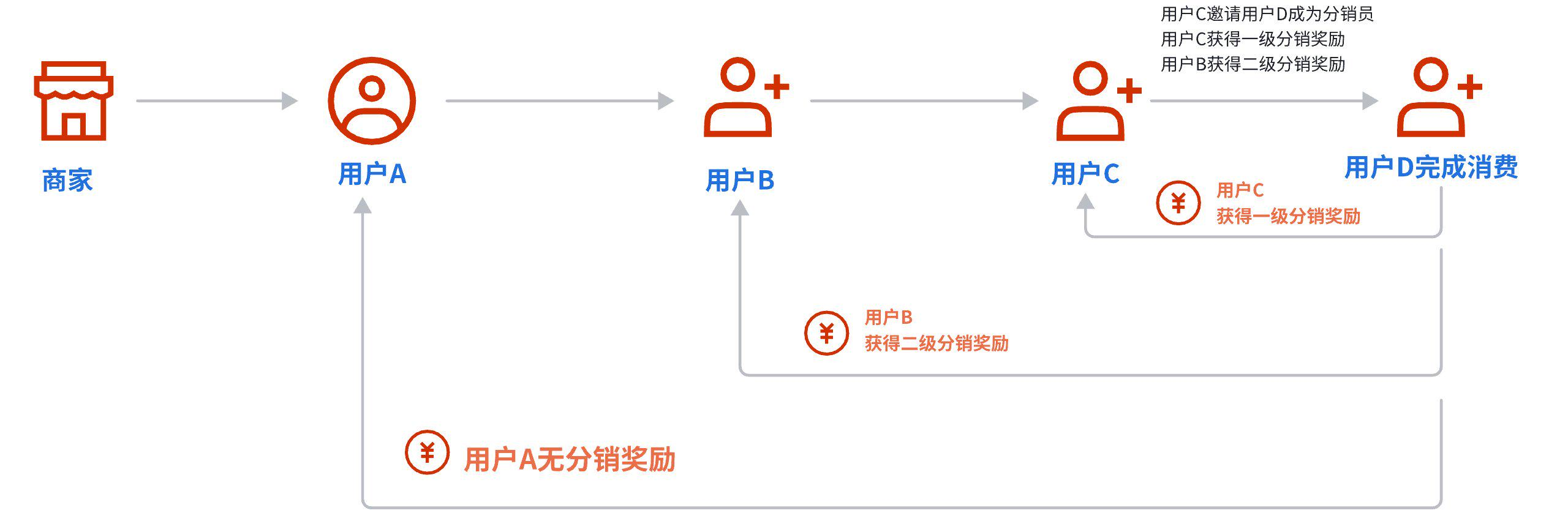 - 当C发展新用户D,D产生消费后,C获得一级分销奖励,B获得二级分销奖励,A则没有奖励。
