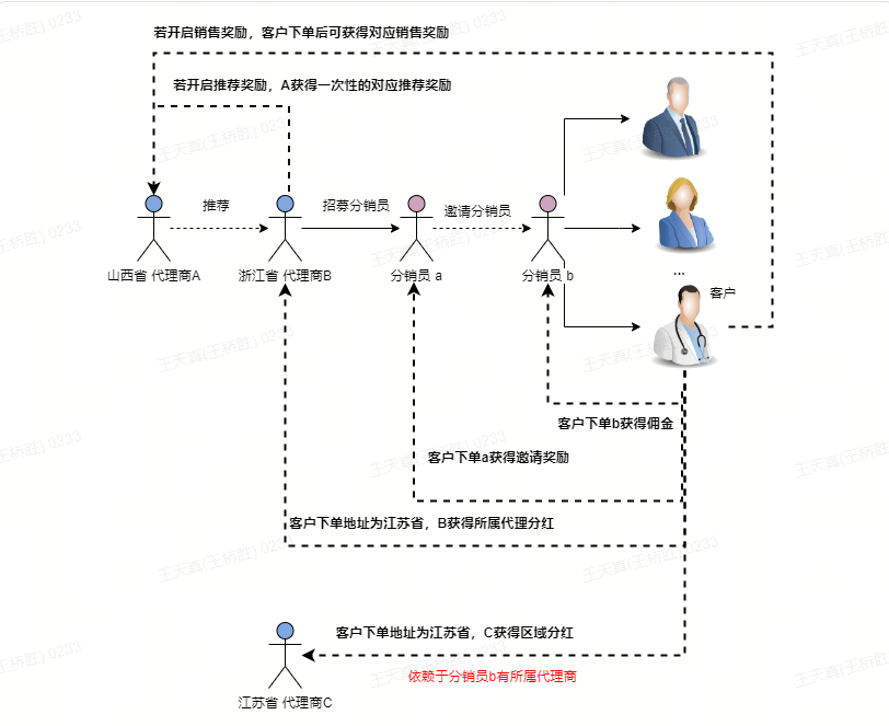 - 如果C产生消费,B作为C的上一级,获得一级分销奖励,A则获得二级分销奖励。