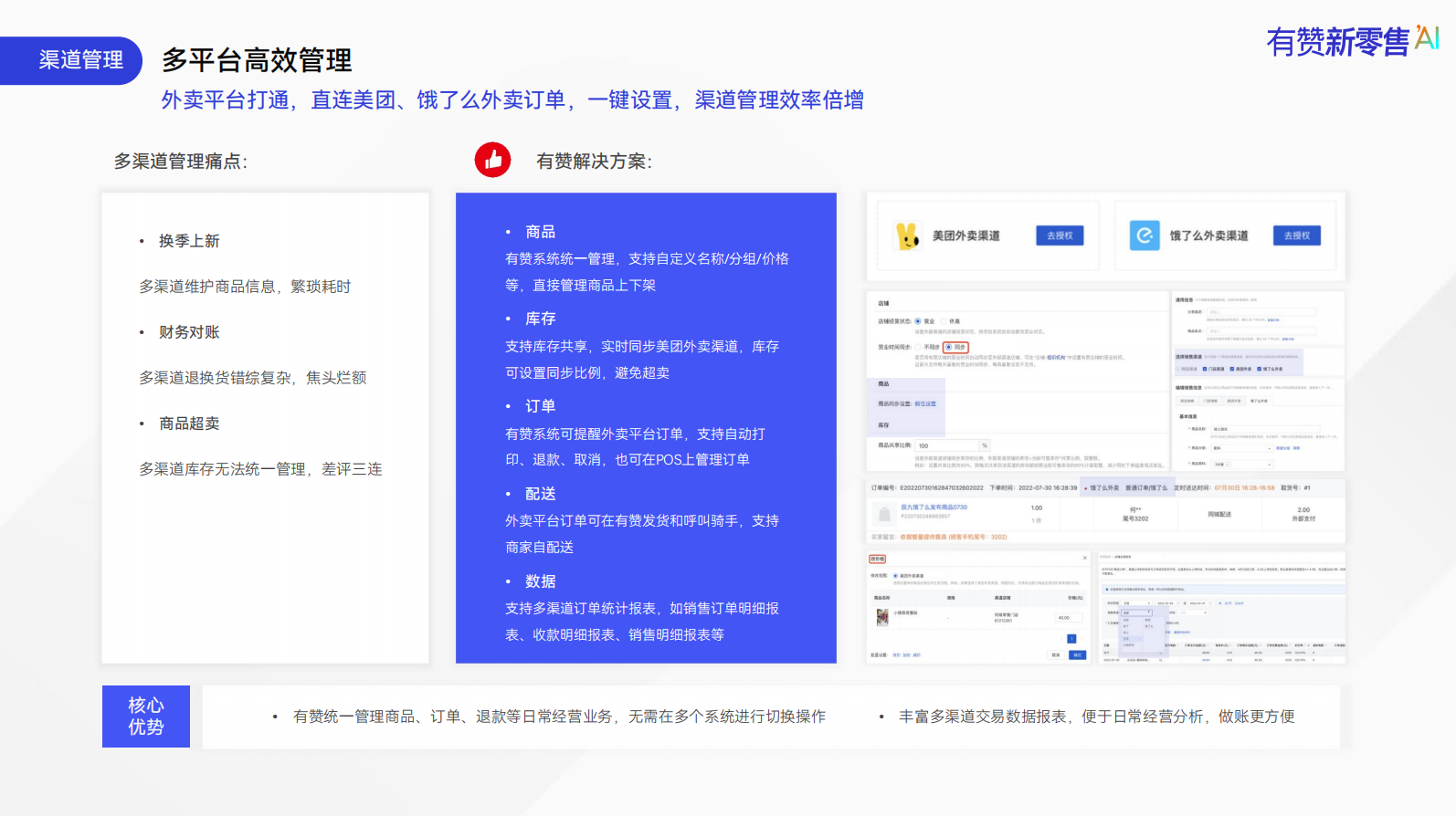 快速开展全域经营,扩大私域流量规模,提供线上商城,微信自营小程序、外卖渠道打通、团购券核销和短视频内容平台开店等服务,帮助商家获取更多流量并沉淀至私域。了解详情>>有赞门店 - 线上线下一体化经营,实现全方位的提效增收