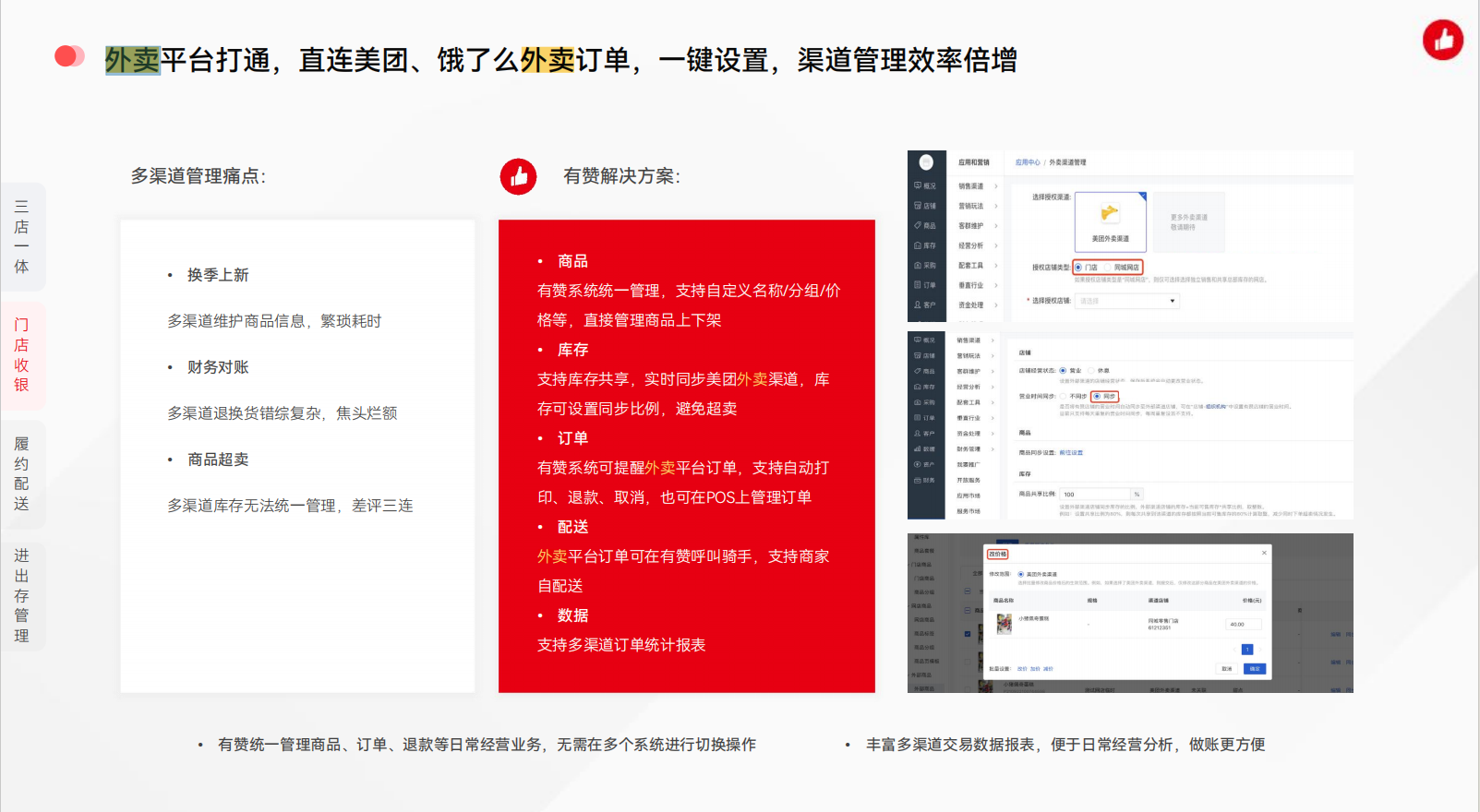 1. 商品 ○ 有赞系统统一管理,支持自定义名称/分组/价格等,直接管理商品上下架 2. 库存 ○ 支持库存共享,实时同步美团外卖渠道,库存可设置同步比例,避免超卖 3. 订单 ○ 有赞系统可提醒外卖平台订单,支持自动打印、退款、取消,也可在POS上管理订单 4. 配送 ○ 外卖平台订单可在有赞呼叫骑手,支持商家自配送 5. 数据 ○ 支持多渠道订单统计报表 |