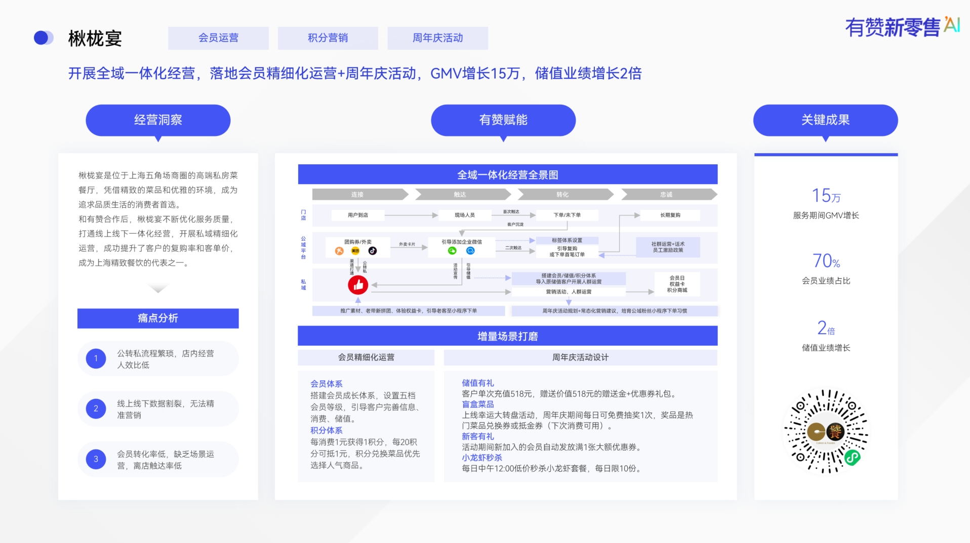 楸栊宴是位于上海五角场商圈的线下高端私房菜餐厅,和有赞合作后,楸栊宴打通线上线下一体化经营,构建三店一体化,开展私域精细化运营,成功提升了客户的复购率和客单价,成为上海精致餐饮的代表之一。