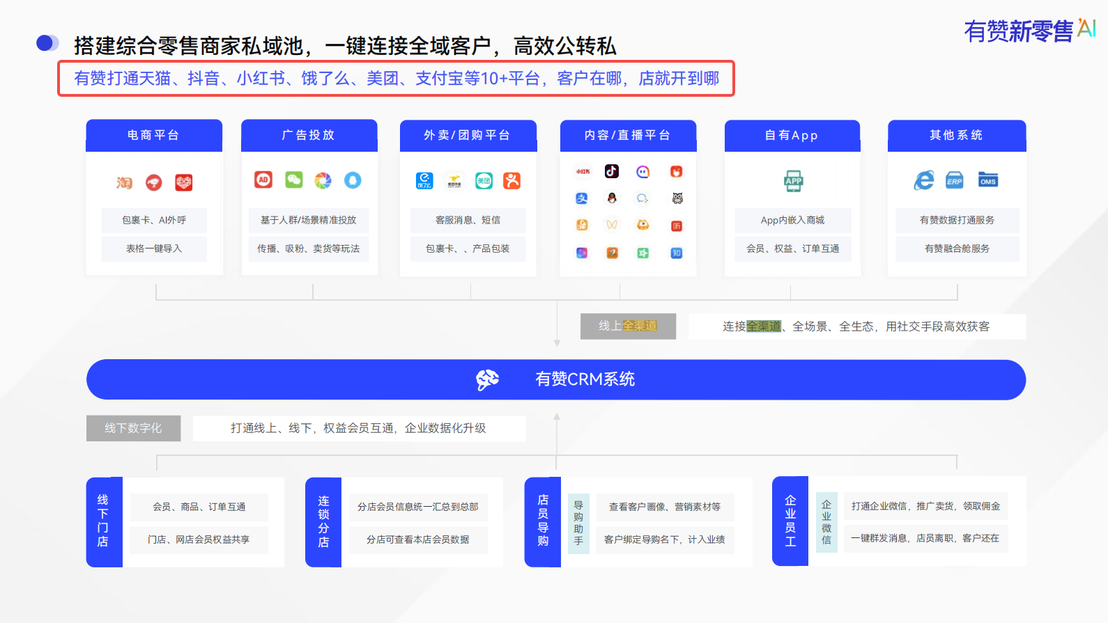 1. 搭建综合营销系统: ○ 一键连接全域客户:整合多渠道,包括有赞微商城、有赞小程序、银行、支付通道等,覆盖10+平台,实现广泛的客户触达。 ○ 高效公转私:通过统一的营销系统,实现从公域引流到私域的高效转化。 2. 营销矩阵: ○ 私域平台:有赞微商城、有赞小程序、银行、App、分销市场、商家自有渠道。 ○ 公域平台:抖音、小红书、快手、百度、支付宝、微信等社交及电商平台。 3. 全渠道链接客户: ○ 全方位链接客户:通过微信、短信、App、邮件等多种渠道,实现对客户的全面覆盖。 ○ 多端智能提醒:提升客户体验,减少等待时间,提高客户满意度。 |