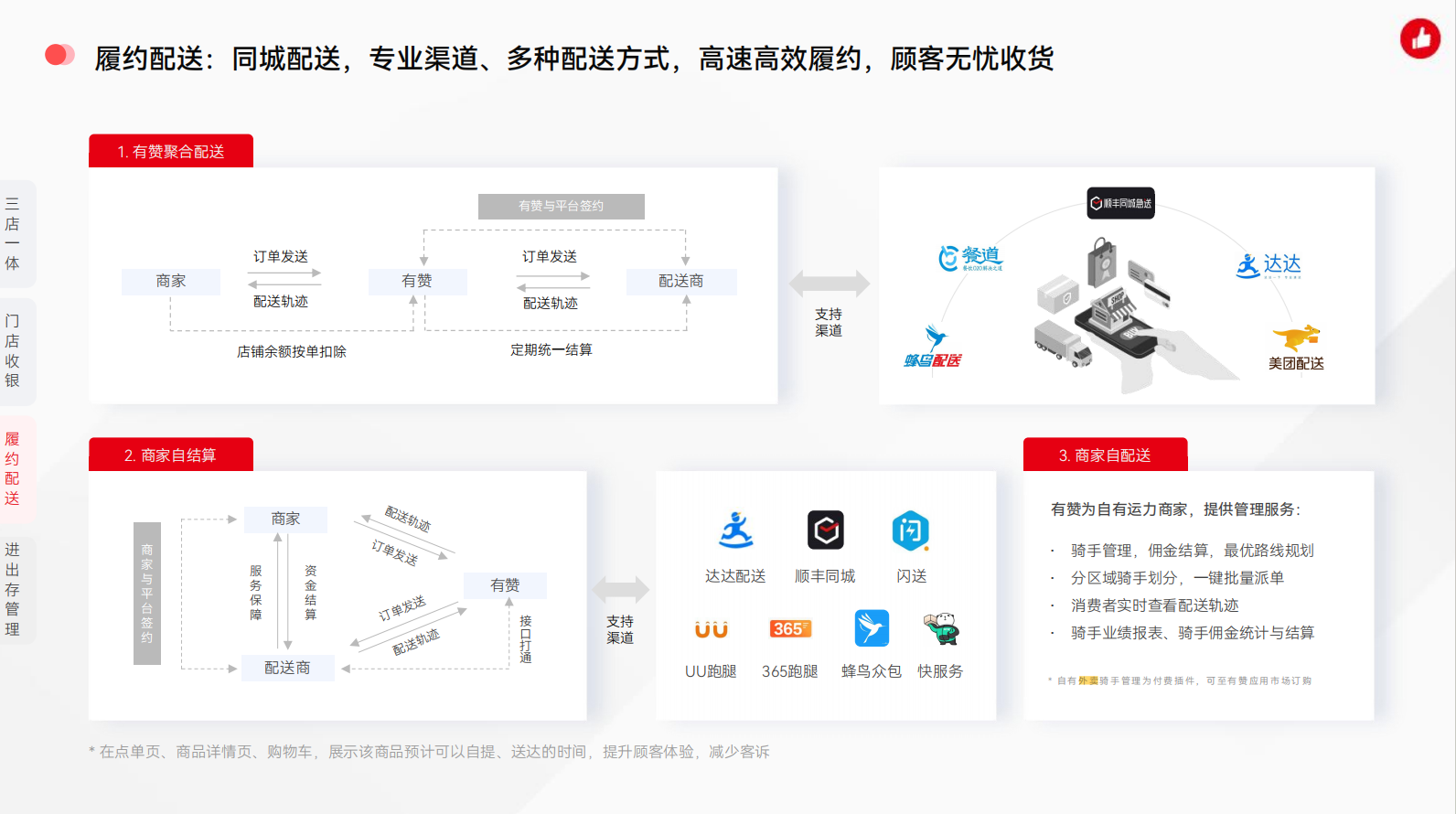 1. 履约配送方式: ○ 同城配送:覆盖范围广泛,支持即时配送,提升客户满意度。 ○ 专业渠道:与达达配送、美团配送、顺丰同城、UU跑腿等专业配送公司合作,确保配送的专业性和可靠性。 2. 多种配送方式: ○ 商家自配送:由商家自行安排配送人员和路线。 ○ 聚合配送:通过第三方平台整合多种配送资源,提高配送效率。 ○ 自营外卖:利用自有的配送团队,保证服务质量和速度。 |
