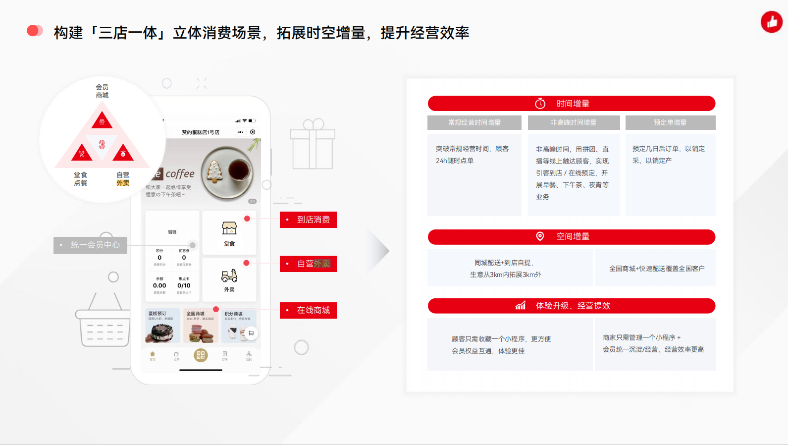 构建「三店一体」立体消费场景,拓展时空增量,提升经营效率 1. 构建“三店一体”: ○ 立体消费场景:融合门店、外卖、商城三种业务形态。 ○ 利用时空增量:通过不同渠道的协同作用,提升经营效率。 2. 在线商城: ○ 24小时在线购物。 ○ 全国配送,多种履约方式。 3. 自营外卖: ○ 覆盖3公里内外的顾客群体。 ○ 结合LBS技术,精准推送外卖服务。 4. 会员统一管理: ○ 统一沉淀会员数据,实现精准营销。 ○ 会员权益互通,提升用户粘性。 |
