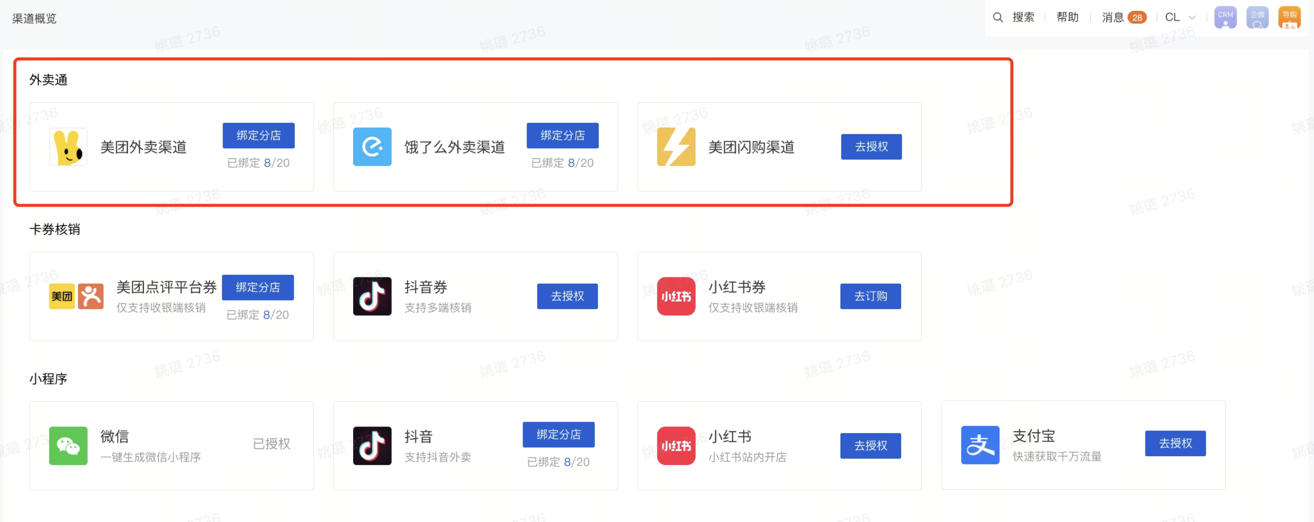 有赞打通的外卖渠道统称【外卖通】,具体包括美团外卖、美团闪购、饿了么主流外卖渠道。