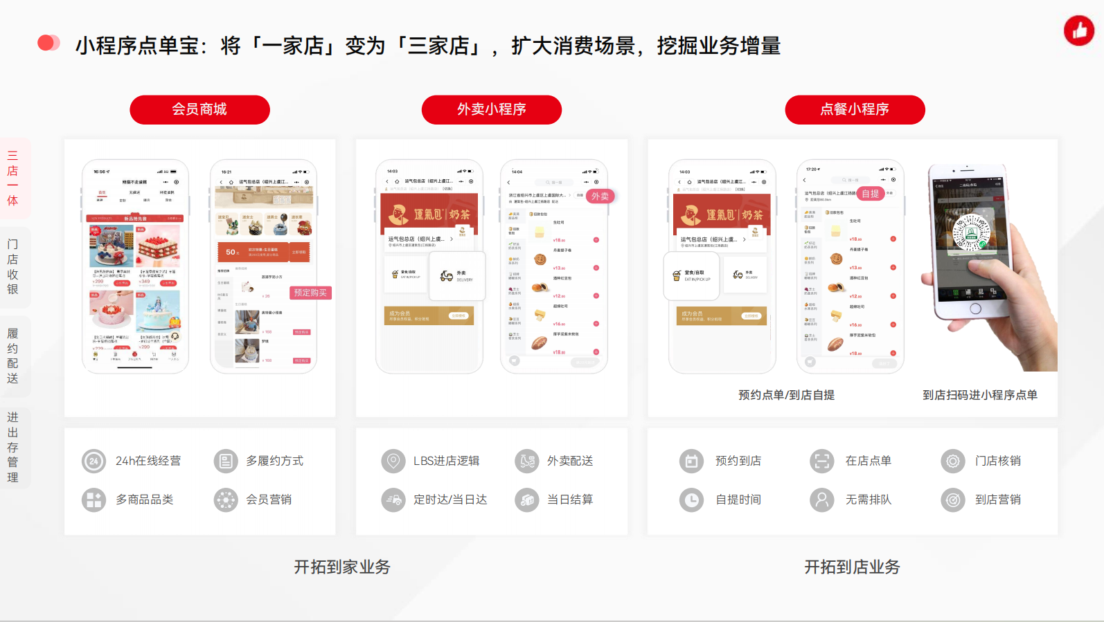 覆盖在线商城、外卖配送和堂食点单三个消费场景。客户可以以通过在线商城随时点单、预订点单。在非高峰时间,还能用拼团、直播等线上触达客户实现引客到店/在线预订。同时同城配送、全国快递等多种配送方式,使订单覆盖范围从周边3公里扩展至全国。
