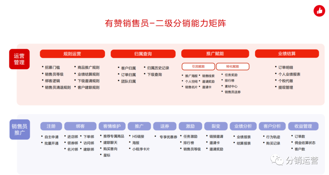 一般的二级分销模式的佣金主要是分为两种,即销售佣金和推广佣金。其中销售佣金是指卖出的产品,不管是哪一级分销商卖出,得到了销售佣金的比例都是一致的。而推广佣金是指每一个分销商的下级分销商卖出商品,上级分销商可以拿到推广佣金。推广佣金最多只有两级。这点商家也要注意。