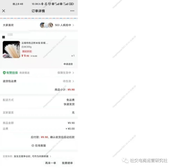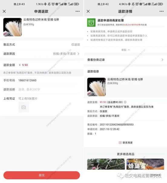 2.2 用户选择退款原因后提交,待商家审核。(未确认收货前,退款金额为整单金额,且无法修改。确认收货后,退款规则与普通订单一致。)