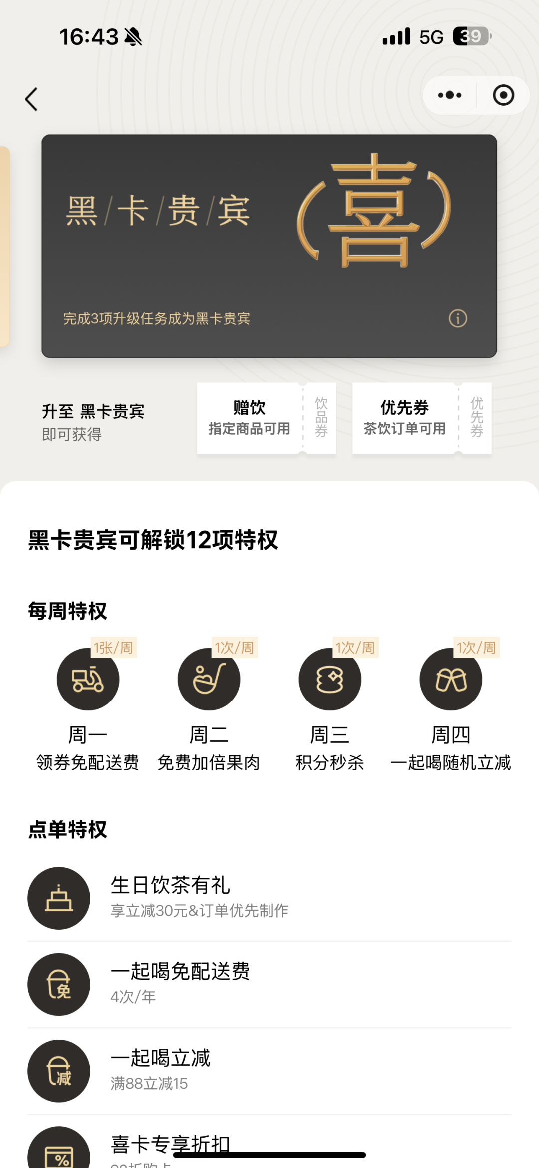 喜茶的「黑金灵感卡」将会员分为三级,每一层级提供不同的权益,以提高用户忠诚度: