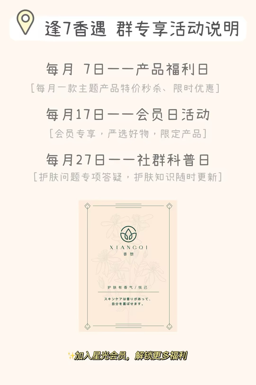 XIANGQI香憩特别注重社群运营,特别是VIP社群的管理。他们通过与社群成员的互动,鼓励客户分享使用心得与产品评价,积累口碑。在社群内,成员们共同讨论芳香护肤、身体养护等话题,形成强大的品牌忠诚度,帮助品牌进一步提升复购率。