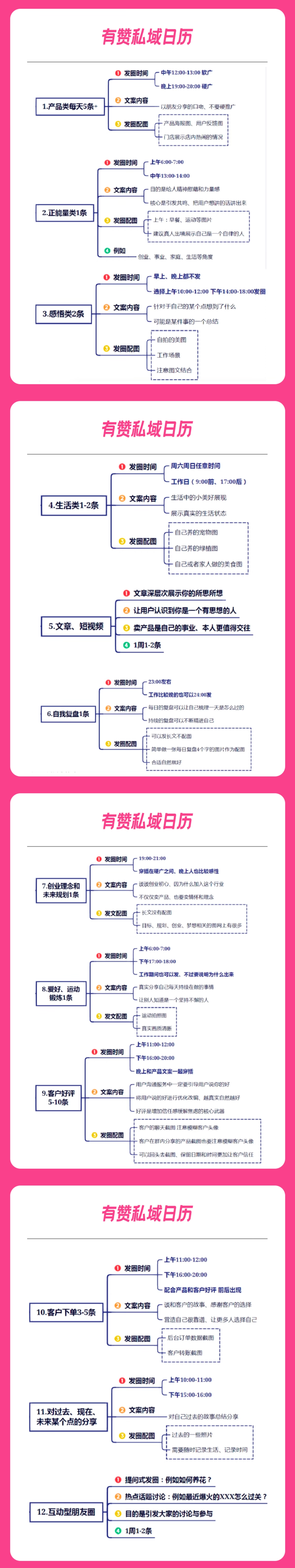 如何不打扰到用户?挖掘可以触动用户的痛点?提供有价值的内容? 掌握好一下12条朋友圈引流规则,客流量、销量分分钟提高! 1.产品类每天5条+ 2.正能量类1条 3.感悟类2条 4.生活类1-2条 5.文章or短视频1条 6.自我复盘1条 7.创业理念和未来规划1条 8.爱好、运动锻炼或正能量的生活方式1条 9.客户好评 10.客户下单 11.对过去、现在、未来某个点的分享 12.互动型内容 完整细节内容,查看完整干货获取~