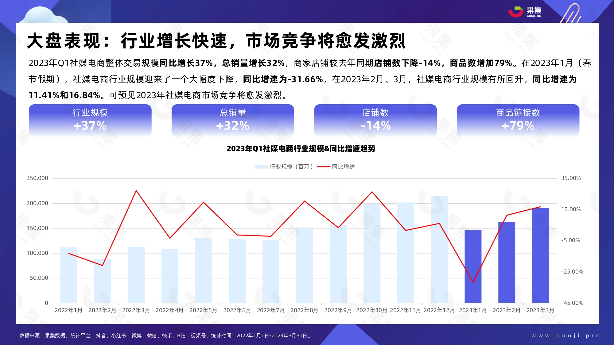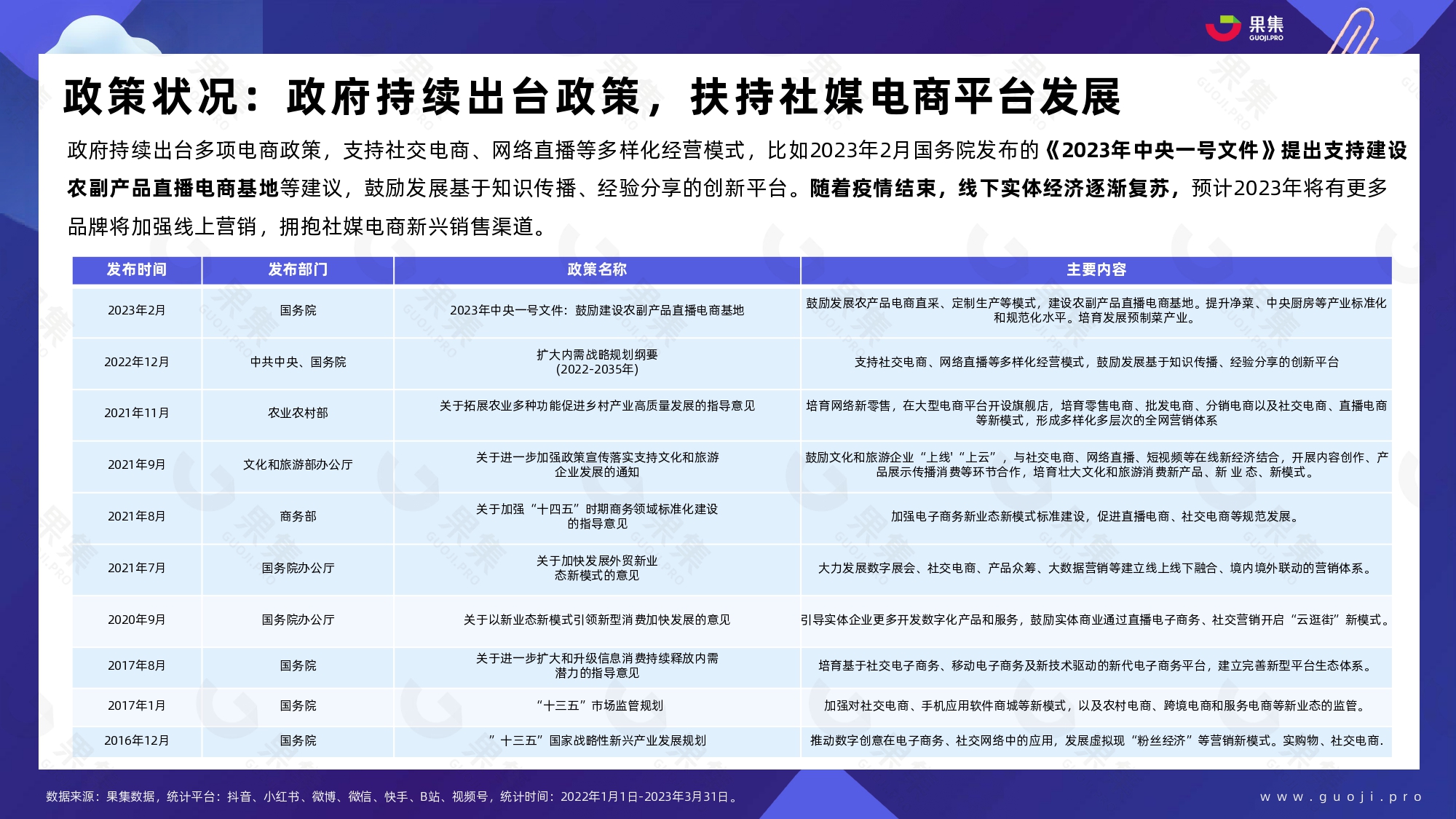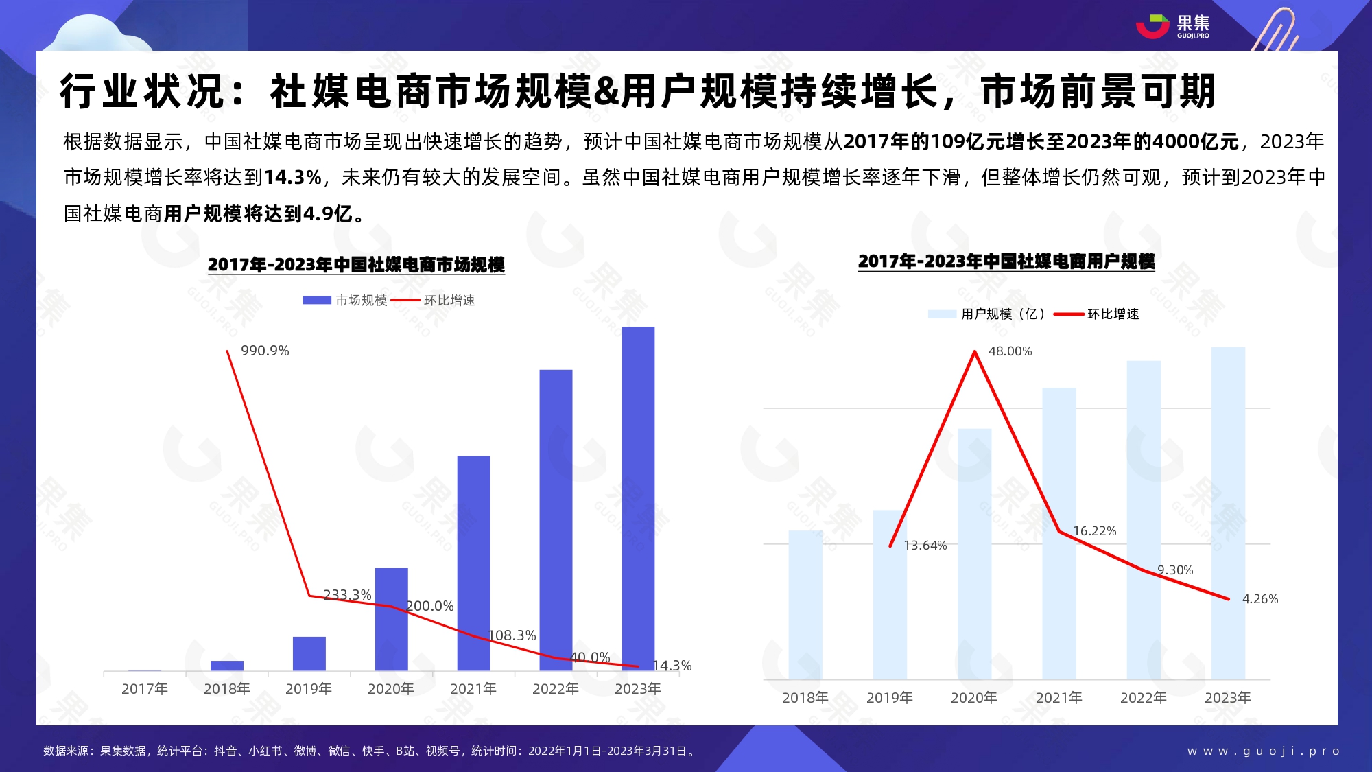 根据数据显示,中国社媒电商市场呈现出快速增长的趋势,预计中国社媒电商市场规模从2017年的109亿元增长至2023年的4000亿元,2023年市场规模增长率将达到14.3%,未来仍有较大的发展空间。 虽然中国社媒电商用户规模增长率逐年下滑,但整体增长仍然可观,预计到2023年中国社媒电商用户规模将达到4.9亿。 政府持续出台多项电商政策,支持社交电商、网络直播等多样化经营模式,随着疫情结束,线下实体经济逐渐复苏,预计2023年将有更多品牌将加强线上营销,拥抱社媒电商新兴销售渠道。 在这样的背景下,品牌直播销售规模增速亮眼,自然销售规模稳定增长;品牌直播增长趋势稳定,达人直播销售动态波动,品牌自播被渐渐重视。第一季度品牌自播有什么表现?有哪些热门品类?又有哪些值得学习的品牌和方法论? 查看完整报告了解更多信息~