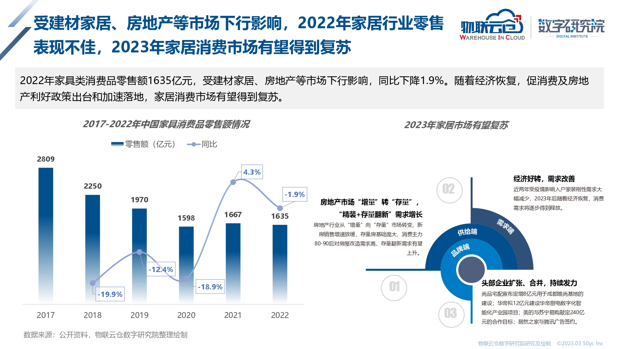 家居行业发展现状: 1.居民在居住方面的支出占比上升,受疫情影响2022年家具制造业营收同比下降8.1%; 2.受建材家居、房地产等市场下行影响,2022年家居行业零售表现不佳,2023年家居消费市场有望得到复苏; 3.家居行业当前呈现“大行业&小企业”的行业格局,市场集中度极低。 针对这样的市场发展现状,家居行业该如何解决供应链的难题,抓住发展的机遇呢?完整的报告内容可查看完整报告获取~