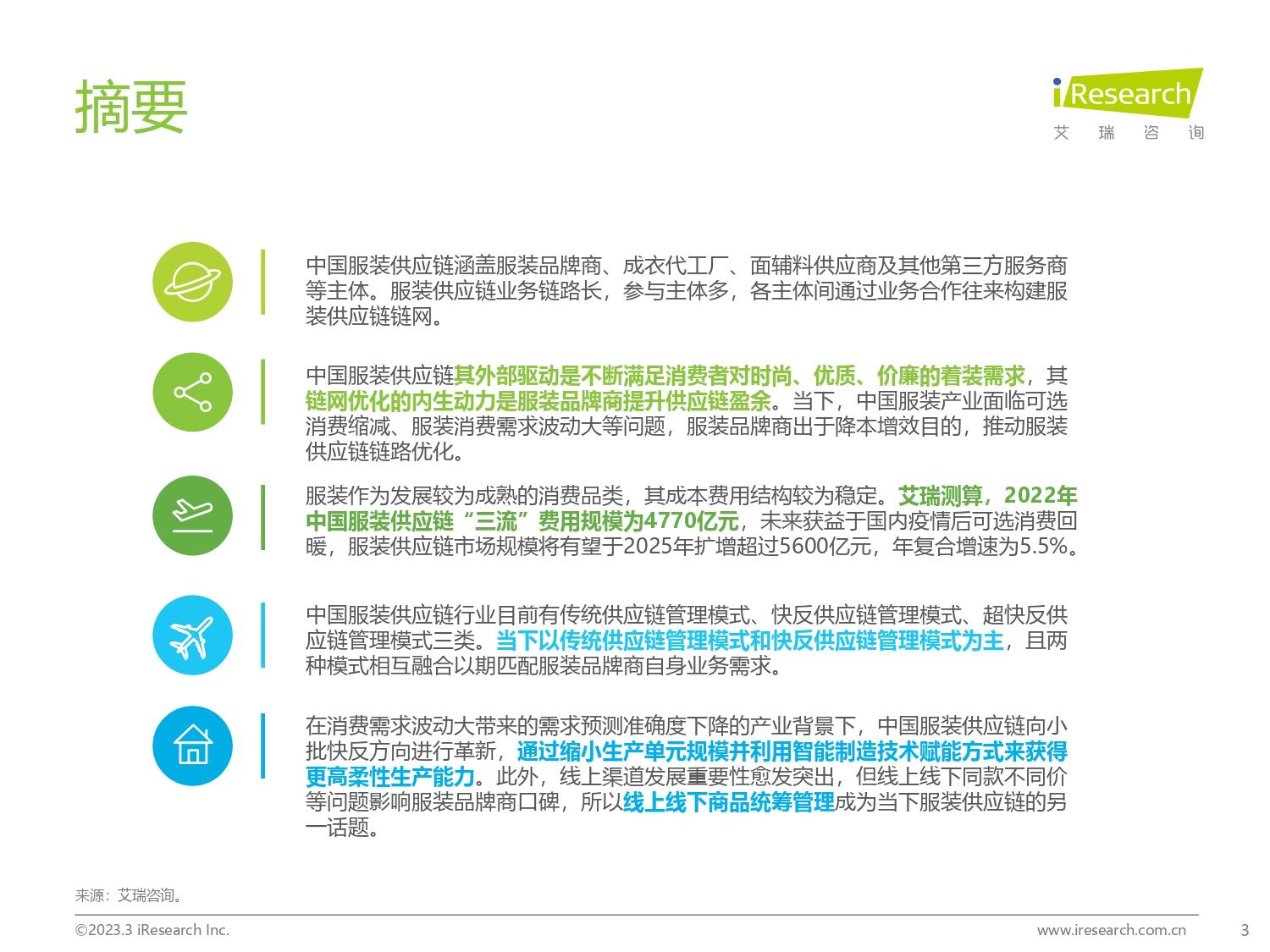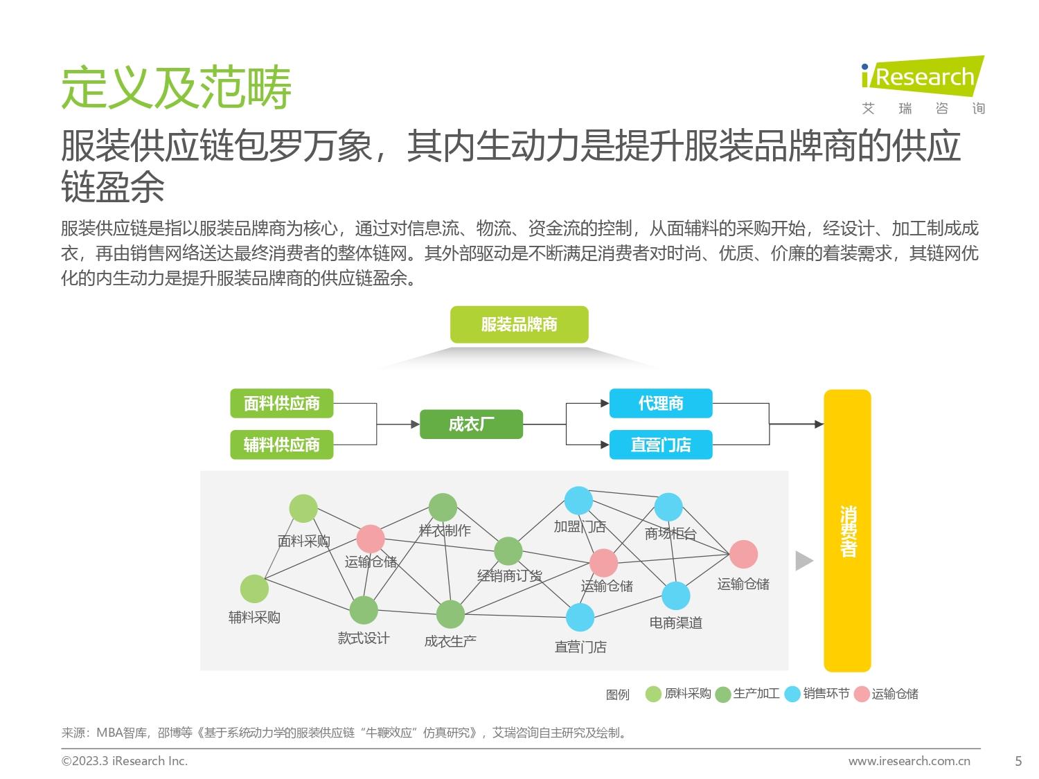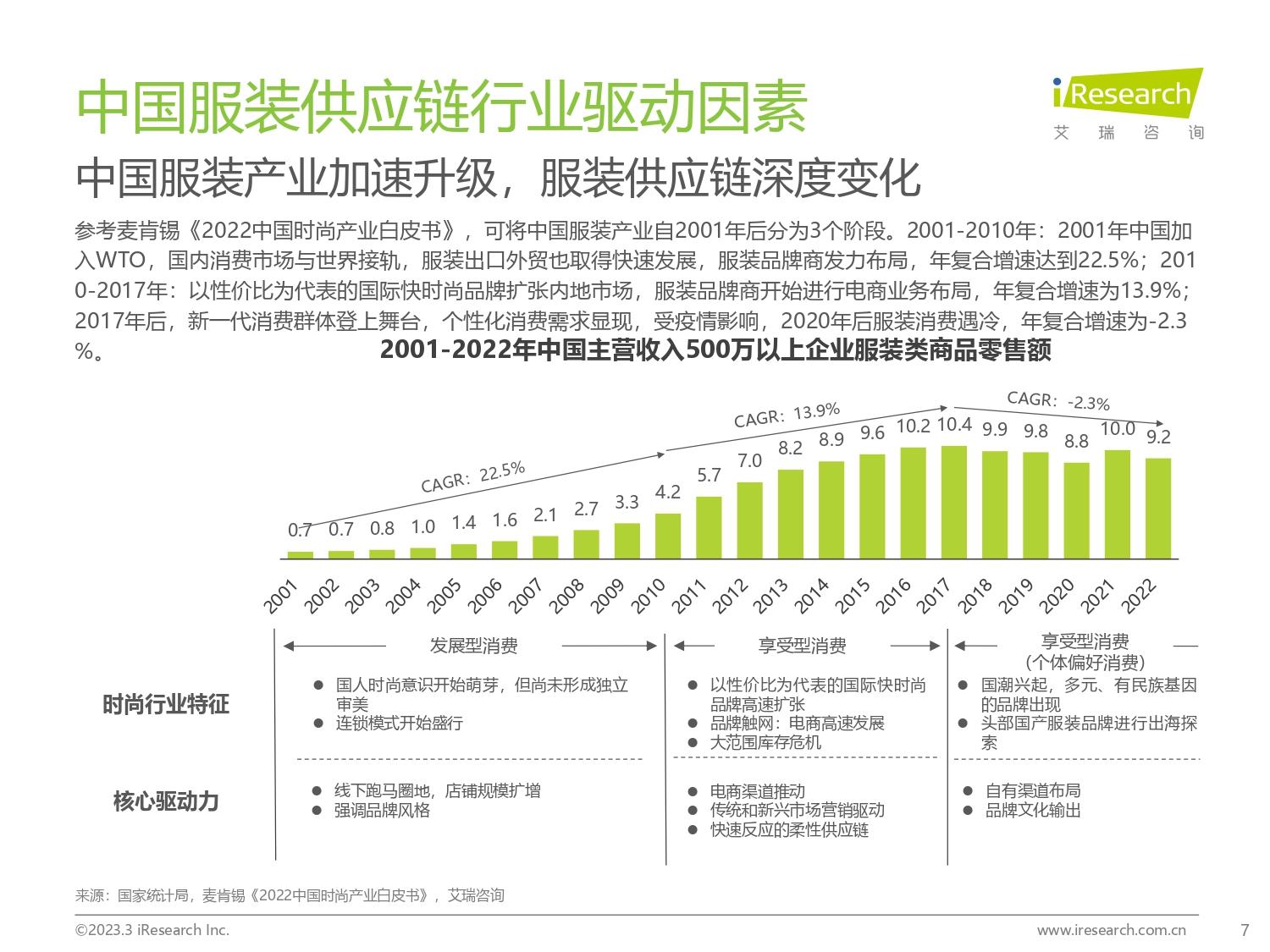我国消费市场进入新纪元,消费者个性化消费需求愈发明显,这使得服装这一时尚品类消费需求波动加大, 不可见性增强;此外,电商渠道占比持续提高,订单碎片化程度被进一步放大,过往计划性生产的供应链流程无法与不断变化的着衣需求相适配,这为服装品牌商进行供应链管理提出严峻考验。 此外,中国服装产业在过去两年受到终端消费遇冷和线下渠道受阻影响,行业整体也遭遇严寒时刻。 然而,危中有机,危机共存。服装供应链链路各主体正致力于优化供应链管理模式、降低供应链三流费用成本,减少信息孤岛、强化供应链快速响应和小批量生产能力,从而提升供应链整体盈余。 伴随服装消费在疫情后的逐步回暖, 供应链链路各主体提升供应链链路盈余,中国服装供应链产业有望稳步向前。 更多细节可查看完整报告获取~