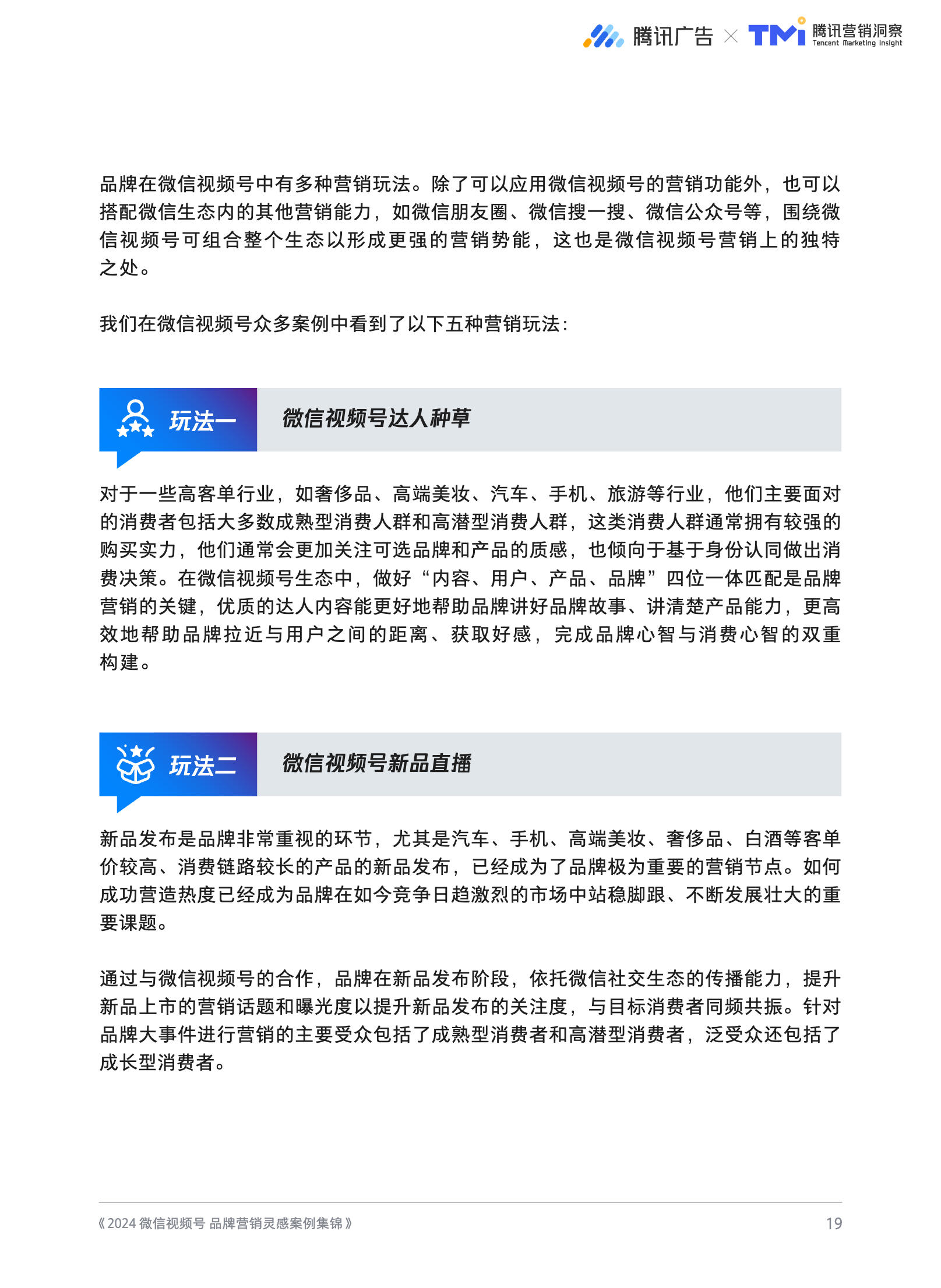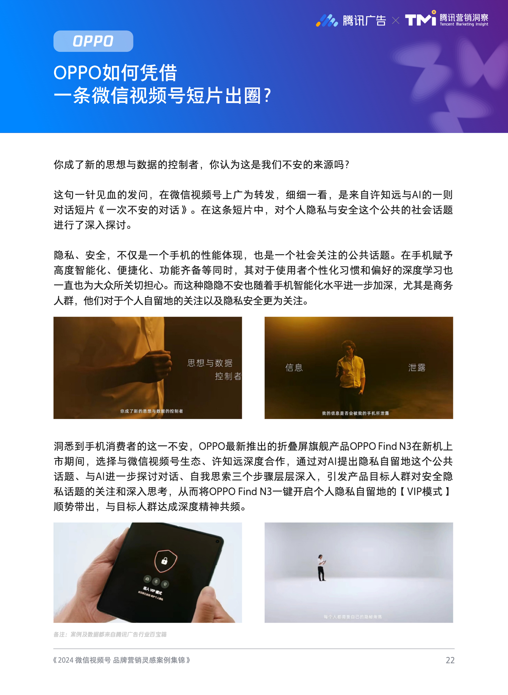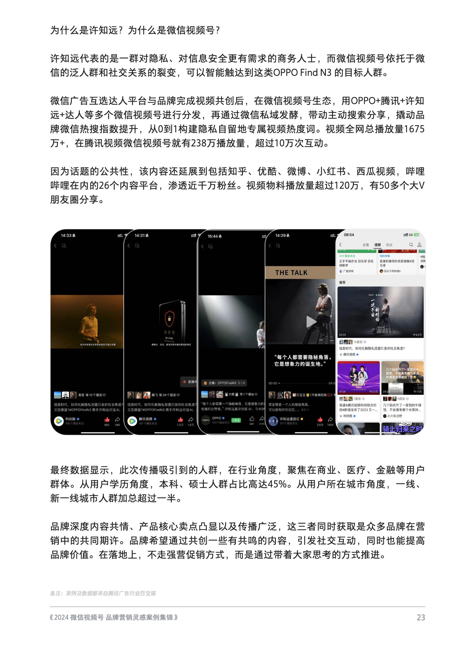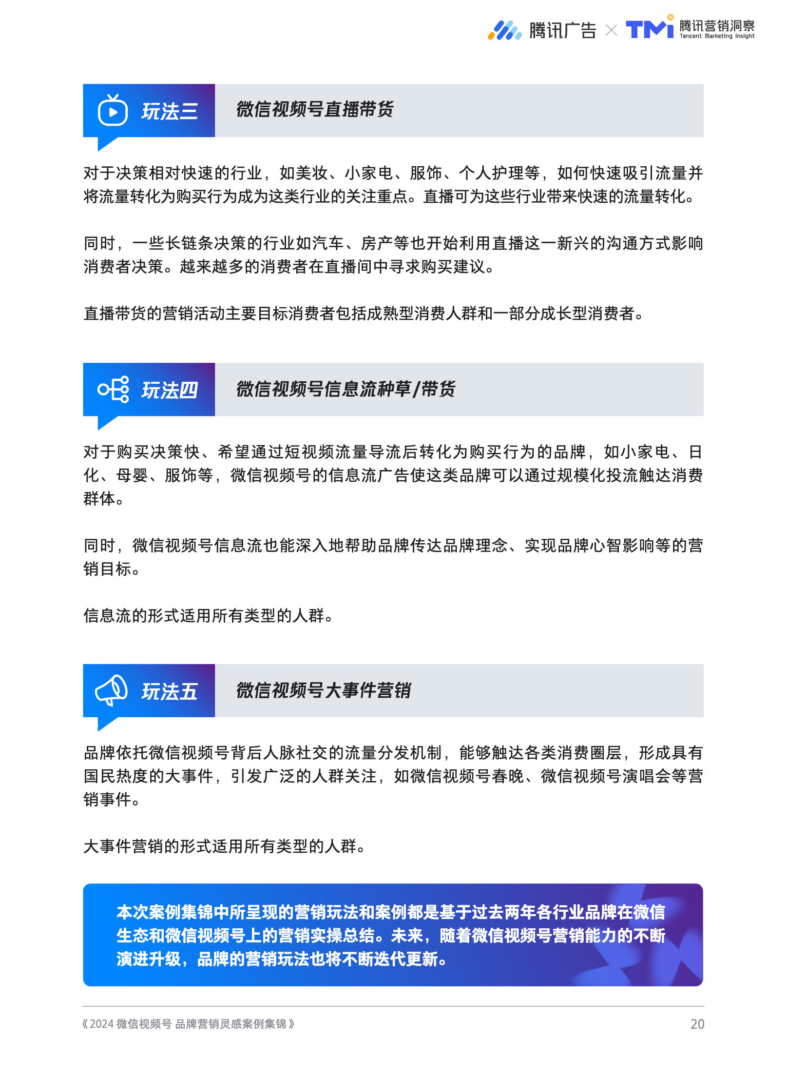 品牌合作伙伴,推出了一系列引人注目的案例,成功展示了品牌与用户之间深刻而有趣的互动。 在这些案例中,创意无疑是关键。品牌纷纷运用微信视频号的特点,打造生动的内容,吸引用户的眼球。通过巧妙的创意手法,品牌成功将产品与用户的兴趣相结合,实现了精准的品牌营销。 另外,与用户建立互动亦是微信视频号品牌营销的重要策略。品牌通过回应用户评论、举办线上互动活动等方式,拉近了与用户的距离,增强了用户对品牌的认知和好感度。 更值得一提的是,视频号平台的数据分析工具为品牌提供了强有力的支持。品牌可以通过分析用户行为数据,精准定位目标受众,提高广告投放的效益。 2024年微信视频号品牌营销案例集锦展示了创意、互动和数据分析的重要性。这些成功案例为品牌提供了有力的灵感和指导,使其在竞争激烈的市场中脱颖而出,赢得了用户的信任和忠诚。