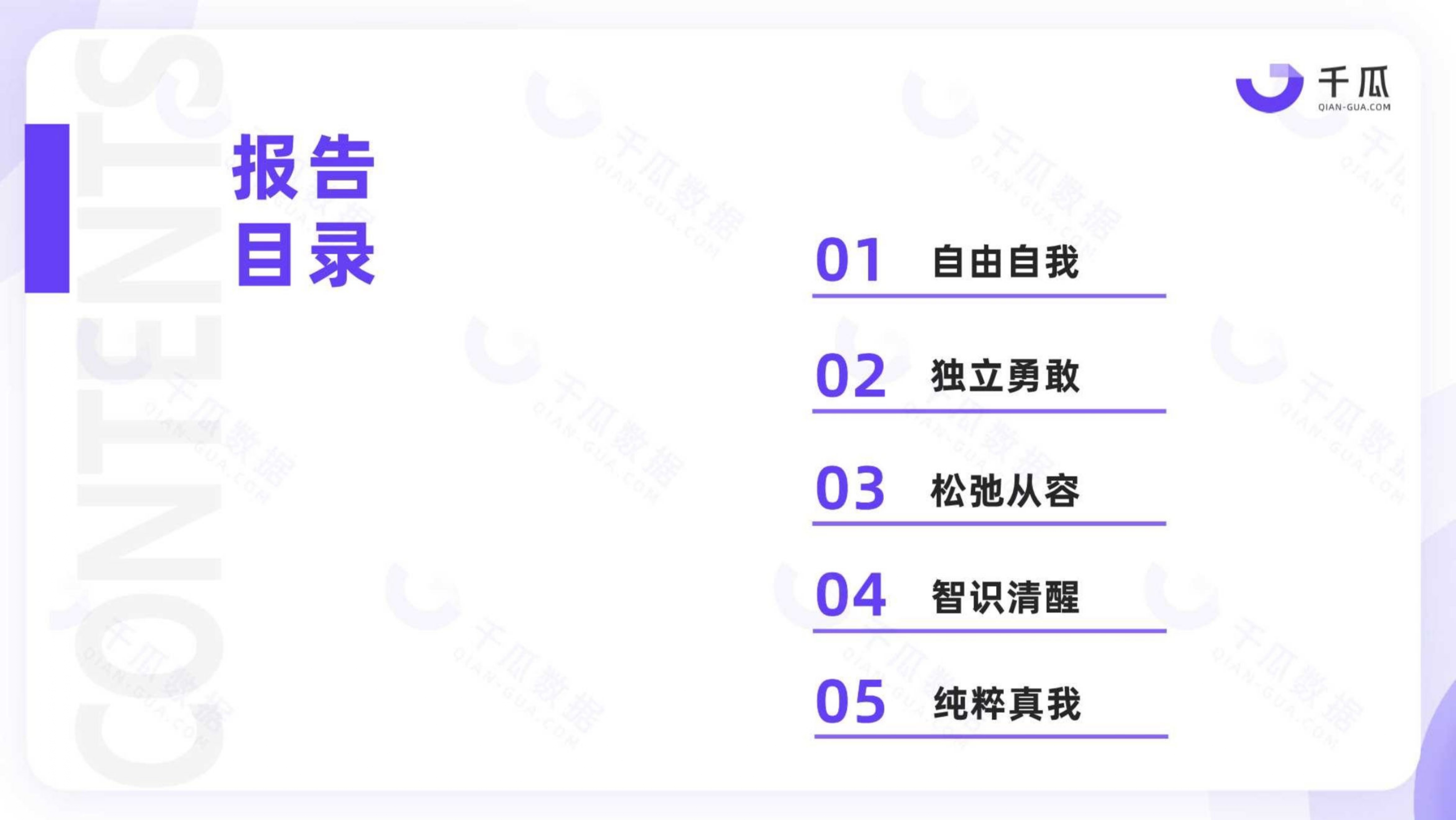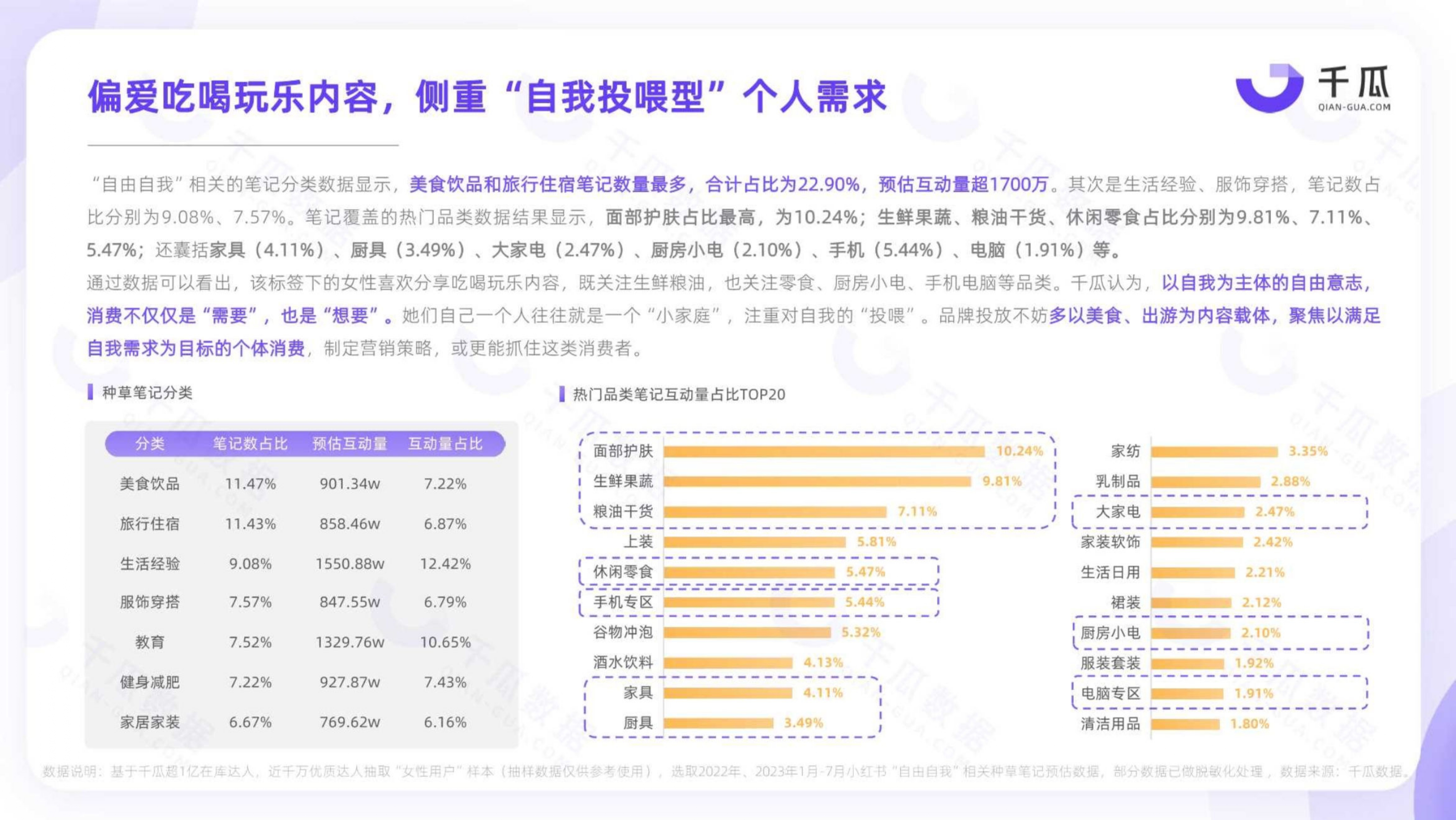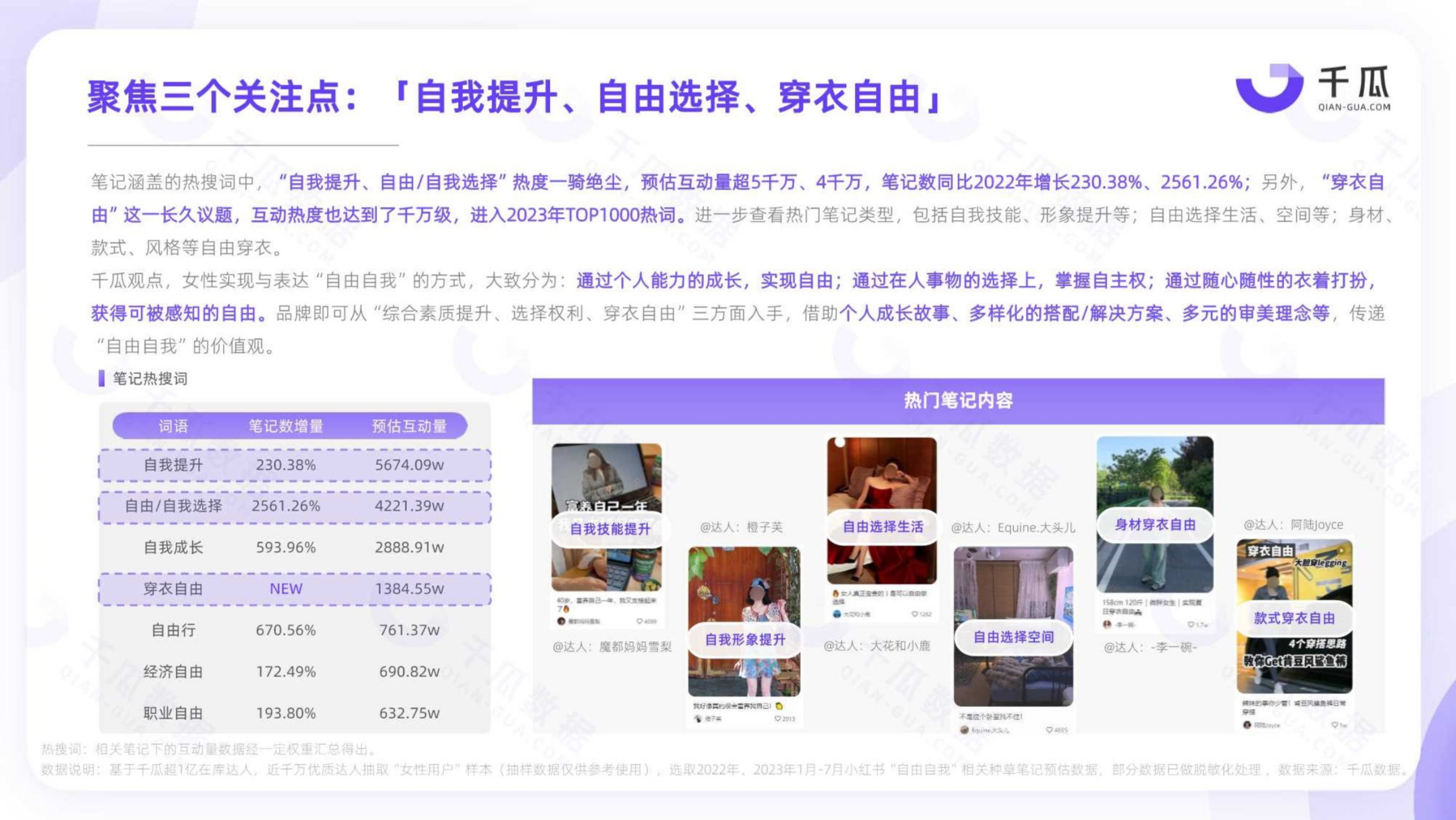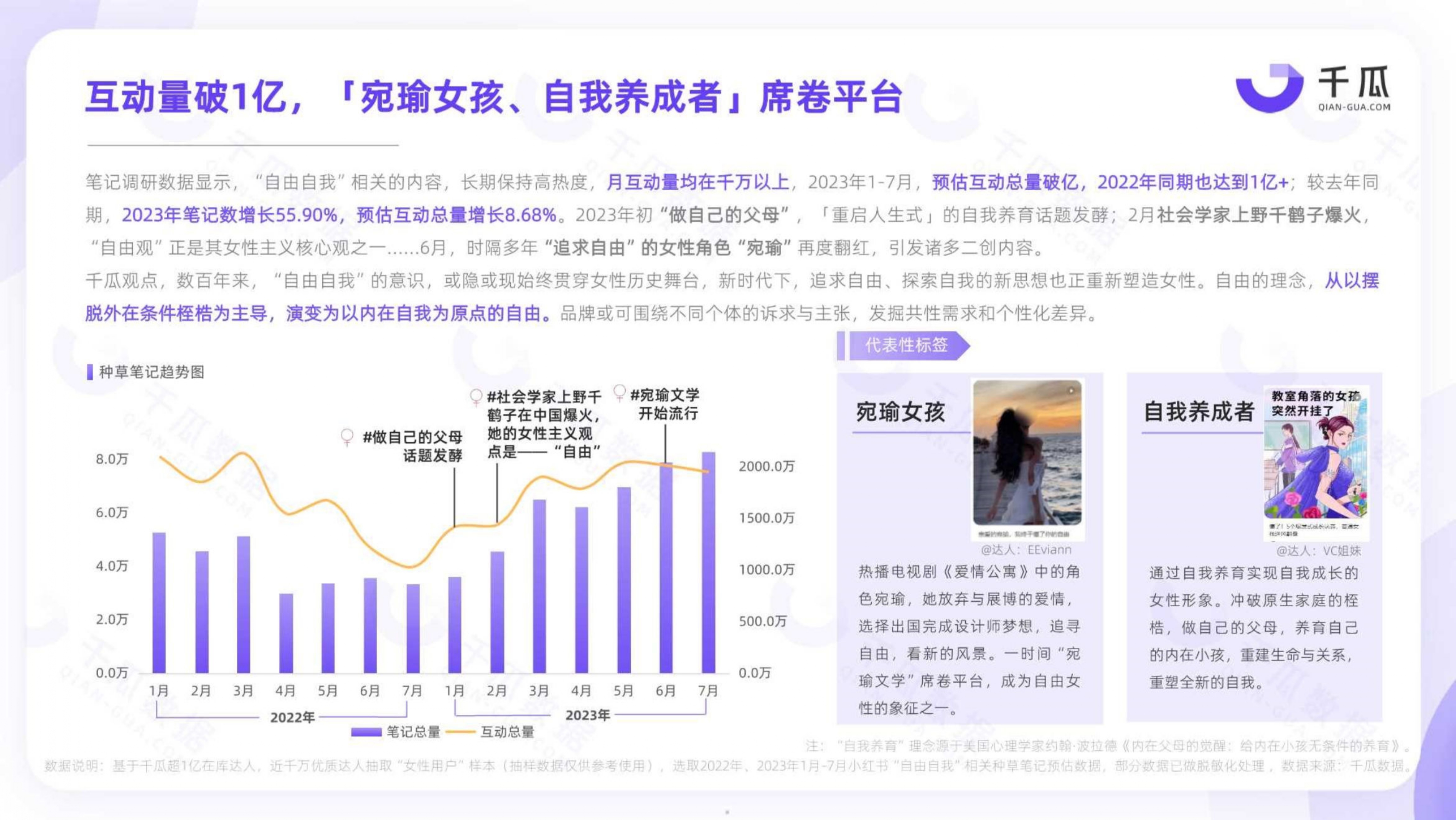 作为新时代女性群体的聚集地、发声场,小红书不断涌现的「她」话题,承载着不同的女性特质,对理想自我、理想生活的期待,以及消费行为与决策偏好。 当代女性为回答「我是谁」、「我要什么」、「我想成为什么样的自己」,倾向选择符合自己需求期待和价值观的产品,这就需要品牌深入了解女性世界,用相通的性情与她们走到一起。 通过对小红书站内女性生活、工作、社交、亲密关系、期望等方面的内容共性调研,经过数据筛选、整合,千瓜总结出5个典型标签:自由自我、独立勇敢、松弛从容、智识清醒、纯粹真我。 这些关键词下的女性生活方式、消费需求、消费偏好,有何特点?品牌如何唤醒、构建自我实现、身份认同与生活叙事场景,实现短期和长期的布局? 本期报告是希望能为品牌提供更多看见「她」多面魅力、多元生活的窗口,洞悉女性种草趋势,预见未来风向。