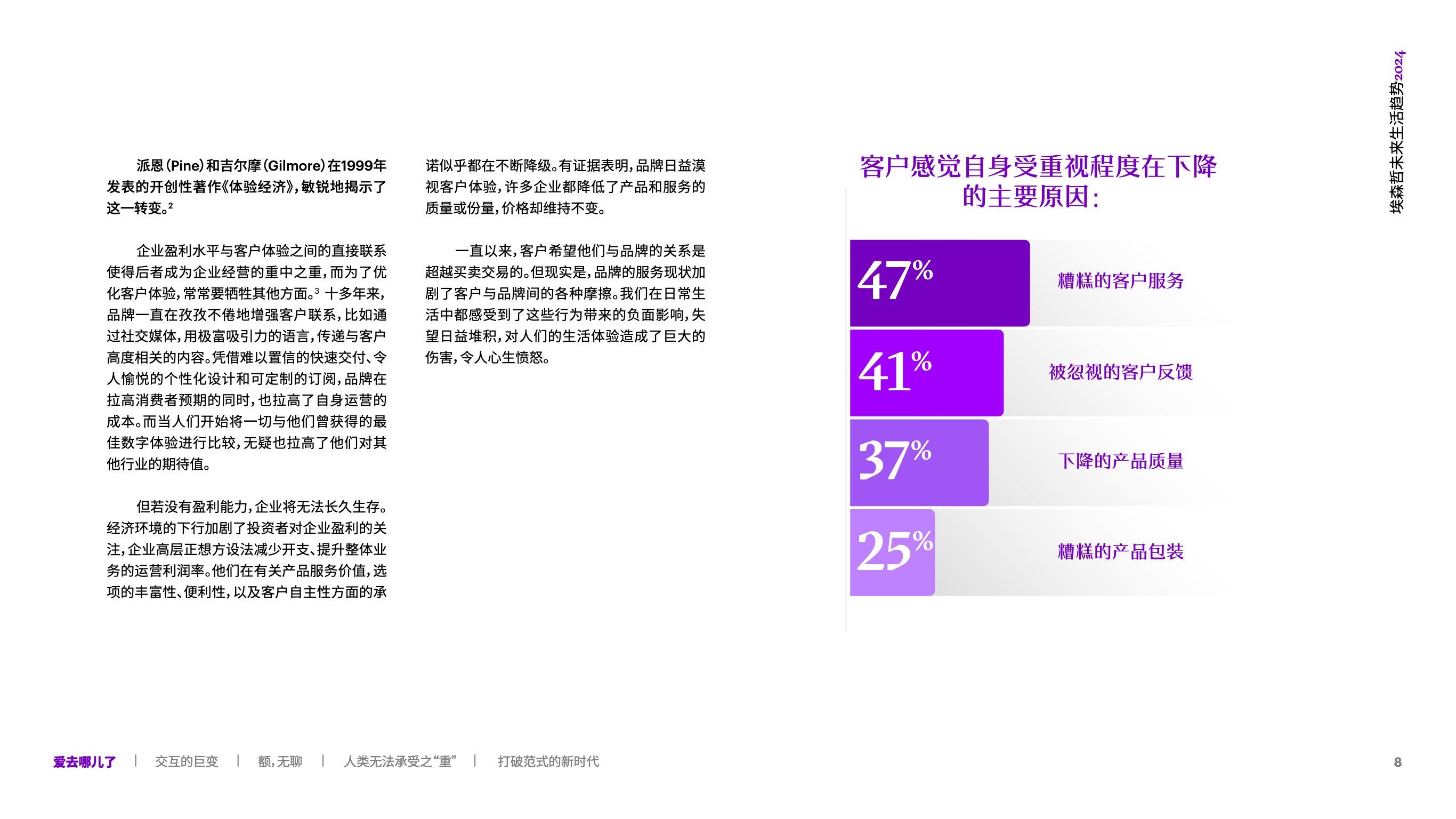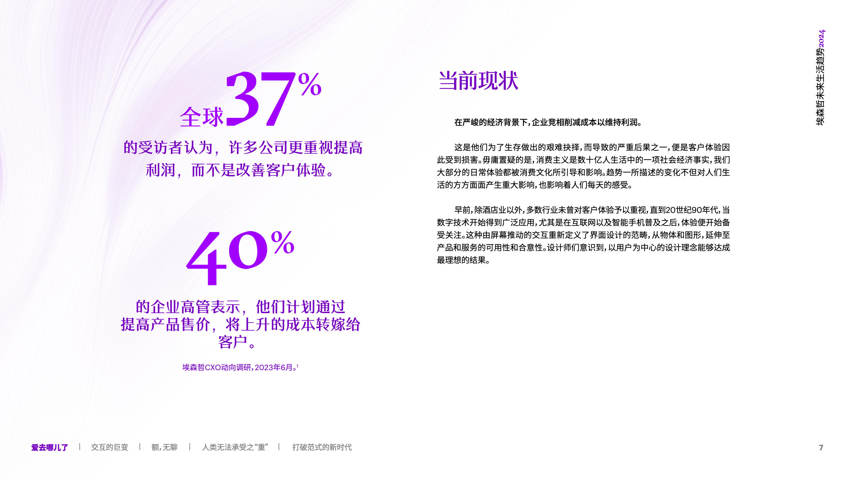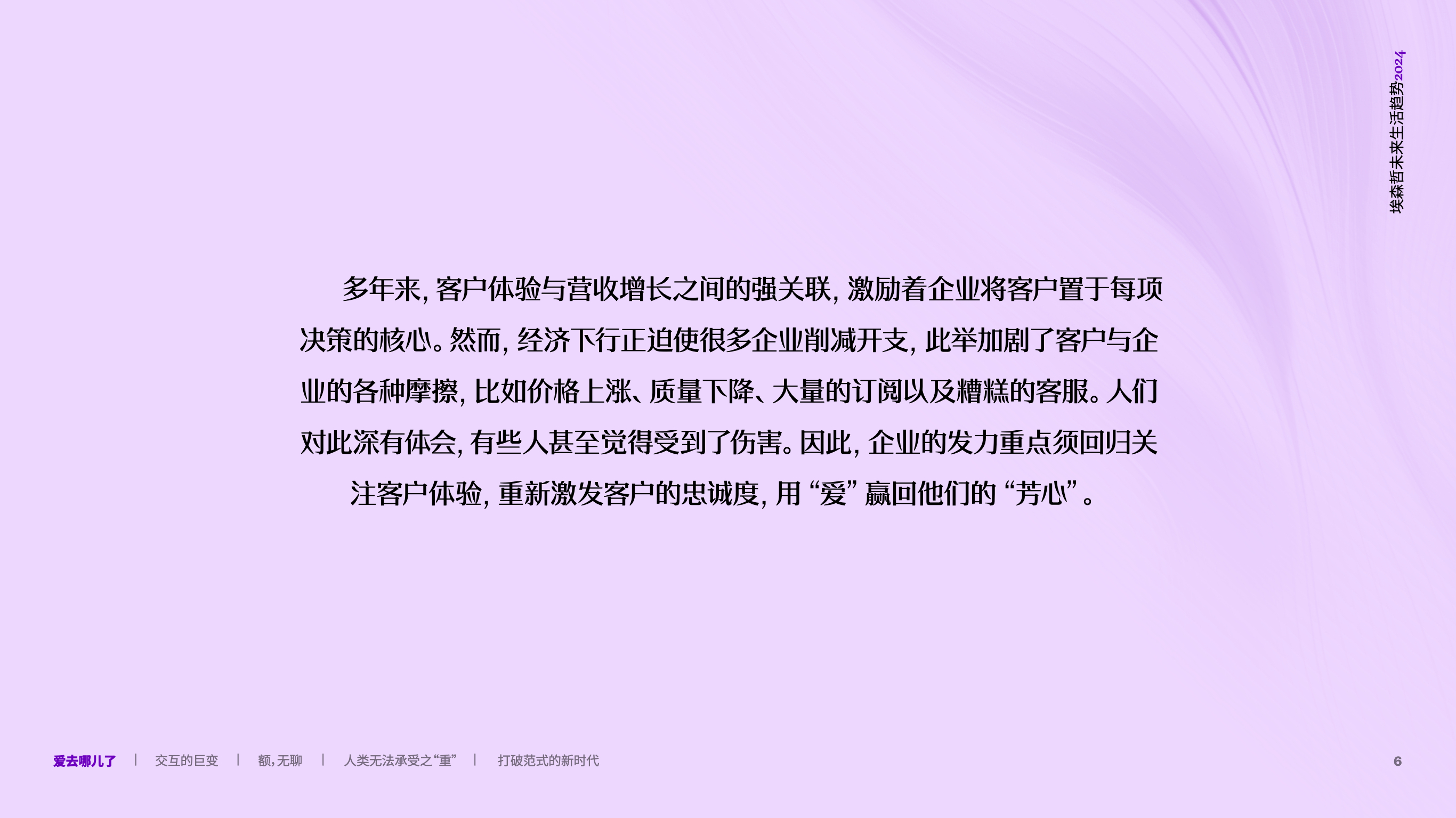 消费者将继续收紧预算,如果觉得产品或者服务没有价值,他们必定会取消订阅、缩减开支、降低消费。新的风险也将随之而来:就像“高期望值”会跨行业延伸一样,“怀疑”同样是流动的,当客户对某一品牌感到失望,他们也将对所有其他品牌保持戒备之心。 品牌只有提供切实的支持和稳定的服务,让消费者的体验有意义且高质量,才能俘获他们的“芳心”,这也是重新定义客户与品牌的关系的重要因素。 虽然消费者的行为难以琢磨,但恰当调整顾客体验内容,将增强品牌吸引力。为了重新激发客户的忠诚度,企业的发力点须回归关注客户体验,以此作为业务增长的路径。