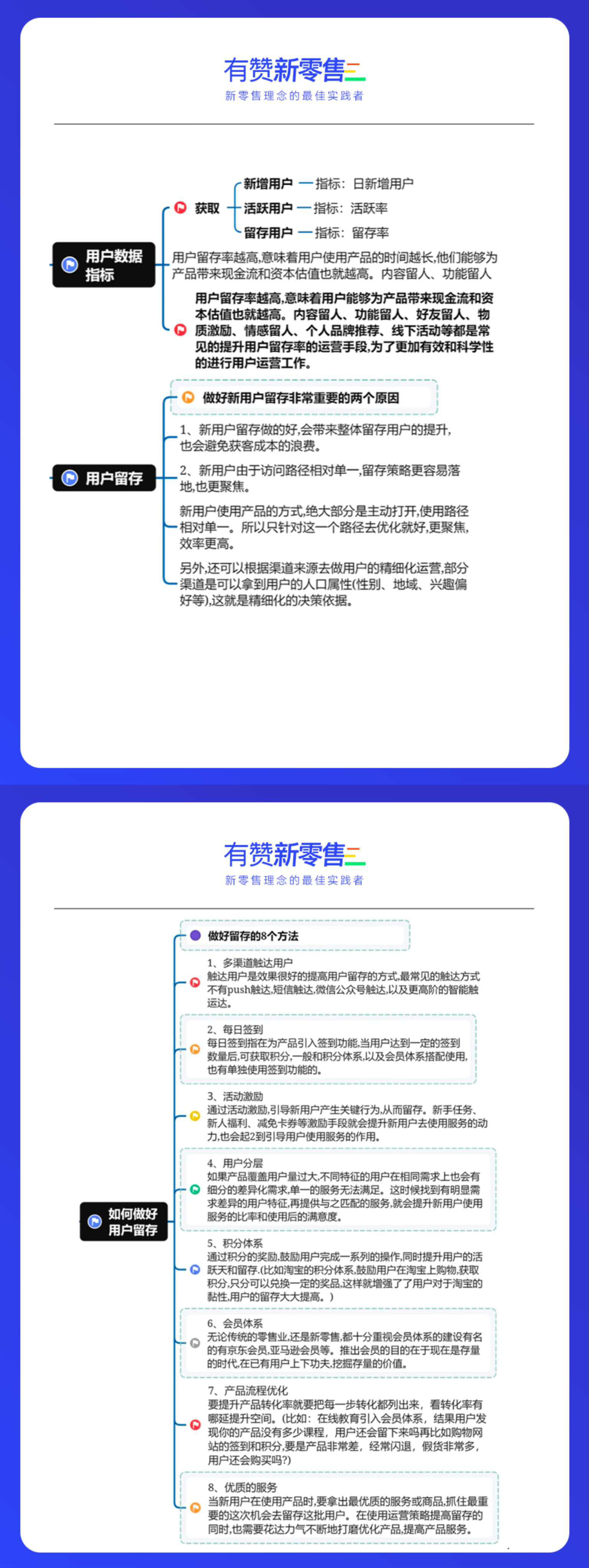 今天和大家分享8种方法,提高新用户留存率: 1、多渠道触达用户 2、每日签到 3、活动激励 4、用户分层 5、积分体系 6、会员体系 7、产品流程优化 8、优质的服务