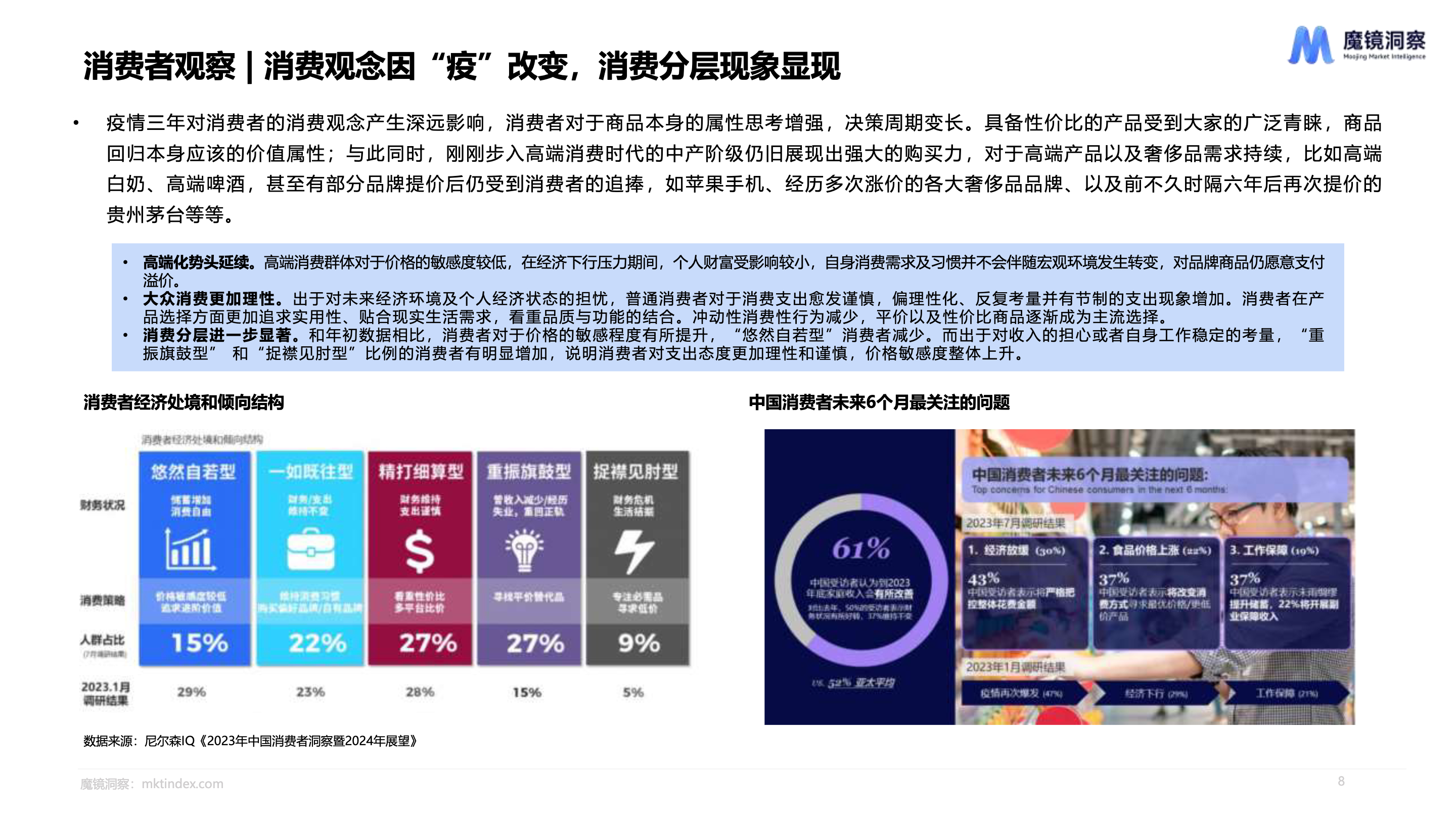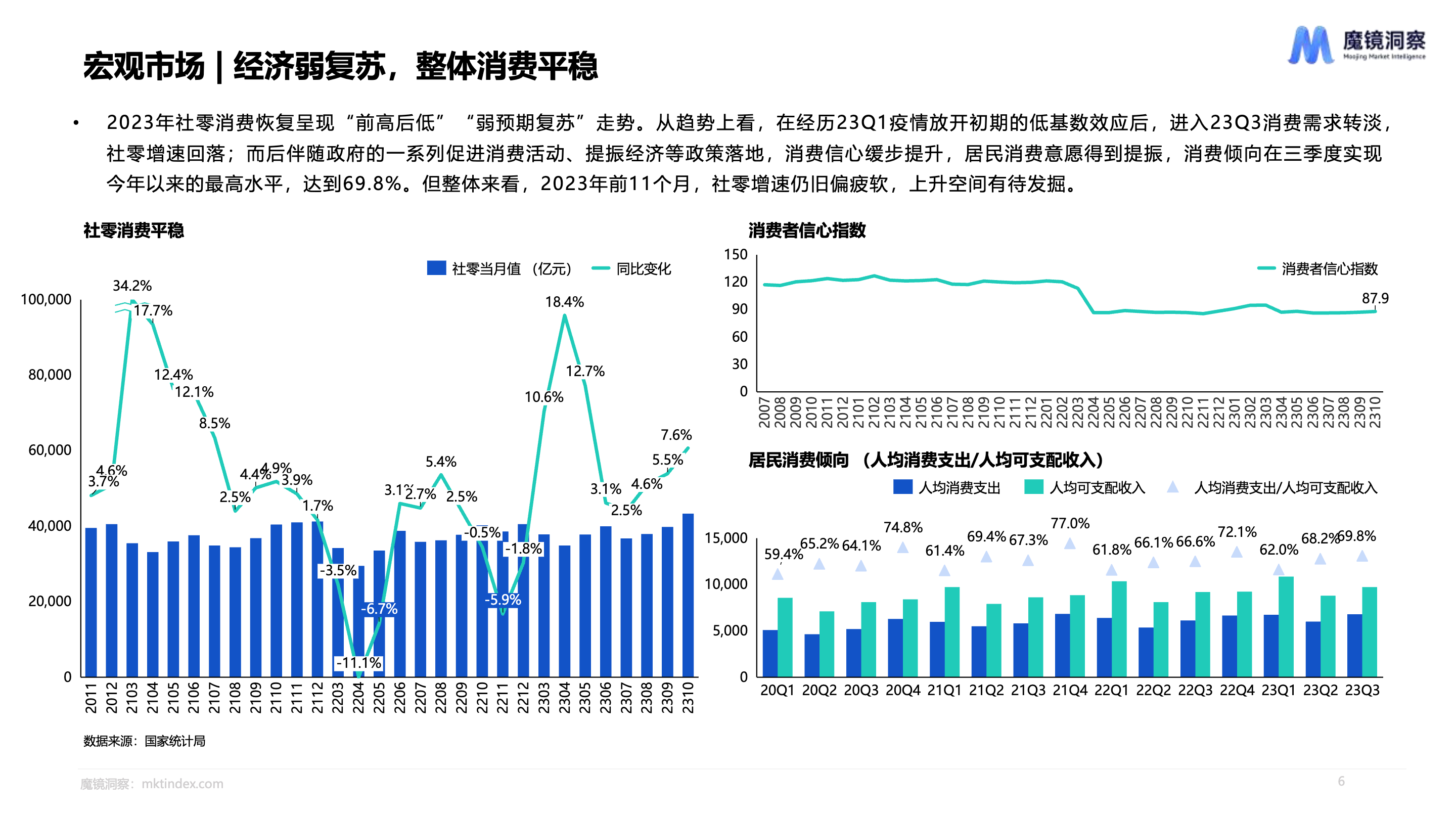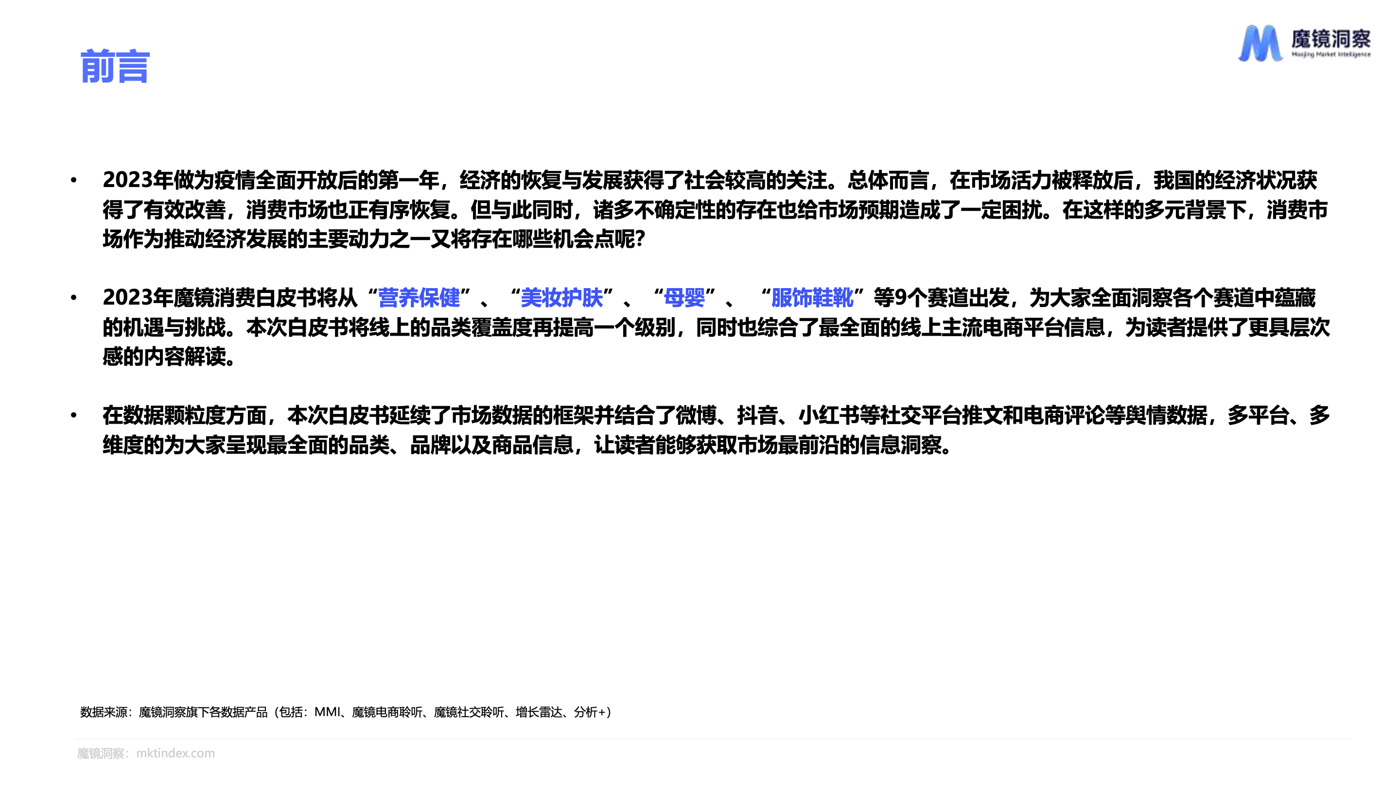 2023年做为疫情全面开放后的第一年,经济的恢复与发展获得了社会较高的关注。 但与此同时,诸多不确定性的存在也给市场预期造成了一定困扰。在这样的多元背景下,消费市场作为推动经济发展的主要动力之一又将存在哪些机会点呢? 本报告将从“营养保健”、“美妆护肤”、“母婴”、 “服饰鞋靴”等9个赛道出发,为大家全面洞察各个赛道中蕴藏的机遇与挑战。同时将市场数据框架结合了微博、抖音、小红书等社交平台推文和电商评论等舆情数据,多平台、多维度的为大家呈现最全面的品类、品牌以及商品信息,帮助大家更好的了解生意经营。