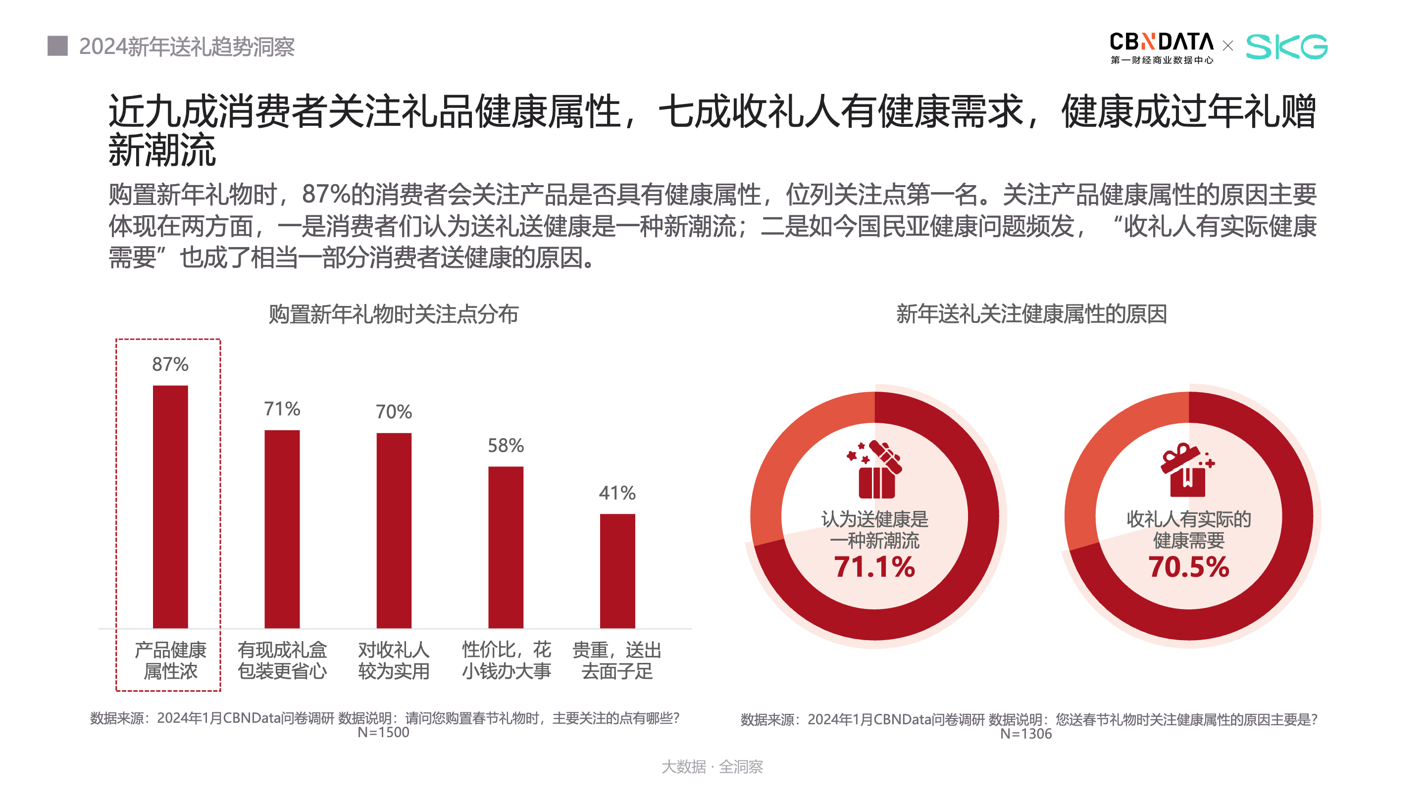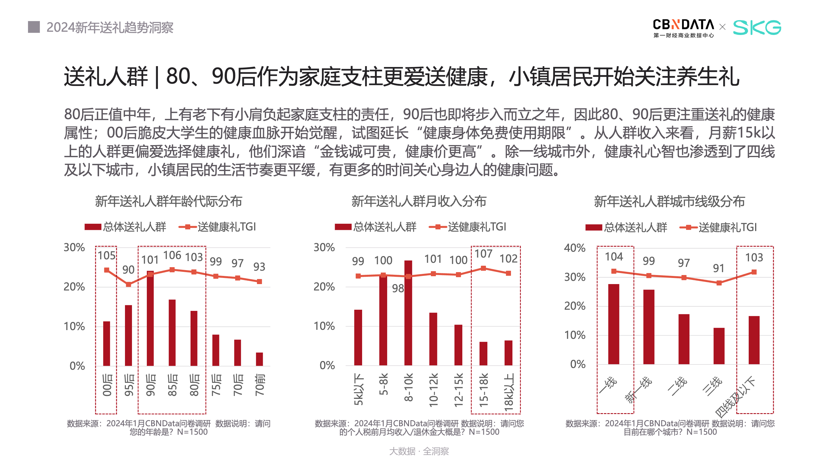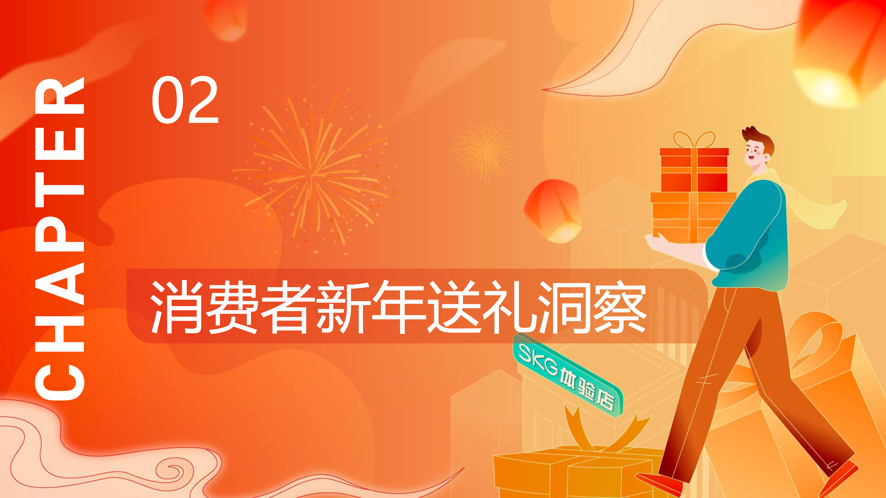 中华民族自古以来都称礼仪之邦,人们重视与亲朋好友的沟通联系。 逐年递增的中国礼物经济市场规模,在2024年将达13777亿元。中国传统节日成为送礼好时节,96%的“送礼人〞会选择在春节、中秋、端午等中国传统节日表达心意。而在农历新年前 “必做事项〞 的调研中,有82%的消费者表示 〝购置春节礼品”与“购置年夜饭食材〞是他们每年必做的头等大事。 本报告主要分享: 1.新年离谱消费现状怎么样? 2.消费者新年送礼洞察分析 3.健康“黑科技”走红新年礼单 4.新年送礼市场总结分析