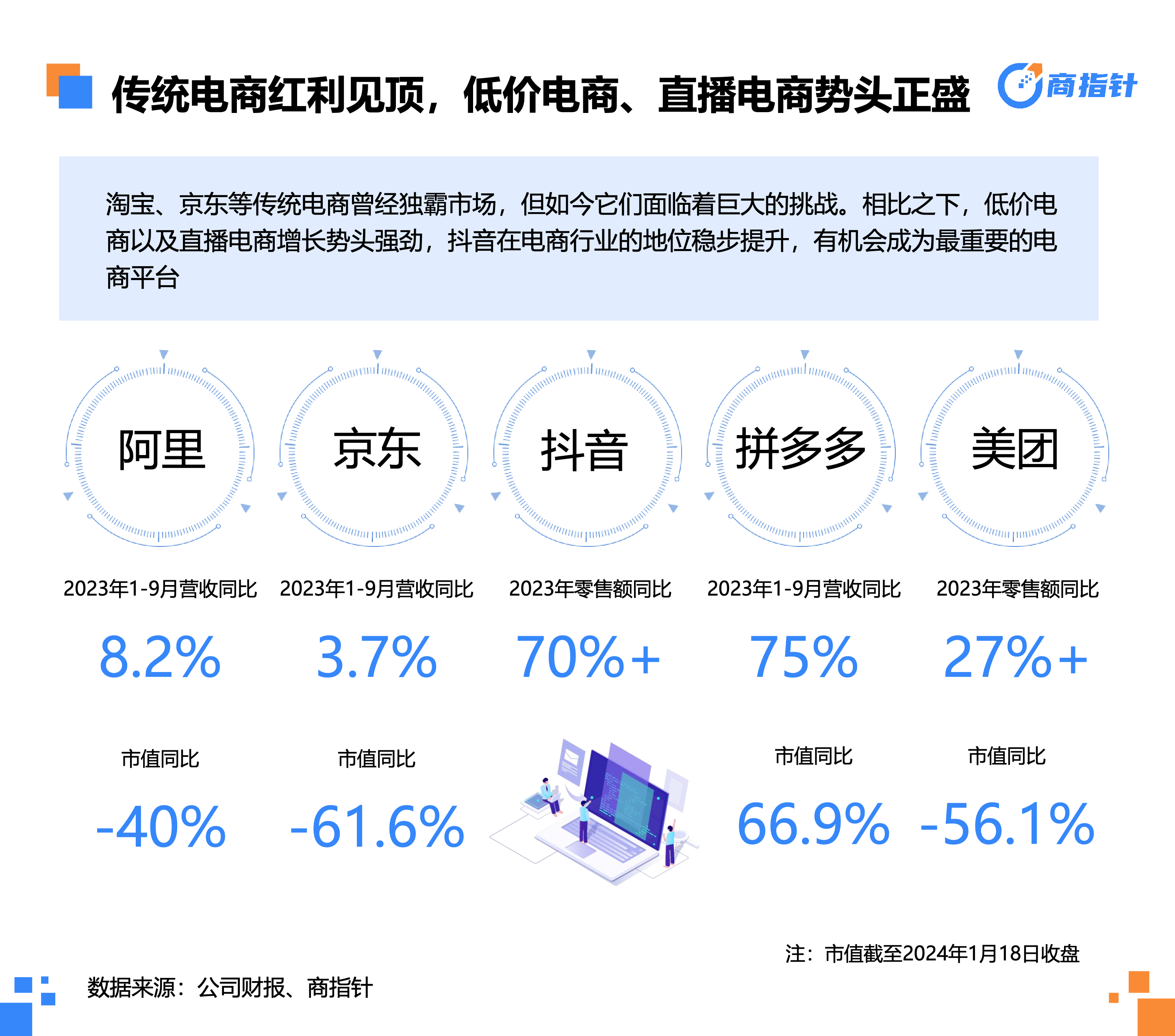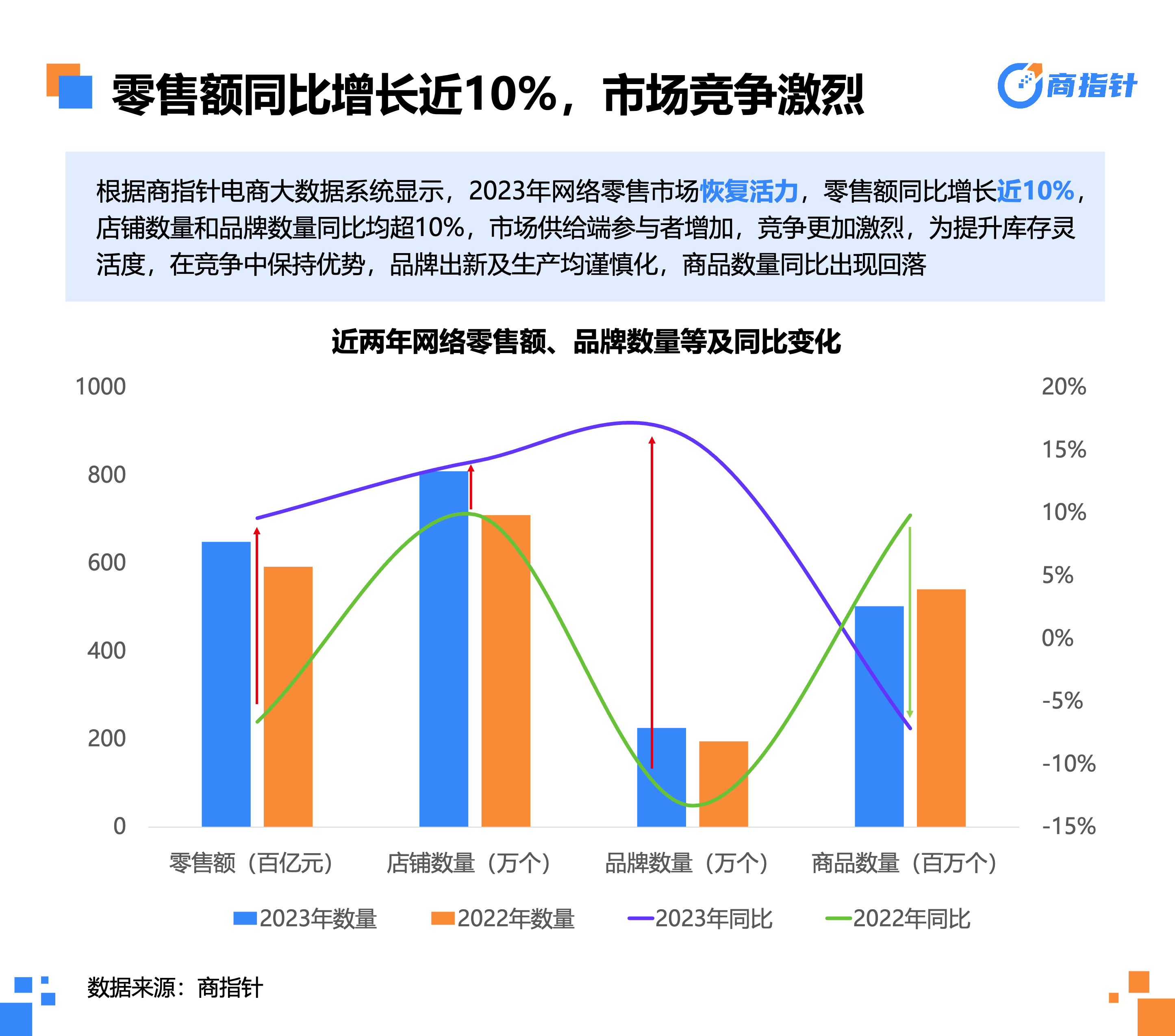 2023年,网络零售同比增速为11.0%,比GDP同比增速高5.8个百分点,比社会零售同比增速高3.8个百分点。社会零售对GDP增长贡献率超50%,实物网络零售对社零增长贡献率超30%,网络零售对国内消费的拉动作用持续扩大。 各个品类表现如何? 网络零售呈现出那些特点? 网络零售未来趋势又会如何? 查看完整报告获取更多信息~