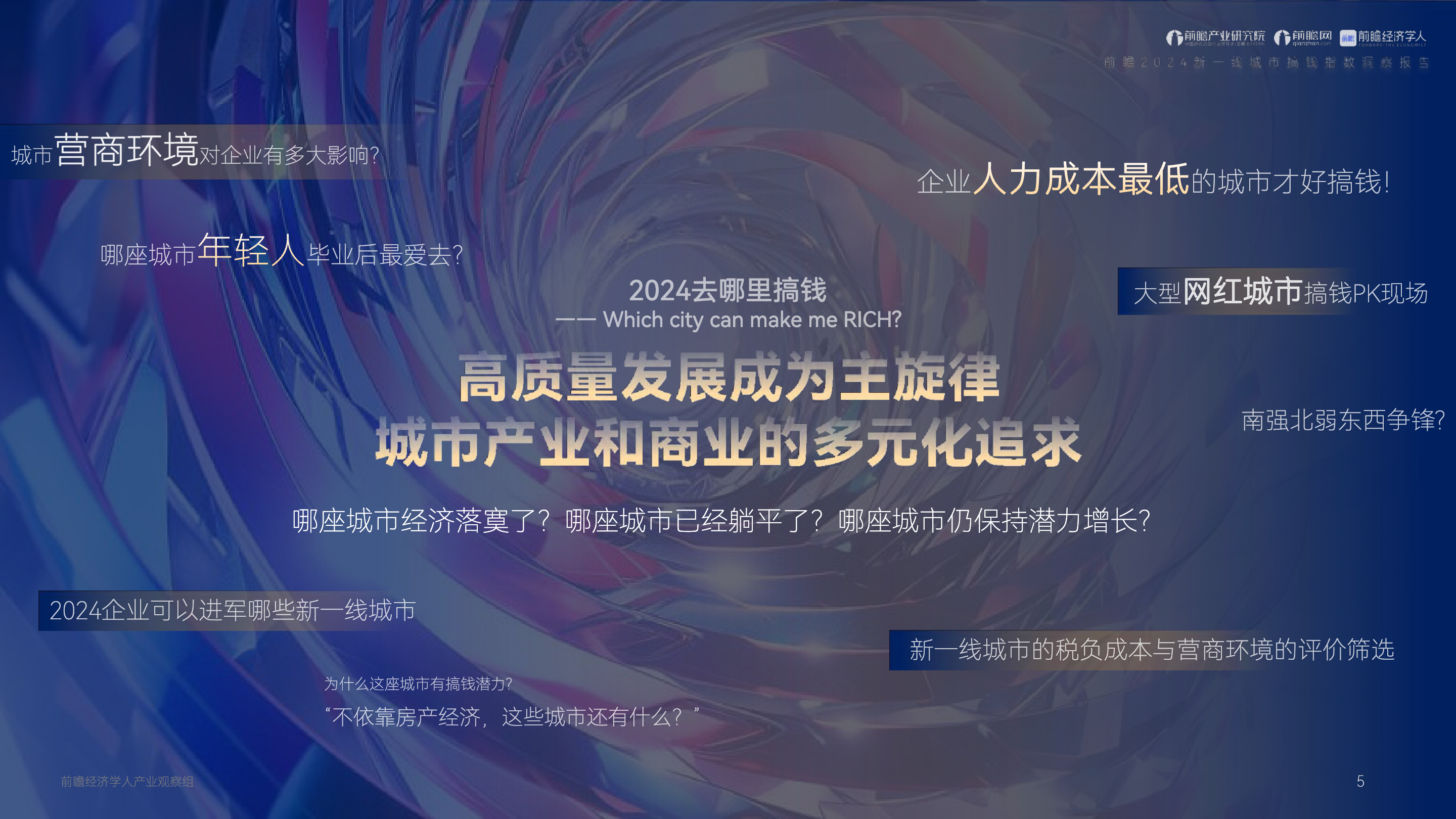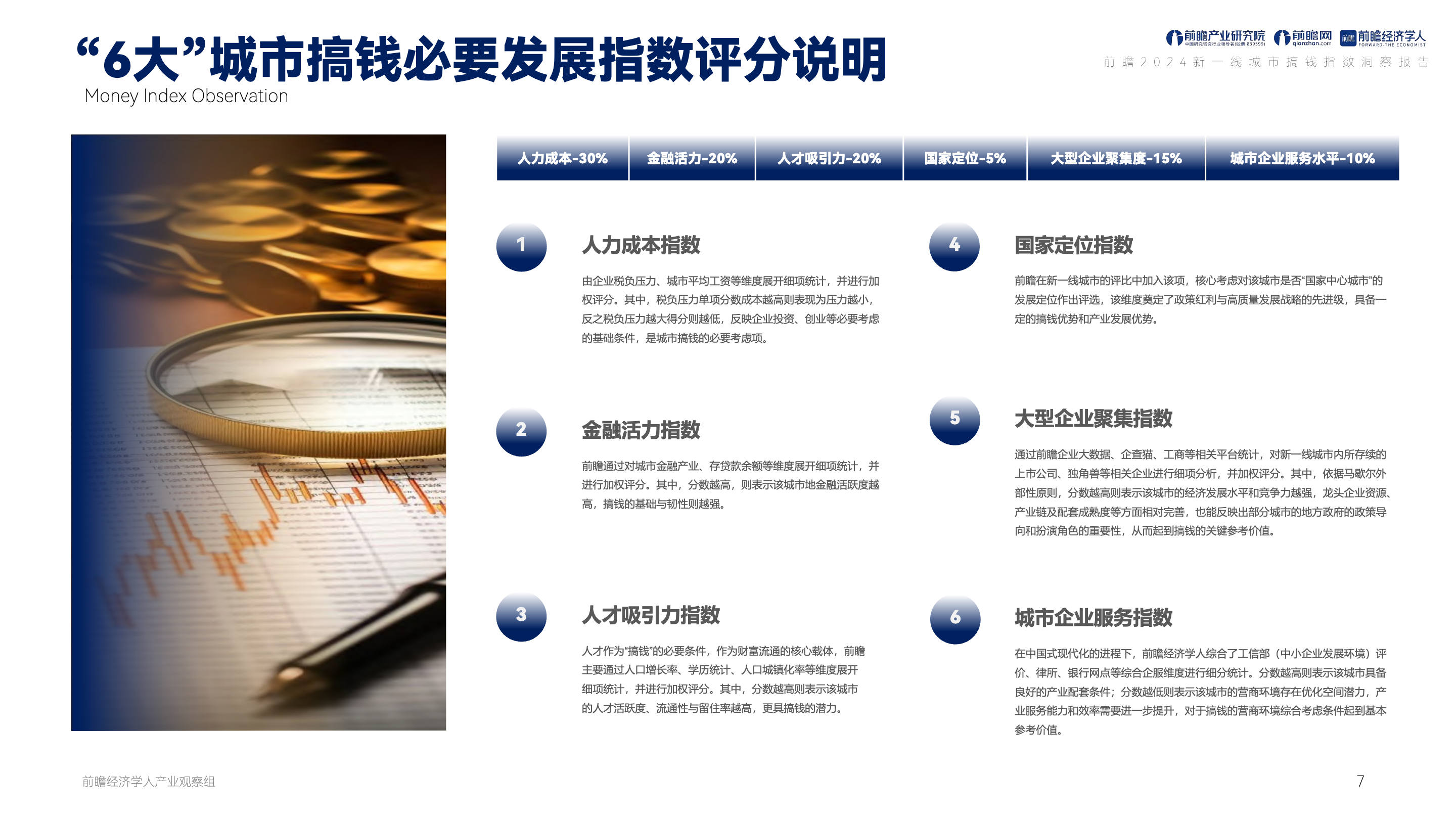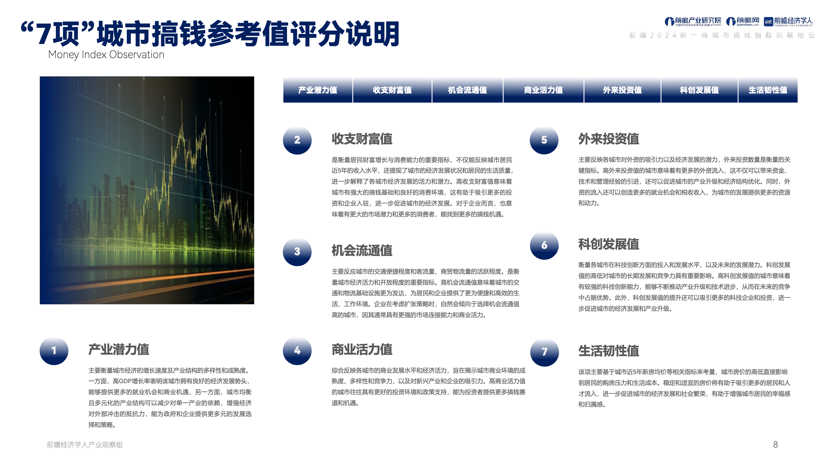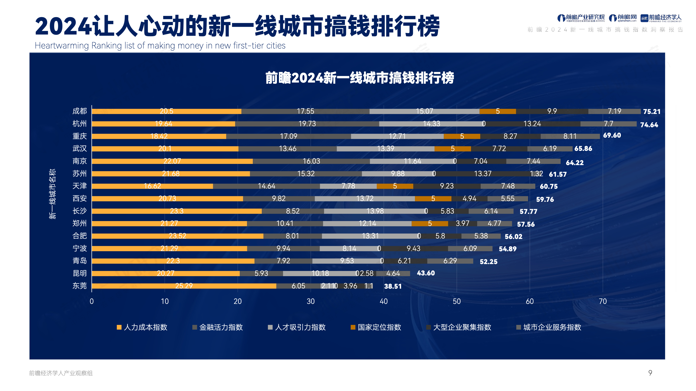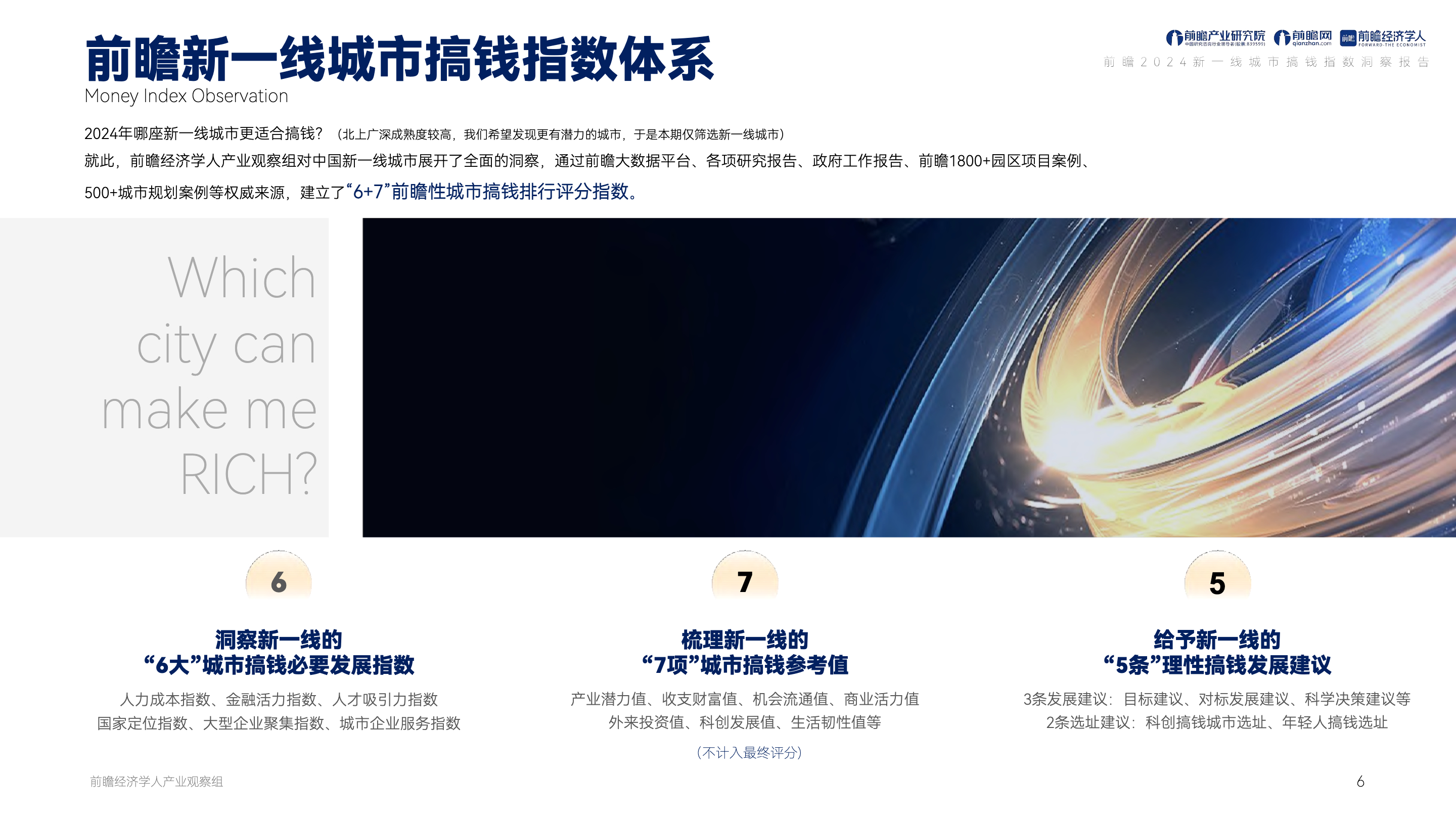 2024年哪座新一线城市更适合搞钱?(北上广深成熟度较高,我们希望发现更有潜力的城市,于是本期仅筛选新一线城市) 就此,前瞻经济学人产业观察组对中国新一线城市展开了全面的洞察,通过前瞻大数据平台、各项研究报告、政府工作报告、前瞻1800+园区项目案例、 500+城市规划案例等权威来源,建立了“6+7”前瞻性城市搞钱排行评分指数,并给予新一线的 “5条”理性搞钱发展建议。完整内容可查看报告获取~