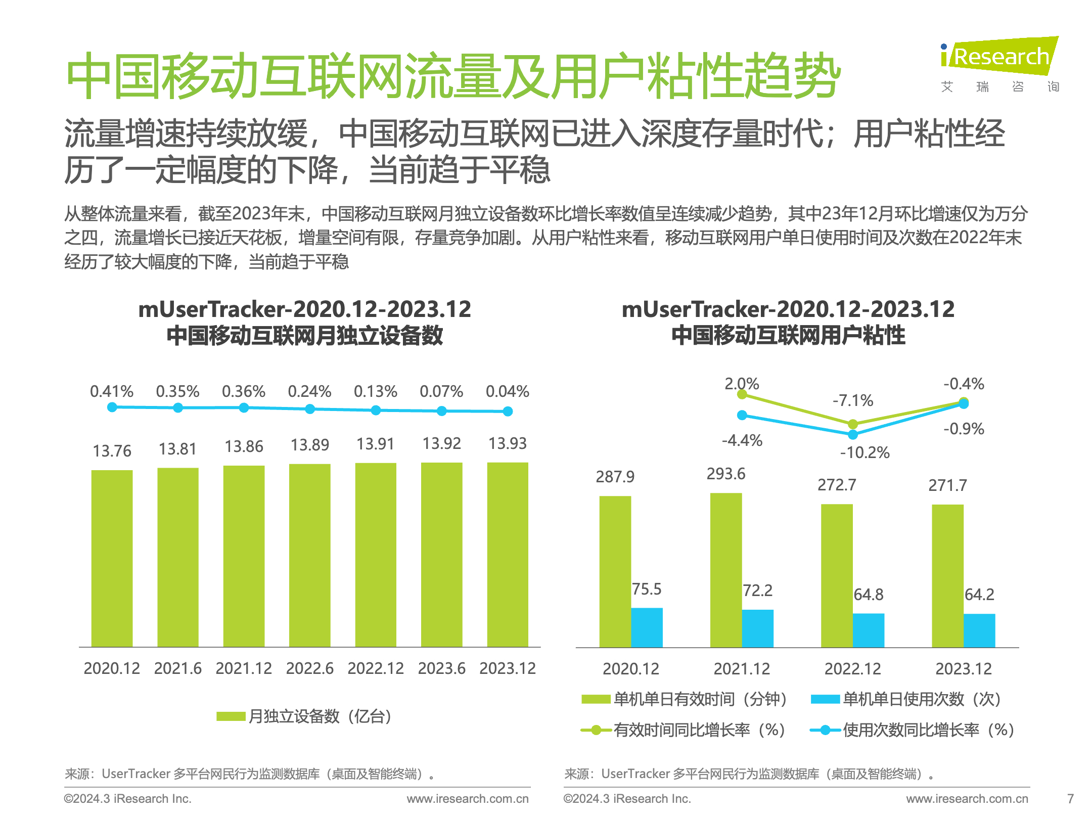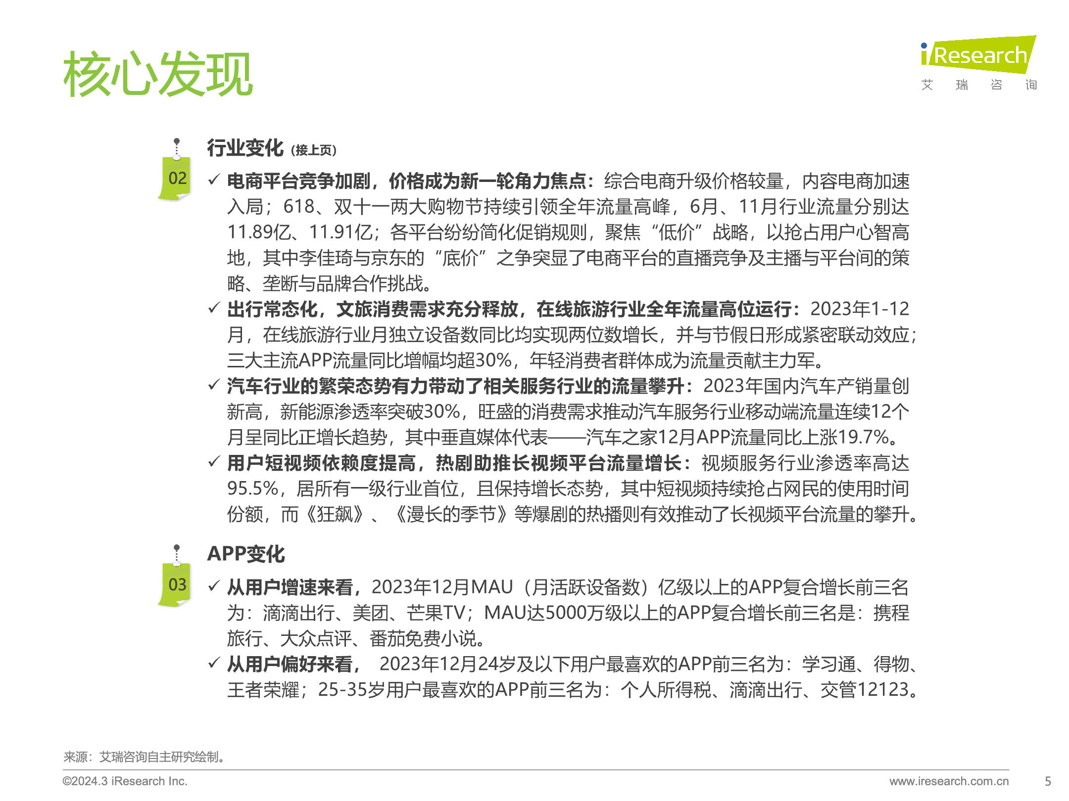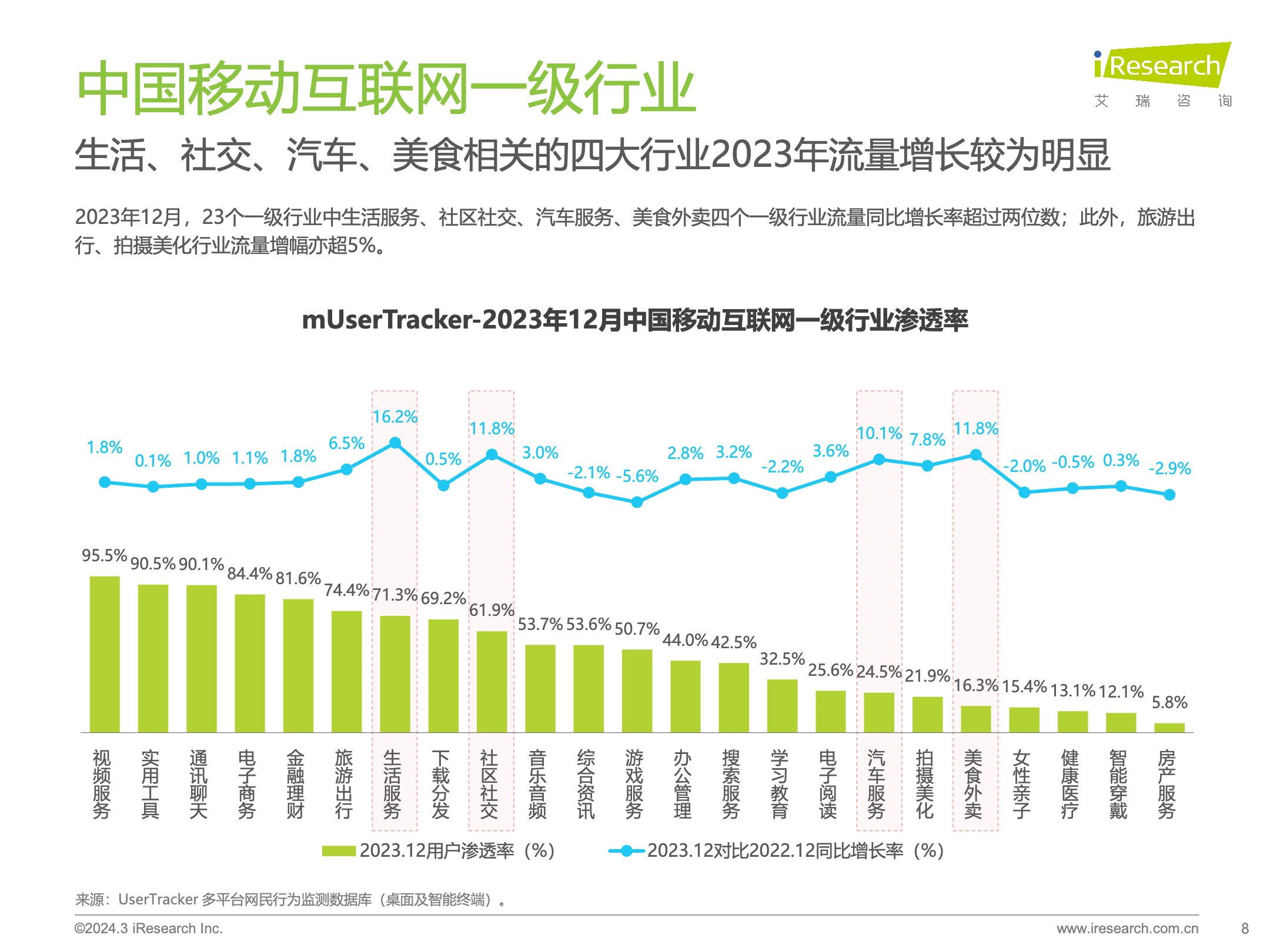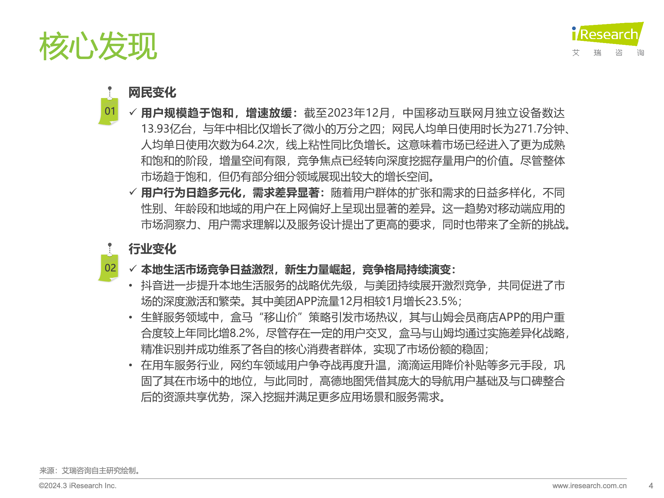 2023年中国移动互联网发展情况如何?重点细分行业表现如何? 1.网民变化 (1)用户规模趋于饱和,增速放缓 (2)用户行为日趋多元化,需求差异显著 2.行业变化 (1)本地生活市场竞争日益激烈,新生力量崛起,竞争格局持续演变 (2)电商平台竞争加剧,价格成为新一轮角力焦点 (3)出行常态化,文旅消费需求充分释放,在线旅游行业全年流量高位运行 (4)汽车行业的繁荣态势有力带动了相关服务行业的流量攀升 (5)用户短视频依赖度提高,热剧助推长视频平台流量增长 更多内容,查看完整报告获得~