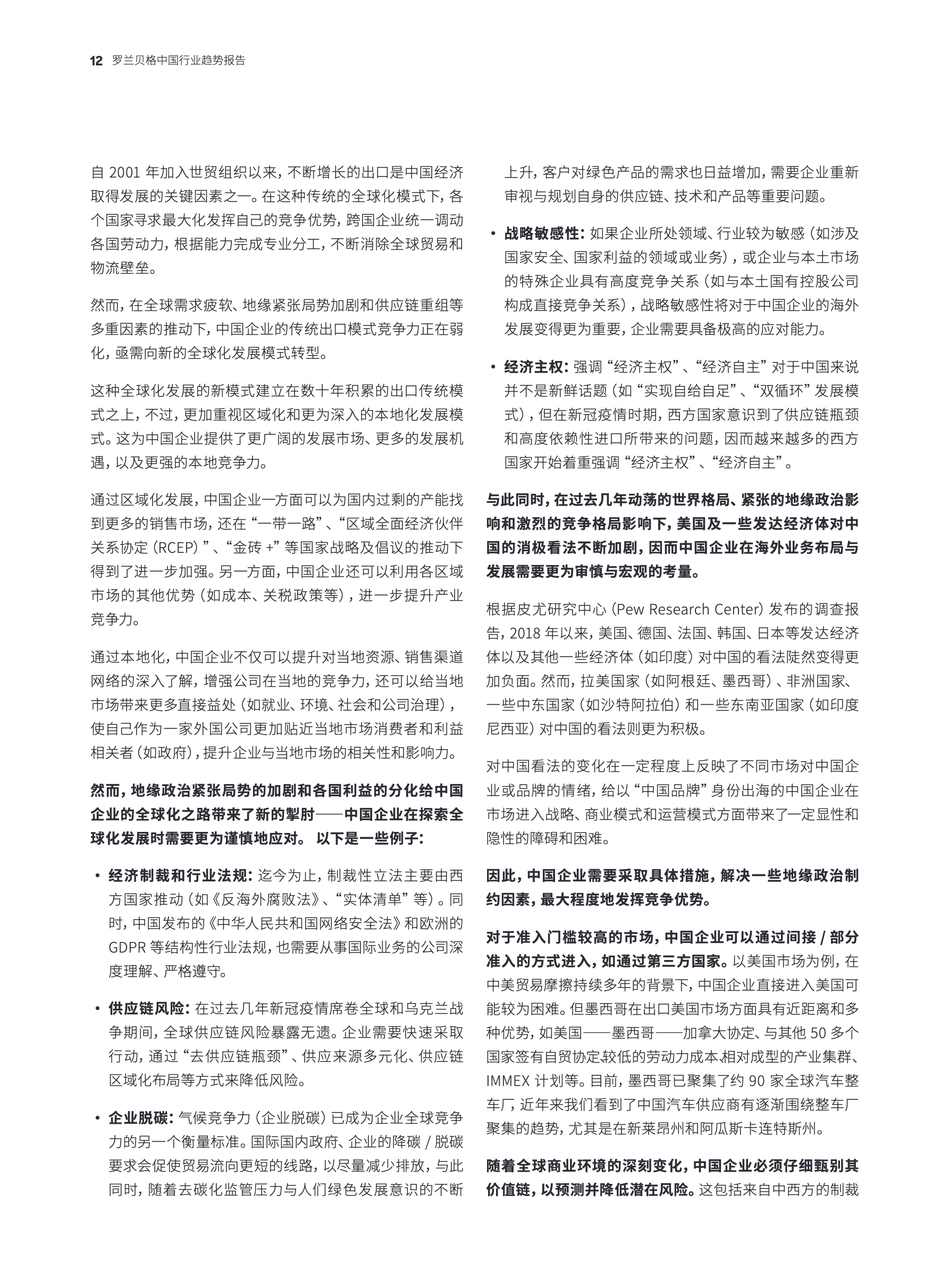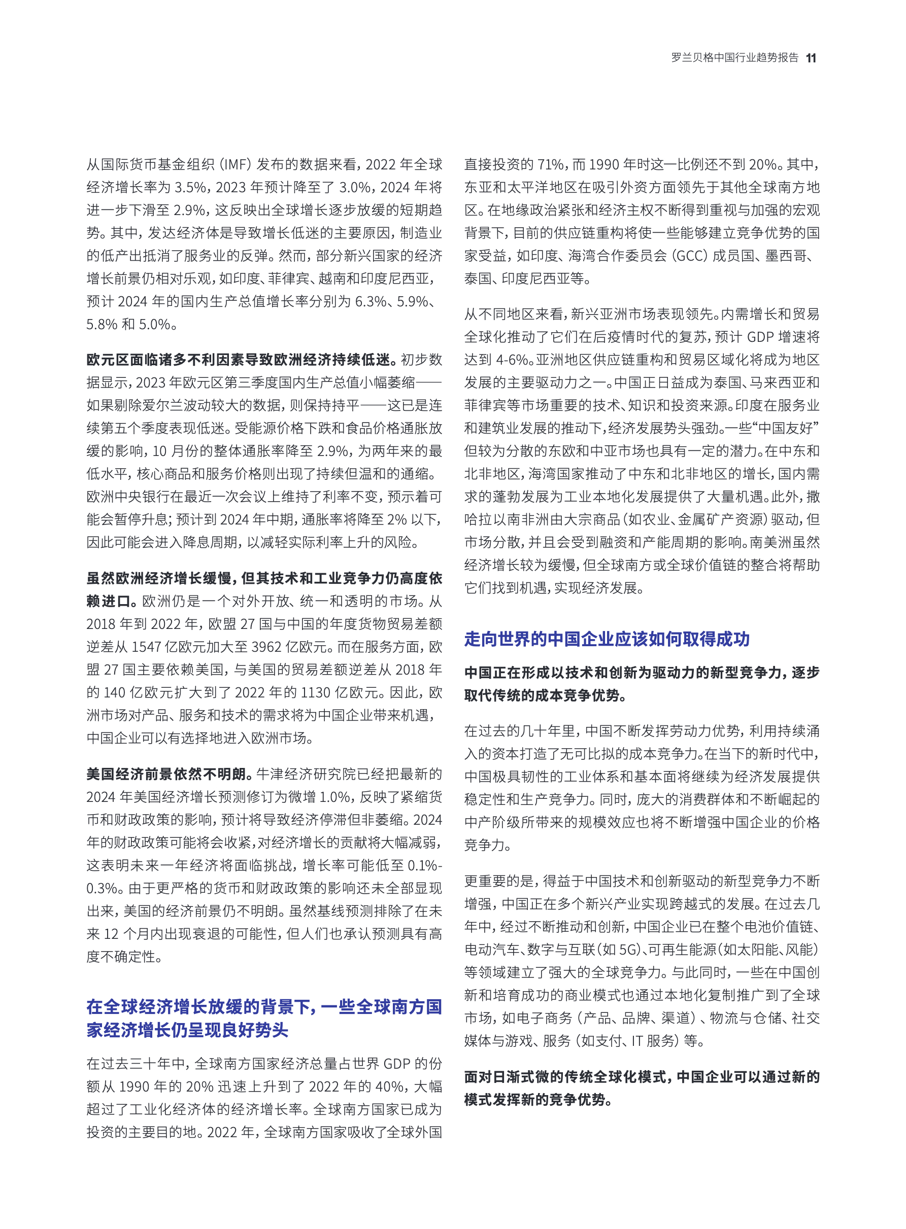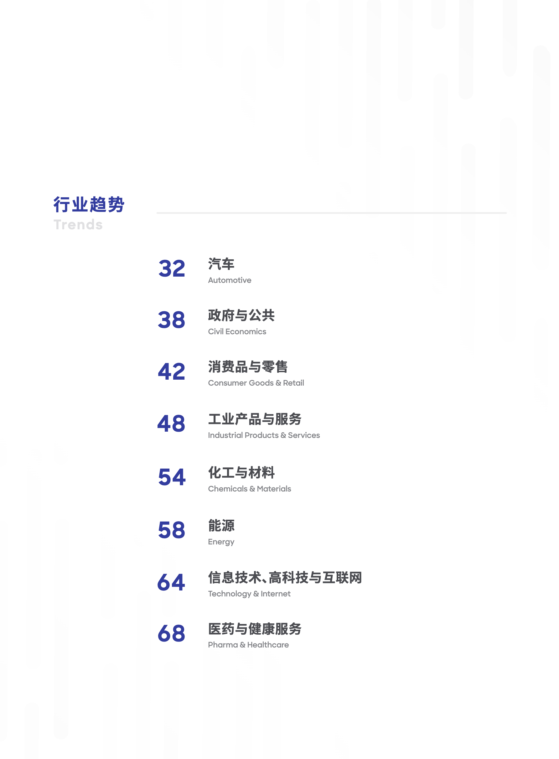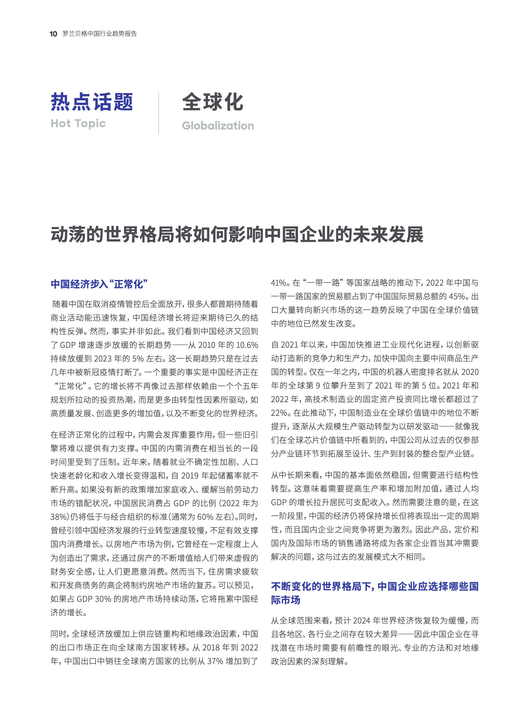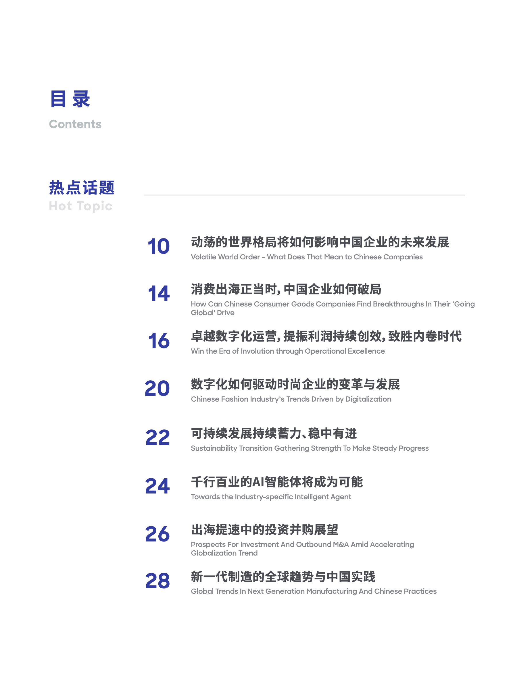 近几年总体来说,中国经济的表现不错,以强大的韧性顶住了诸多挑战。 由于中国拥有不断提高的生产率、完整的深度产业链集群和发达的基础设施,中国曾经是,现在是,以后仍将是世界工厂。广大的国内市场叠加强大的出口产业基础让中国很难被替代。 本报告将重点讨论近期热点话题及行业趋势分析,帮助广大企业更好地抓住机遇创造利润。 热点话题: 动荡的世界格局将如何影响中国企业的未来发展; 消费出海正当时,中国企业如何破局; 卓越数字化运营,提振利润持续创效,致胜内卷时代 ; 数字化如何驱动时尚企业的变革与发展; 可持续发展持续蓄力、稳中有进; 千行百业的AI智能体将成为可能; 出海提速中的投资并购展望; 新一代制造的全球趋势与中国实践;