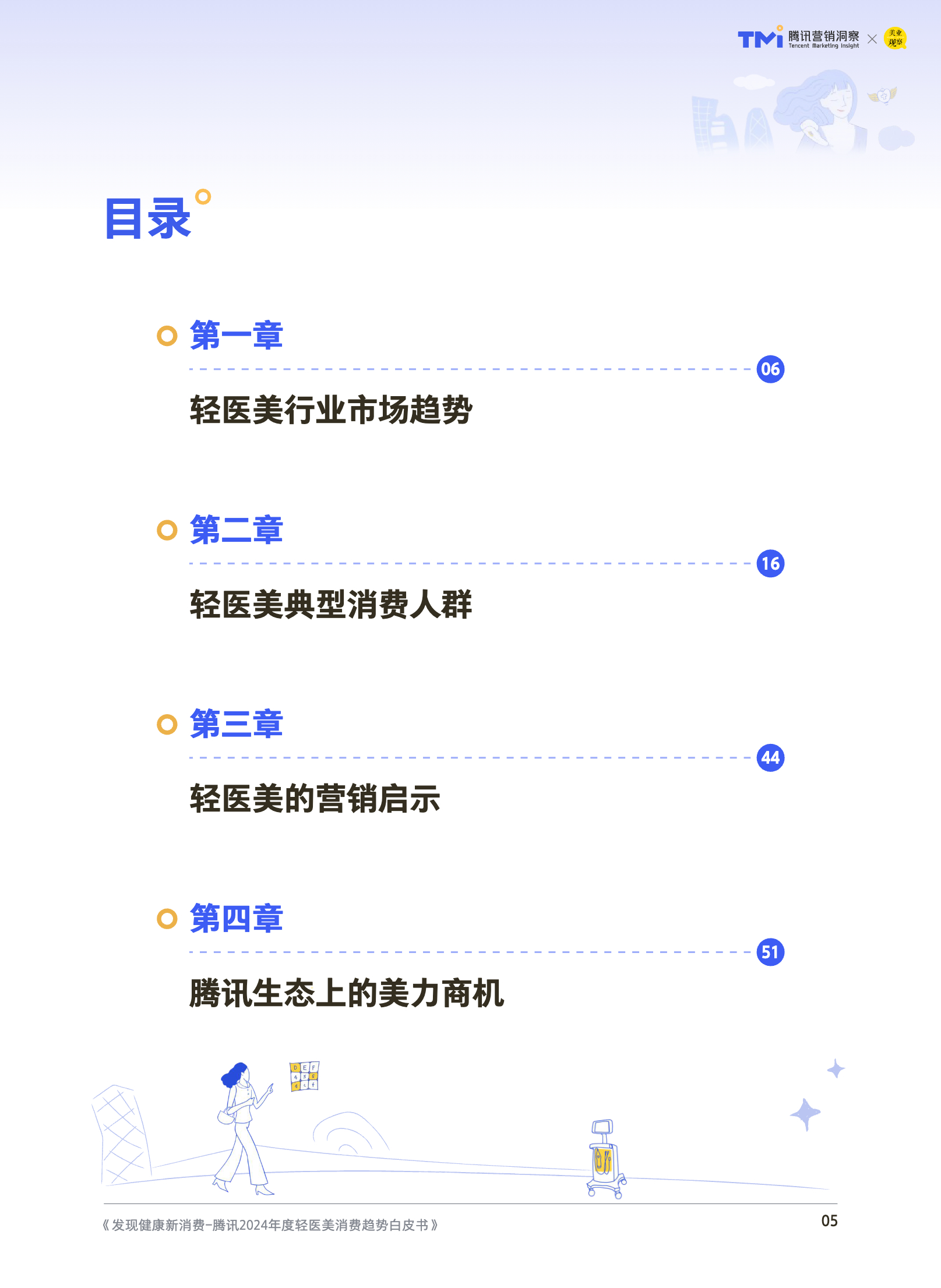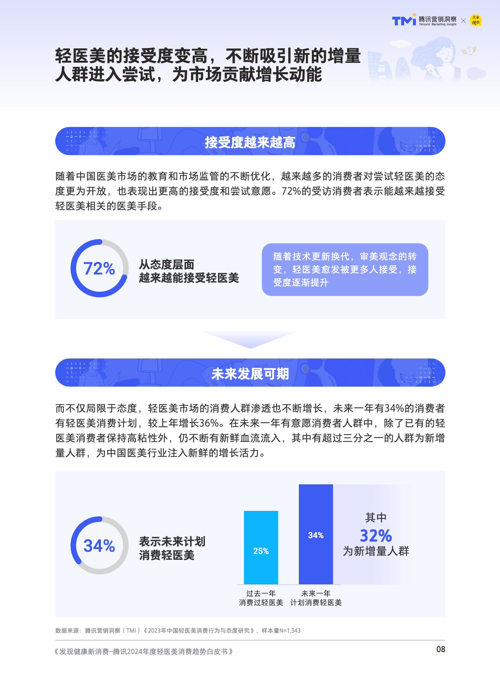 现阶段的轻医美还不是完整的轻医美。现阶段轻医美,以注射美容、光电设备抗衰美容、水光针为主;而完整的轻医美,还应该包括医美皮肤管理、医美形体管理,以及抗衰之外的多种皮肤问题解决。 中国轻医美未来发展八大发展趋势包括:安全合规、审美在线、轻龄化、生活化、更悦己、更开放、物有所值、美体需求。为赶上这八大趋势,为从趋势中拿到好结果,对于轻医美机构来说需要和将要提升的能力板块包括:人力资源、专业技术、专业营销。 细节内容查看完整报告~