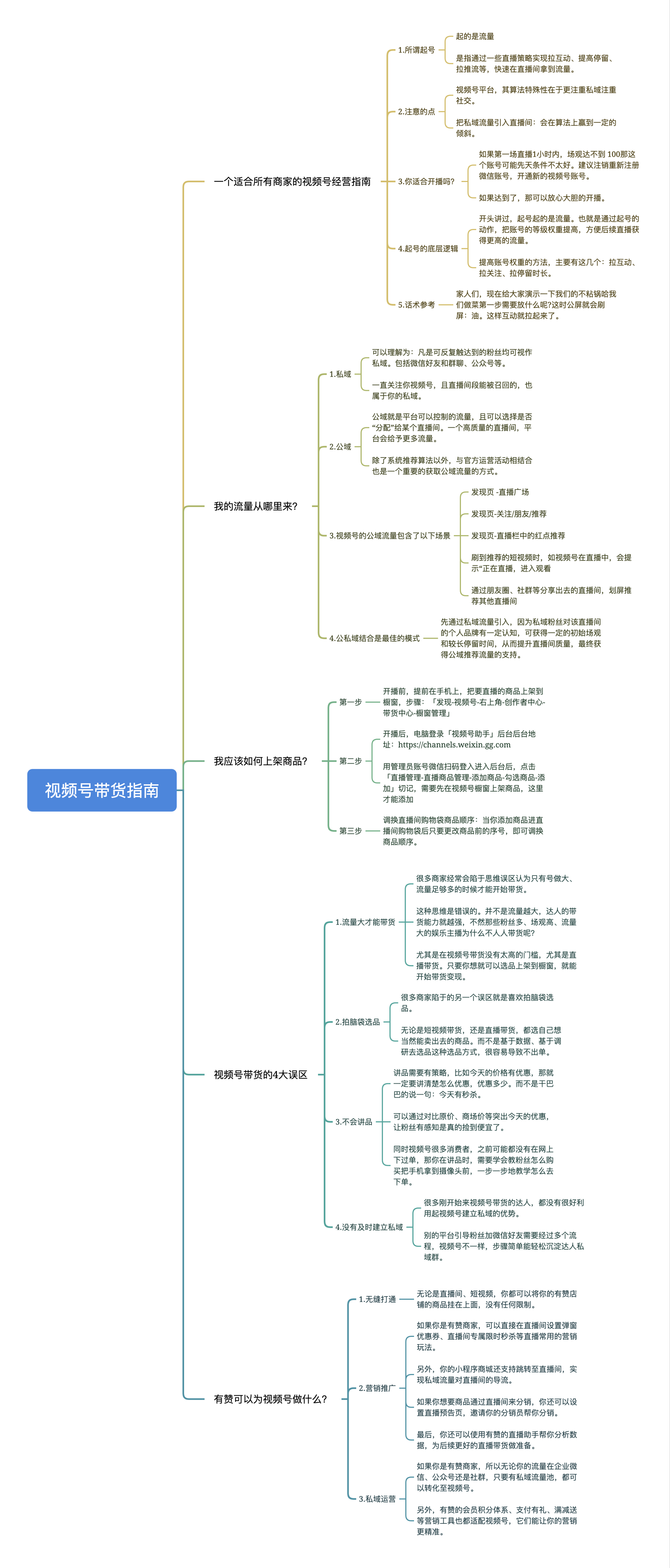 我想在视频号带货,请问应该怎么做?上手视频号直播,到底难不难? 关于「视频号直播带货」的问题,今天我们从头开始,为商家带来「从0到1教你做视频号带货」。 1.一个适合所有商家的视频号经营指南 2.我的流量从哪里来? 3.我应该如何上架商品? 4.视频号带货的4大误区 5.有赞可以为视频号做什么?
