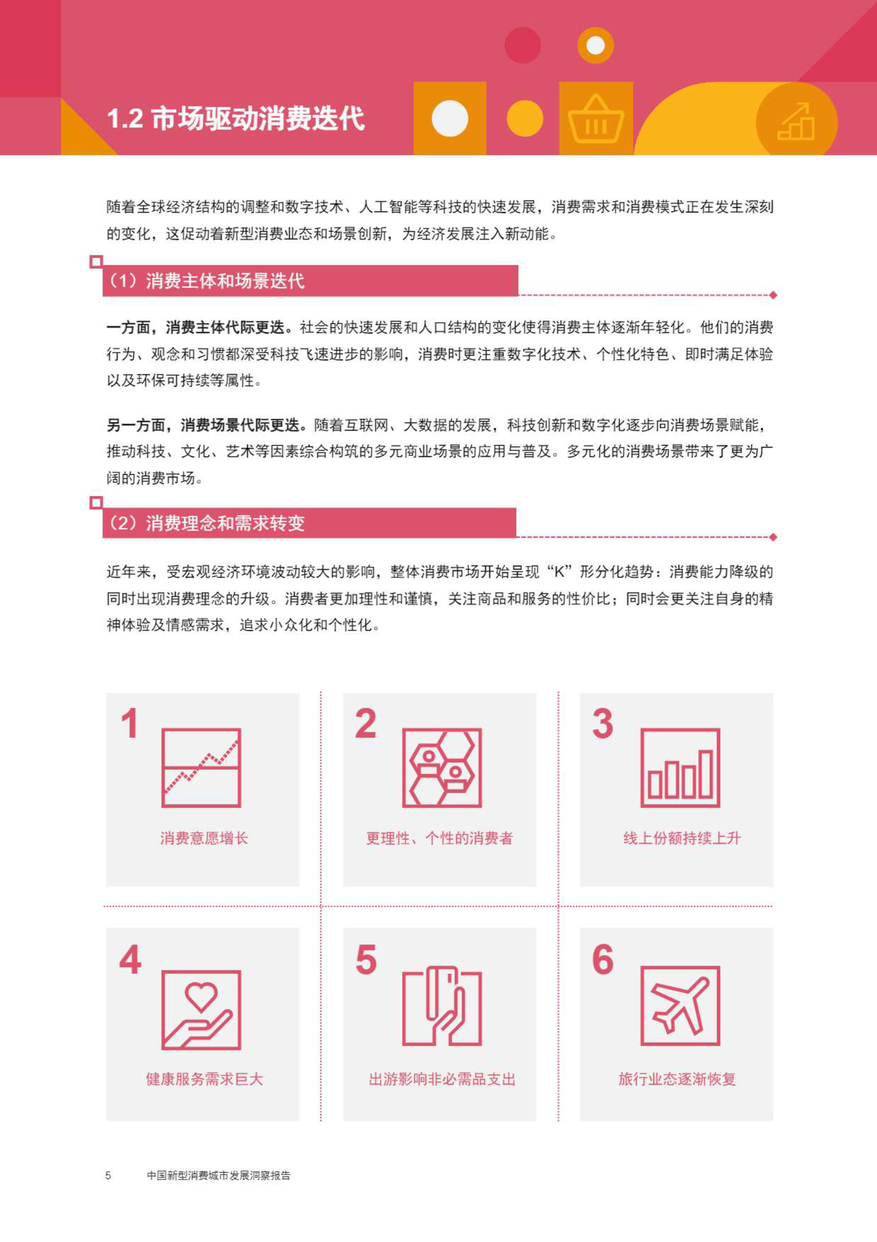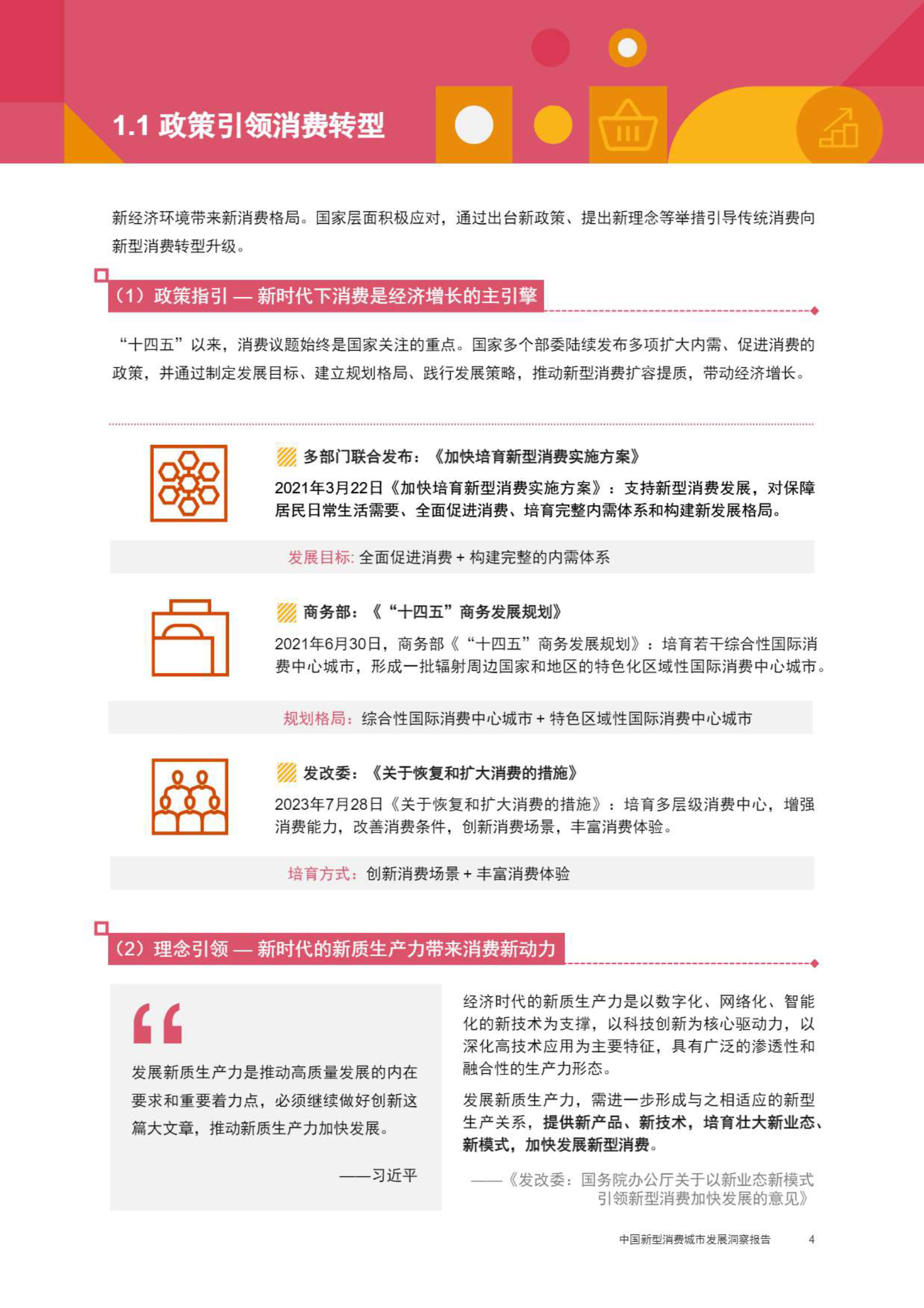 随着经济全球化持续推进、科技日益革新以及经济格局演进,我们的消费环境面临着日新月异的变化,“新型消费”时代己经到来。新浪潮下,不同城市基于其白身禀赋特征,通过多元化的政策引导和场景建设,逐步形成了一批个性鲜明、特色各异的 “新型消费城市”,为未来消费持续迭代升级提供了优质的土壤。 本报告对国际消费中心城市的发展历程及进行回顾,对各类“新型消费城市”及新型消费场景进行识别、归纳,并对我国各城市在新消费时代下建设 “新型消费城市”提出思考和建议。