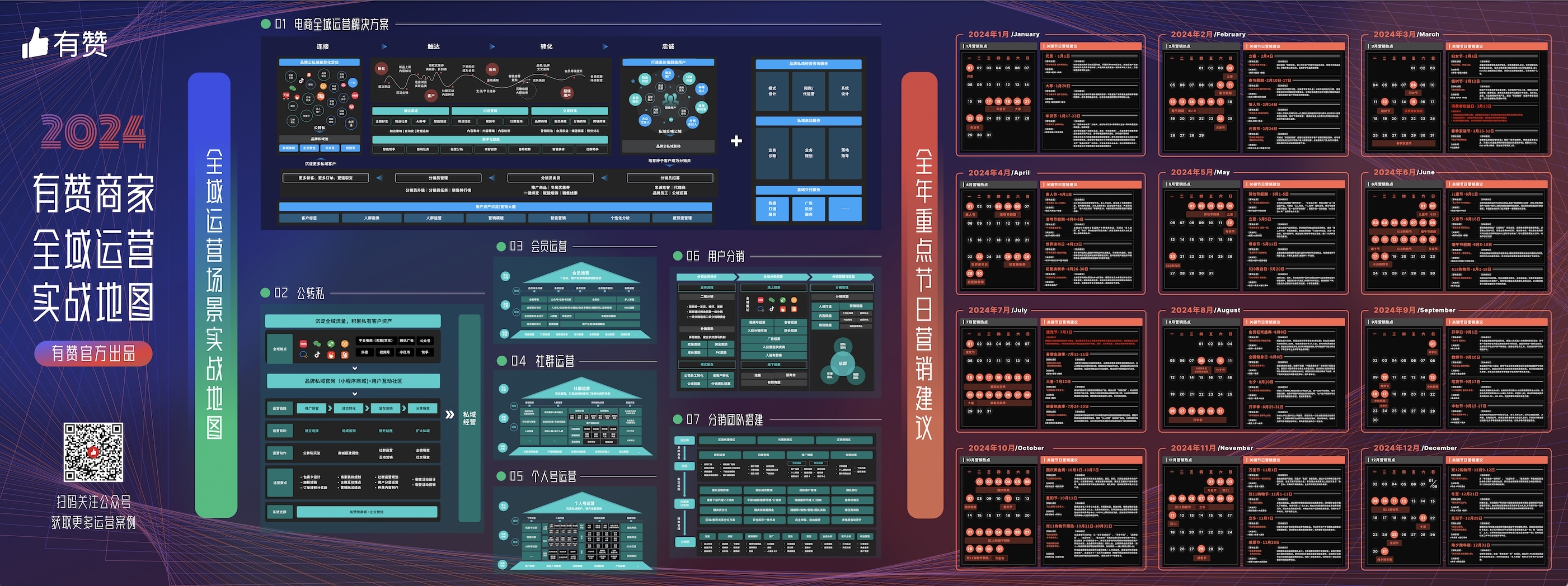 这几年生意越来越难做了:环境变化快,消费风向变化也很快,消费者的心更难懂了,生意增长也越来越难…… 《2024年有赞私域运营实战地图》,助你实现利润新增长。 这份实战地图为大家提供了「全域运营场景实战地图」和「全年重点节日营销建议」,为大家详细拆解了电商全域运营解决方案、公转私、会员运营、社群运营、个人号运营、用户分销以及分销团队搭建,让大家更好匹配自身生意场景,深入了解各环节的落地关键动作。 「全年重点节日营销建议」,也为大家提供对应热点的活动主题和玩法介绍,方便大家更有节奏去规划好接下来一整年的营销活动,创造更多生意增量。