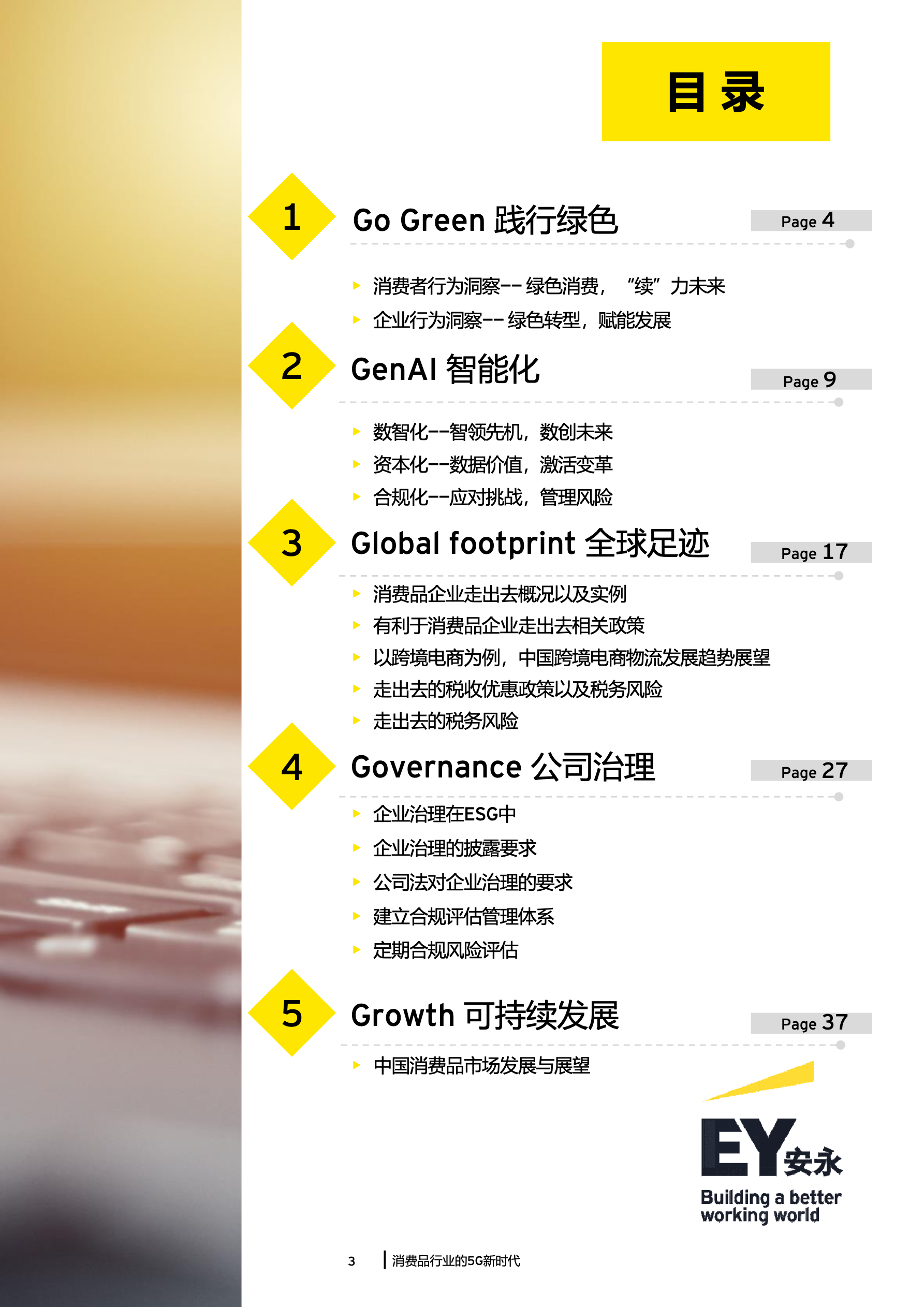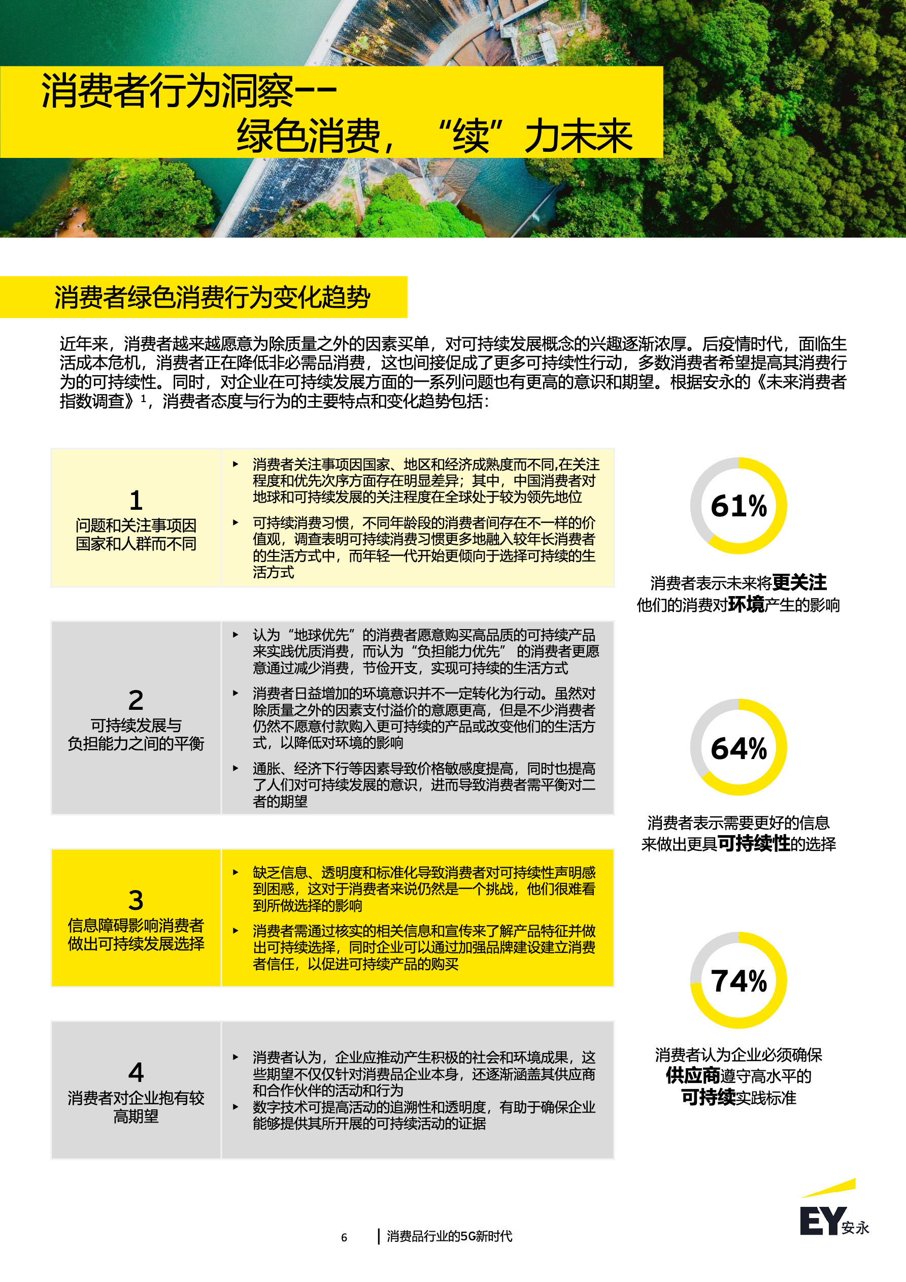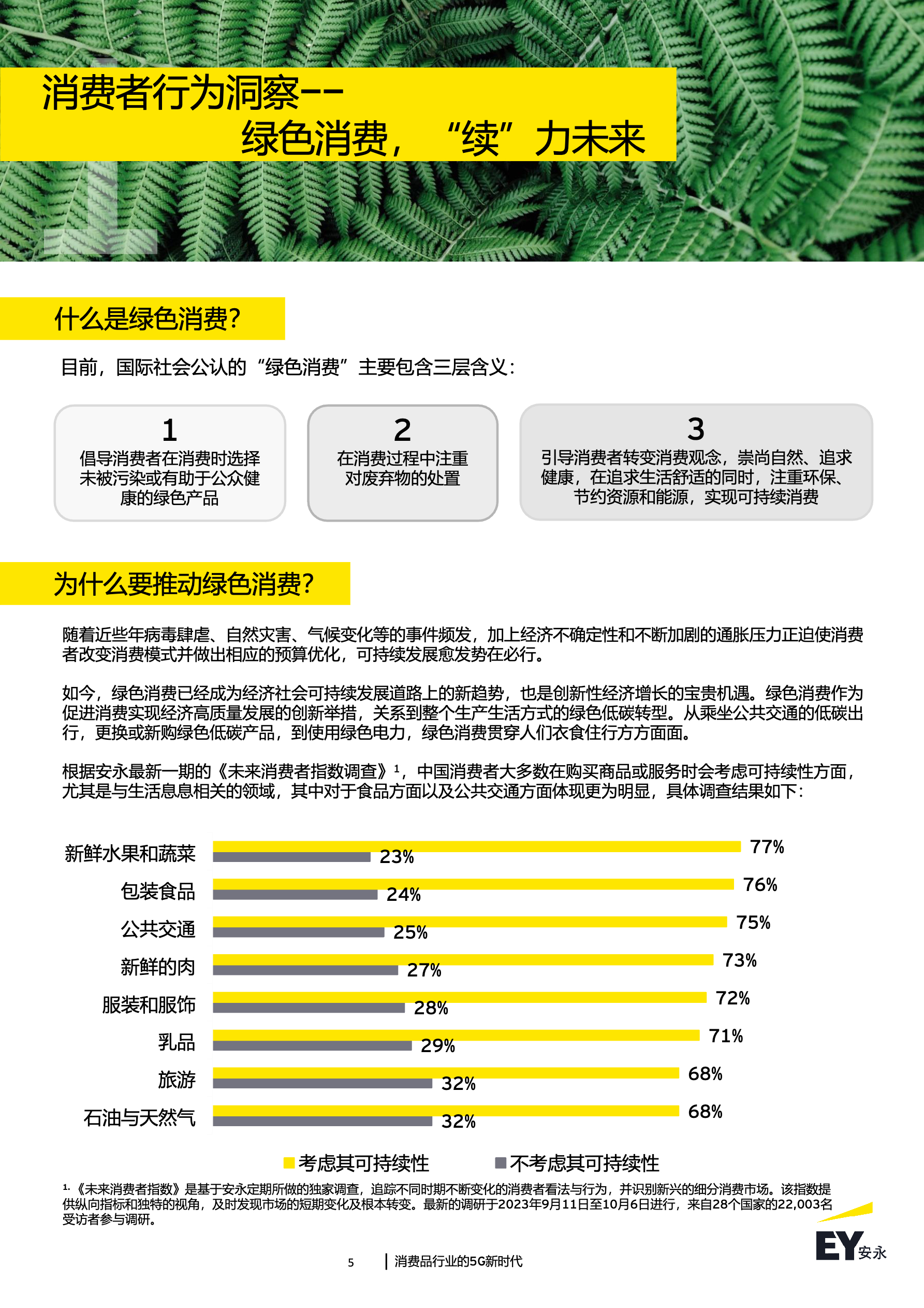 随着我国居民收入增长和中等收入群体规模扩大,消费实现了扩容提质的韧性增长。叠加促消费政策继续发力,新业态新模式不断涌现。对于中国消费品行业的新亮点以及新动向,我们将其整理概括为“5G新时代”。“5G”分别意味着“Go Green-践行绿色”“Growth-可持续发展”。本文从以下几方面介绍了我国消费品市场的新动向。