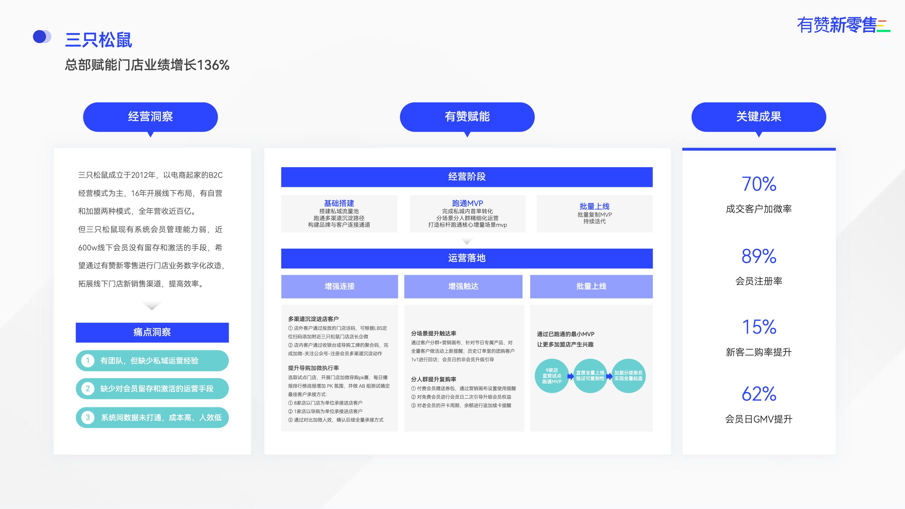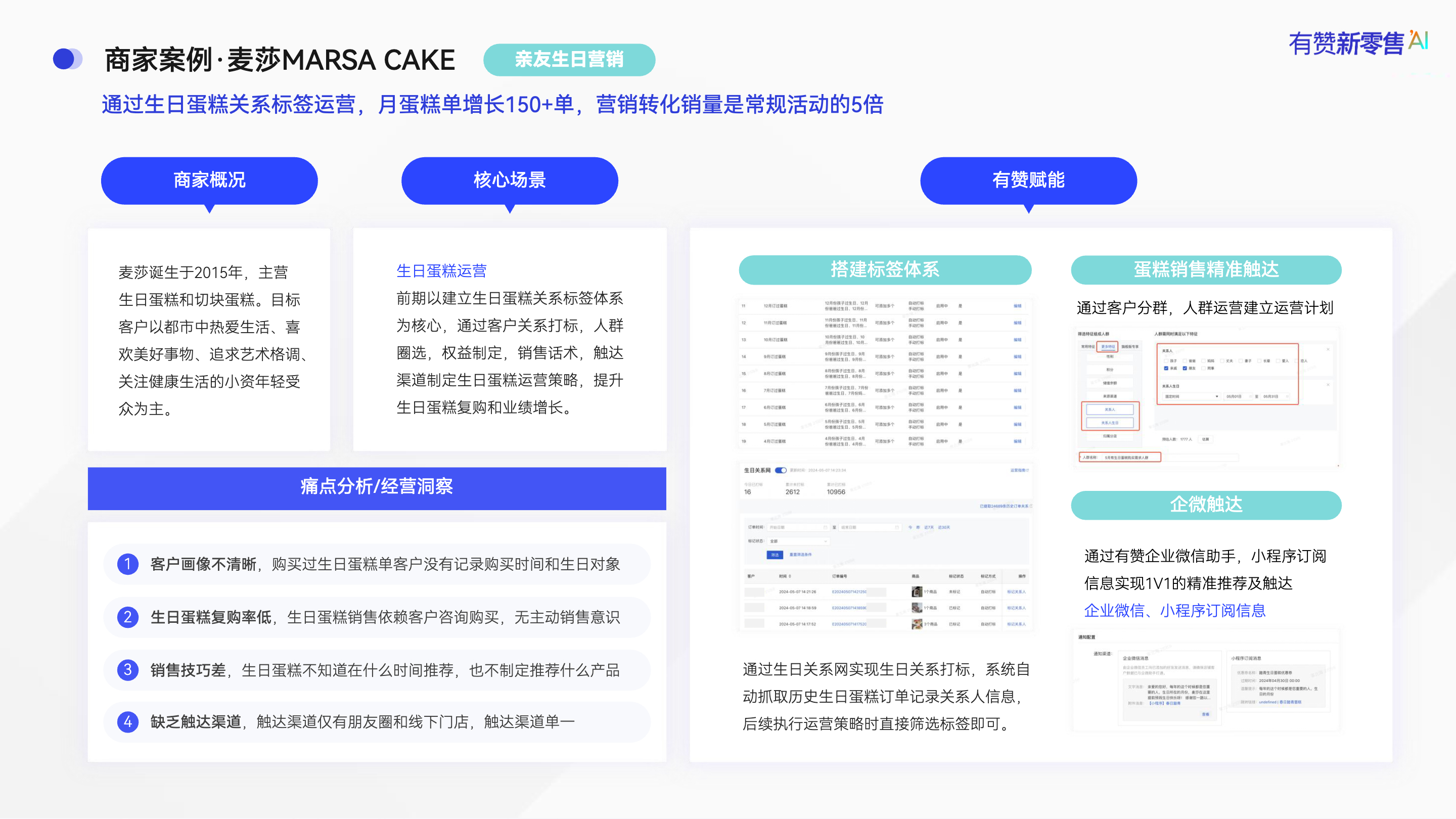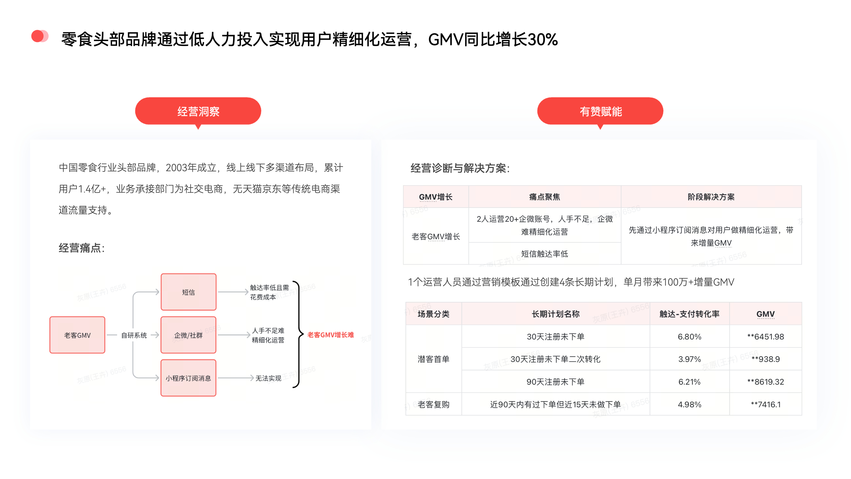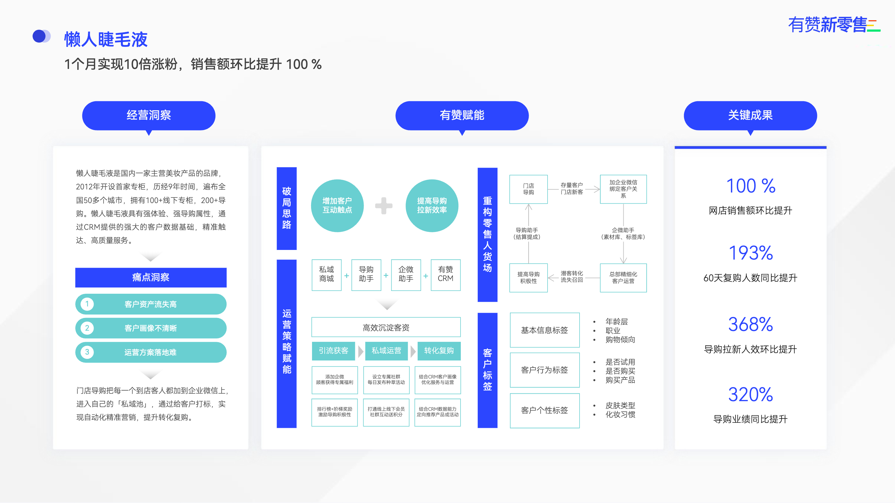 通过微商城客户Pro、门店客户Pro、有赞客户运营系统(CRM)经营客户,帮助你做好社交媒体、导购企业微信、门店、集团连锁和总部运营管理,实现智能化客户运营,让营销和销售强劲增长30%~1000%以上。 我们整理了有赞内部精华案例14个,用关键运营动作、优质客户管理手段、精准营销工具、智能化运营系统,深度拆解生意经营细节,帮助商家做更好的生意增长。