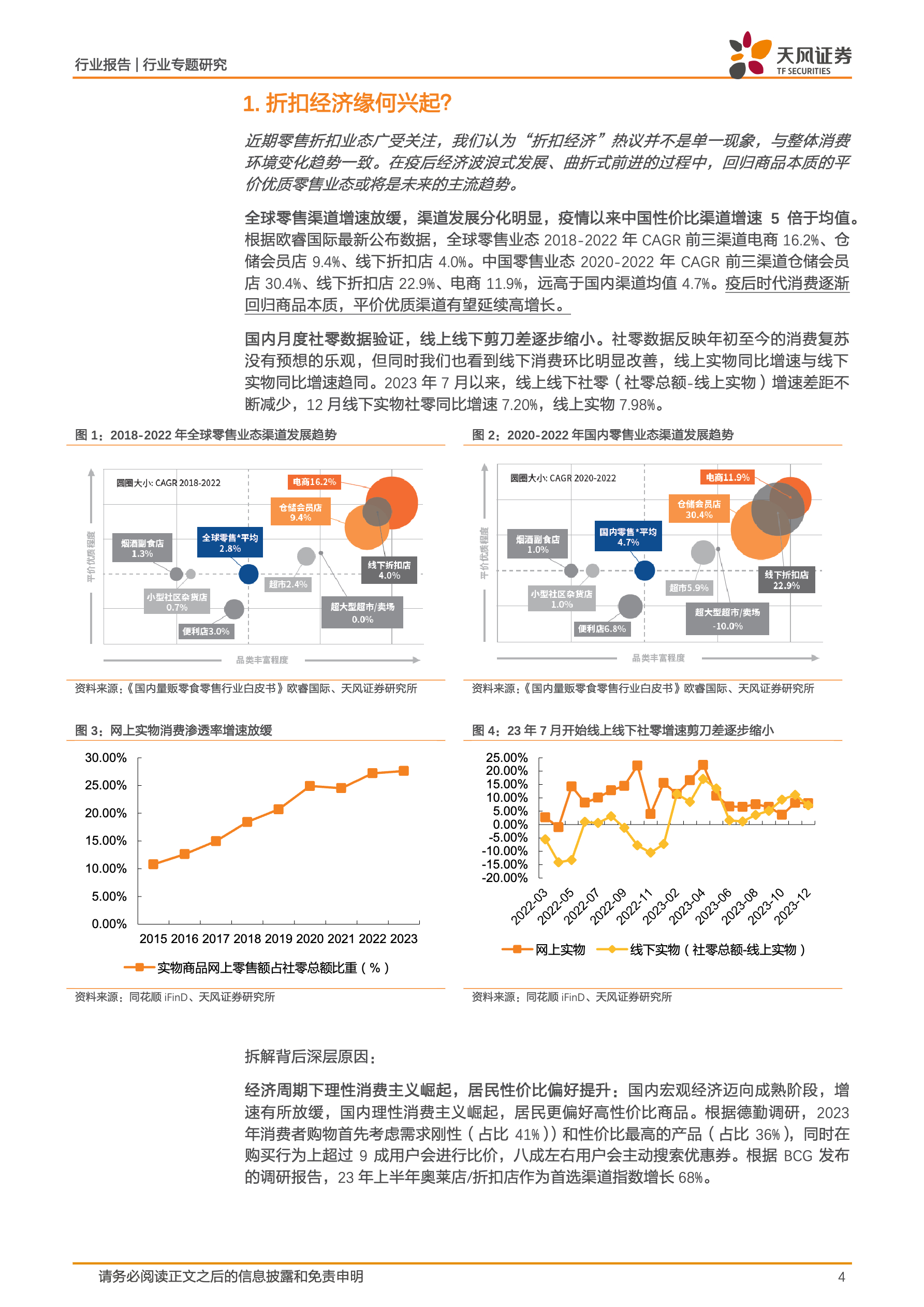 目前国内折扣经济浪潮下,我们发现: ①国内软折扣模式受益于疫情尾货增长的时代背景快速兴起,发展至今面临尾货供应渠道分散、门店毛利率受尾货影响波动大等挑战,赛道正在自我变革; ②量贩零食作为零售折扣行业最先跑的业态,在某些维度已经有了硬折扣的雏形。资本关注度高,行业竞争相对充分,新进入者大量涌现,后期长尾品牌出清、行 业格局有望优化,龙头优势或将进一步凸显。 ③硬折扣零售在国内市场方兴未艾,参考海外成熟代表,硬折扣模式具备穿越经济周期的能力,“高质低价”产品背后是整个零售体系的系统性优化,优秀的企业能够在采购、物流、门店和总部各个环节都做到极致成本压缩、效率优化。 折扣零售经济发展如何?未来趋势如何?查看完整报告了解更多信息~