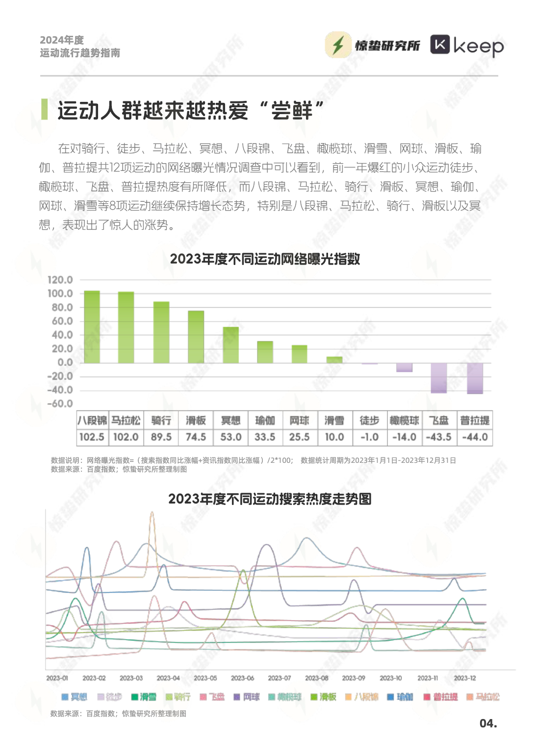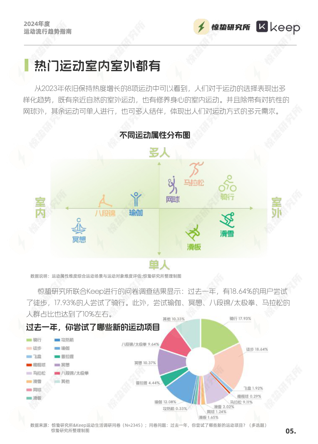 2023年,伴随着经济持续复苏,运动再次成为日常生活的核心话题之一。 相比前一年小众运动在受限的城市生活、有限的运动空间下的流行,人们在2023年不仅更加关注身心健康,还更期待通过亲近自然的运动方式,同时满足社交、潮流消费方面的需求。 调研发现,兴趣驱动、户外运动爆发、运动与社交融合、追求精神价值、运动需求专业化,成为运动市场新的流行趋势。本报告旨在围绕流行新趋势为各方提供挖掘未来市场新增长的见解和机遇,希望能帮助到有需要的你。